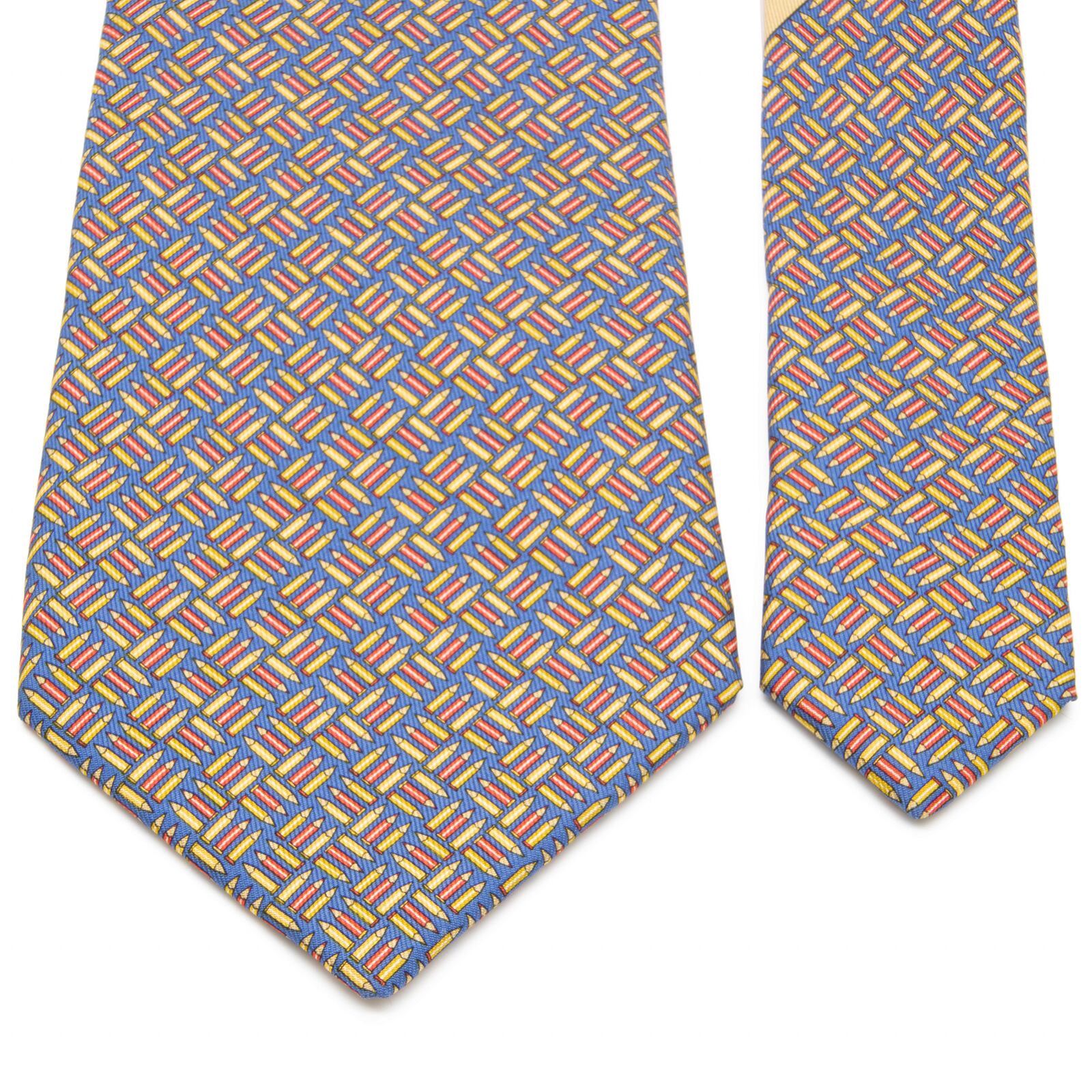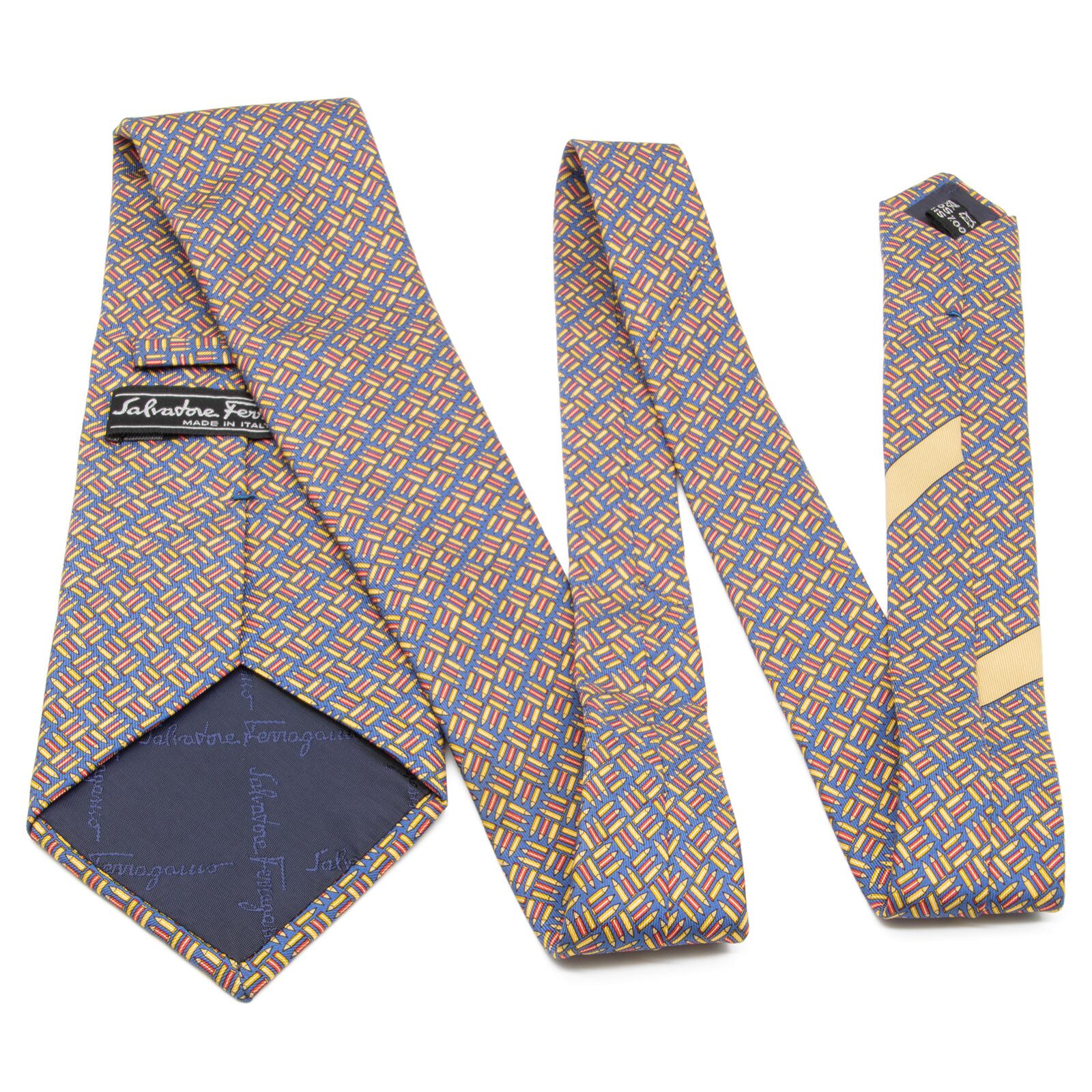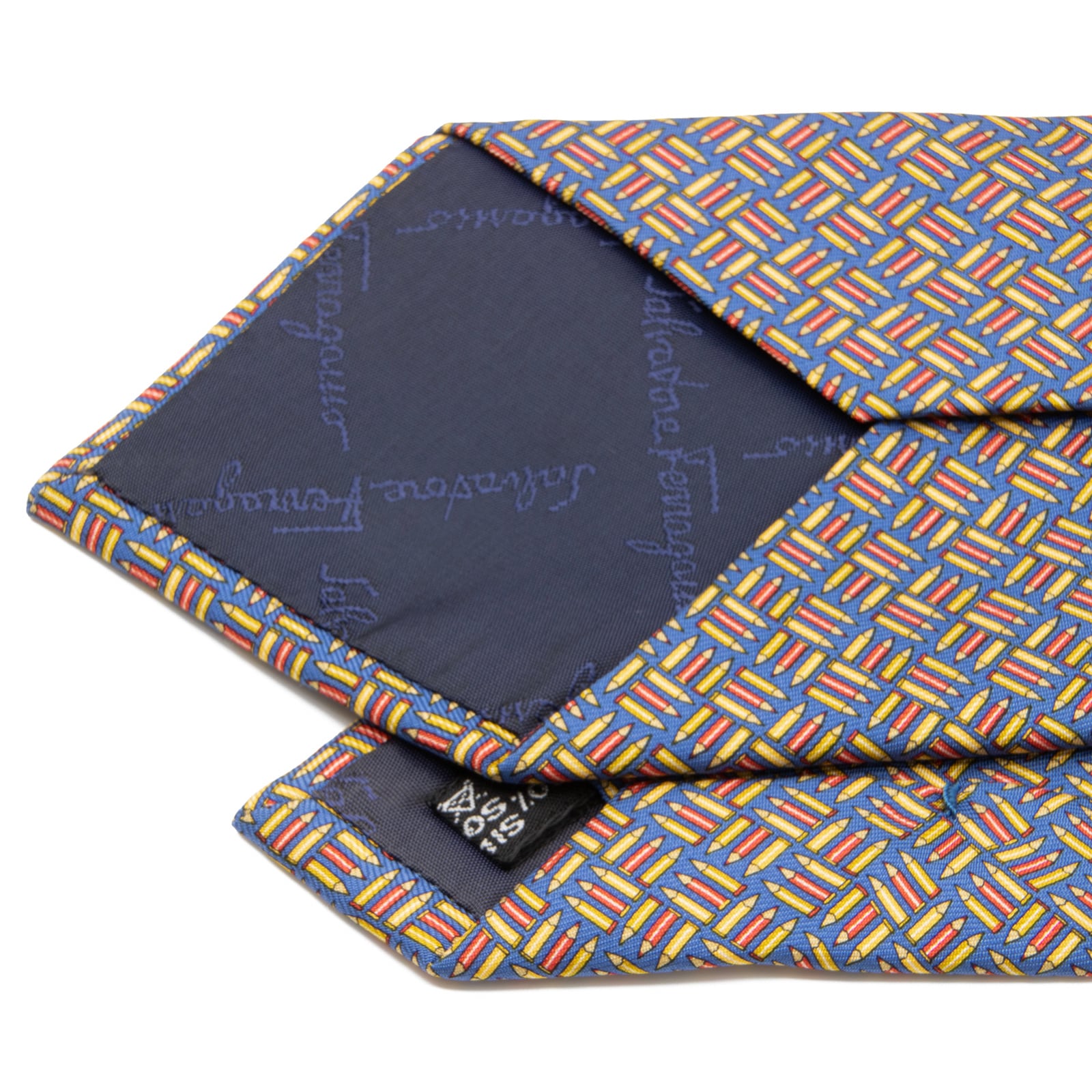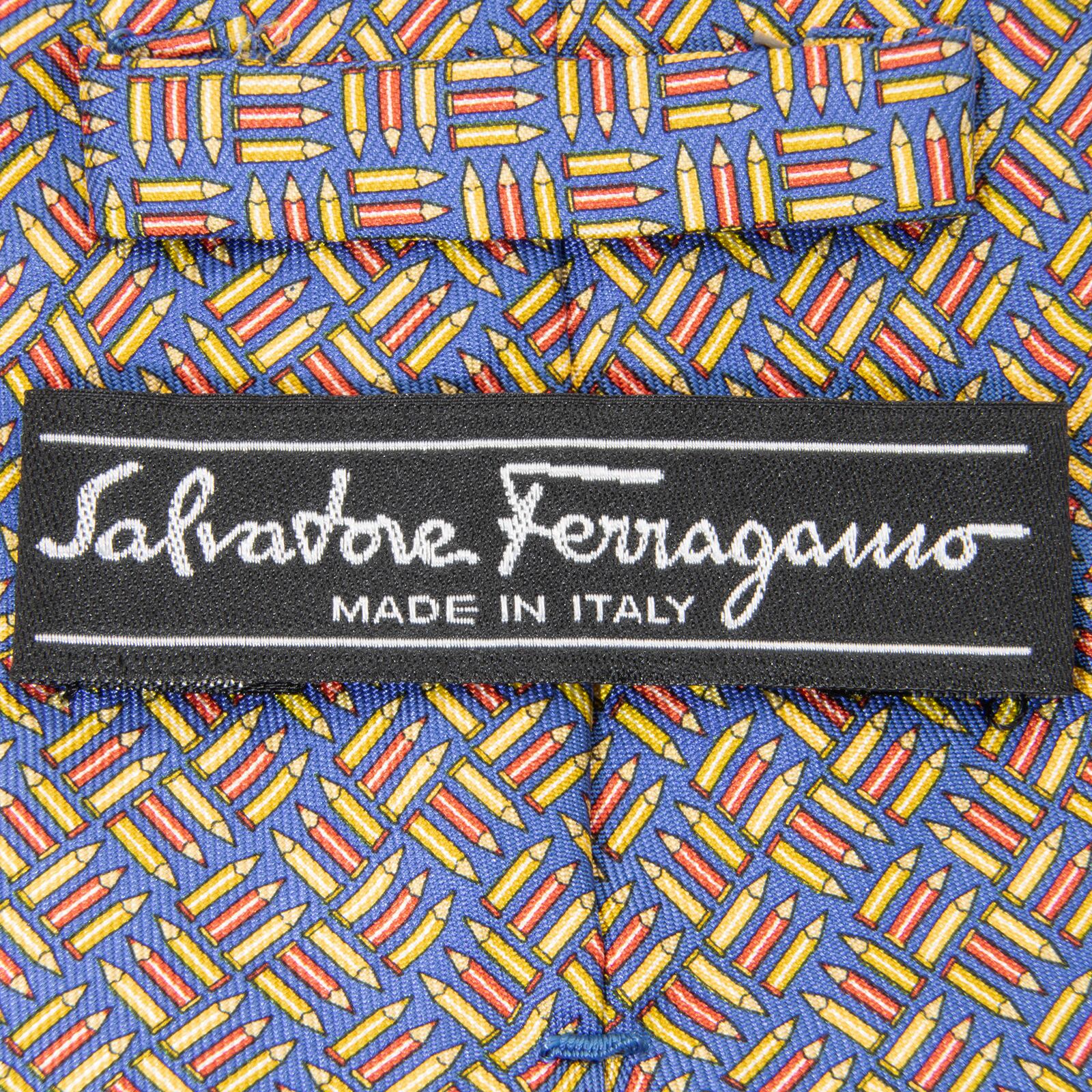 送料無料 フェラガモ ネクタイ 新品 ブルー イエロー レッド カジュアル 珍しい 鉛筆 ペンシル 総柄 ロゴ おしゃれ イタリア製 綺麗 N565