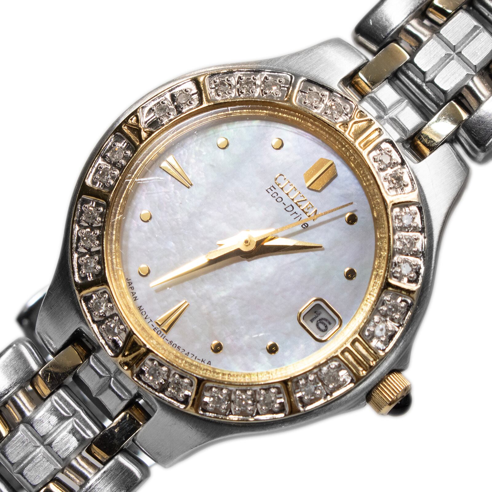 特徴:珍しい・エコドライブ・ダイヤモンドベゼル・コンビカラー・白蝶貝・シェル盤・ロゴ・ブランド・人気・おしゃれ