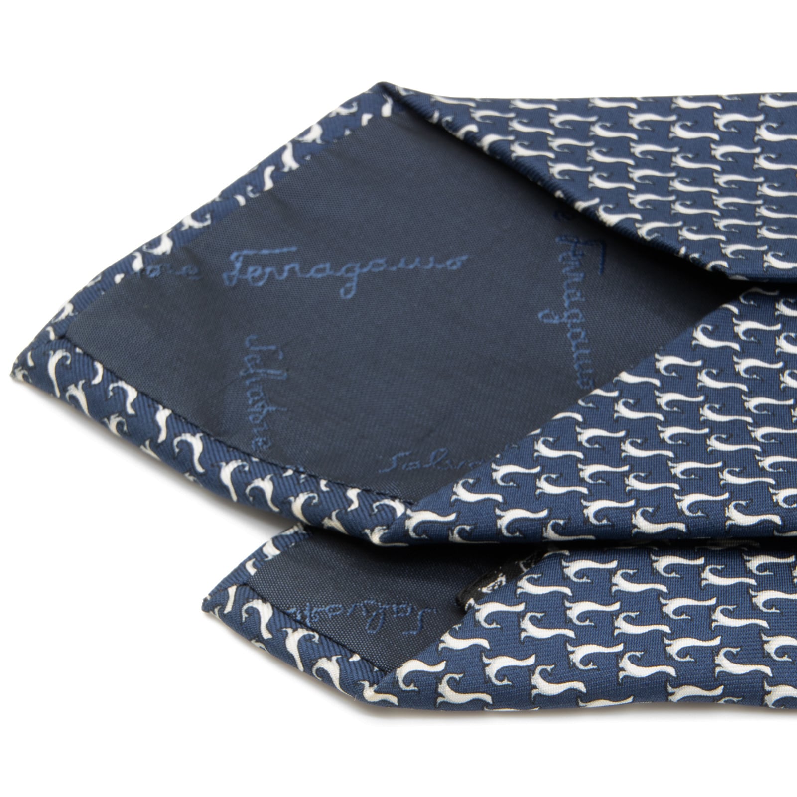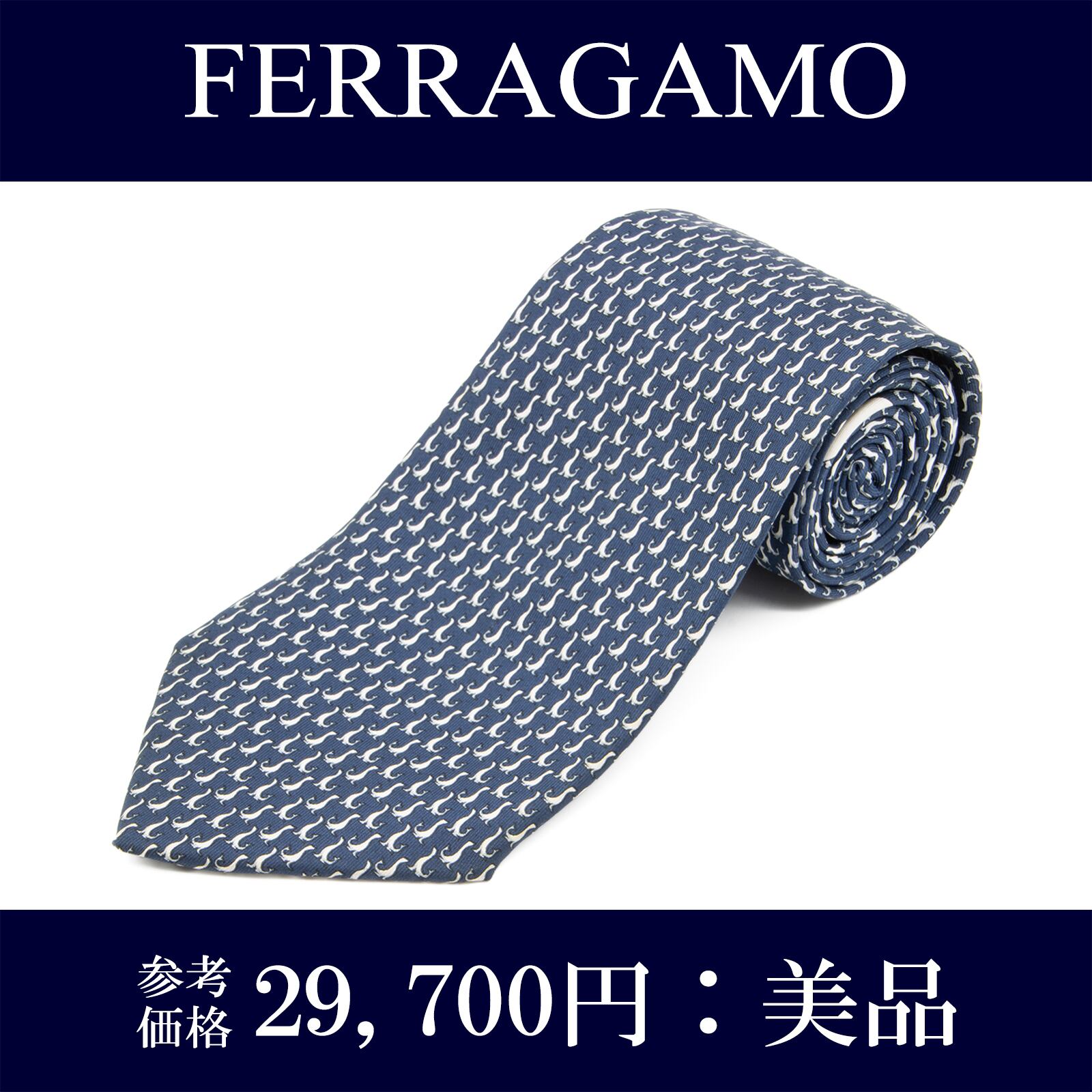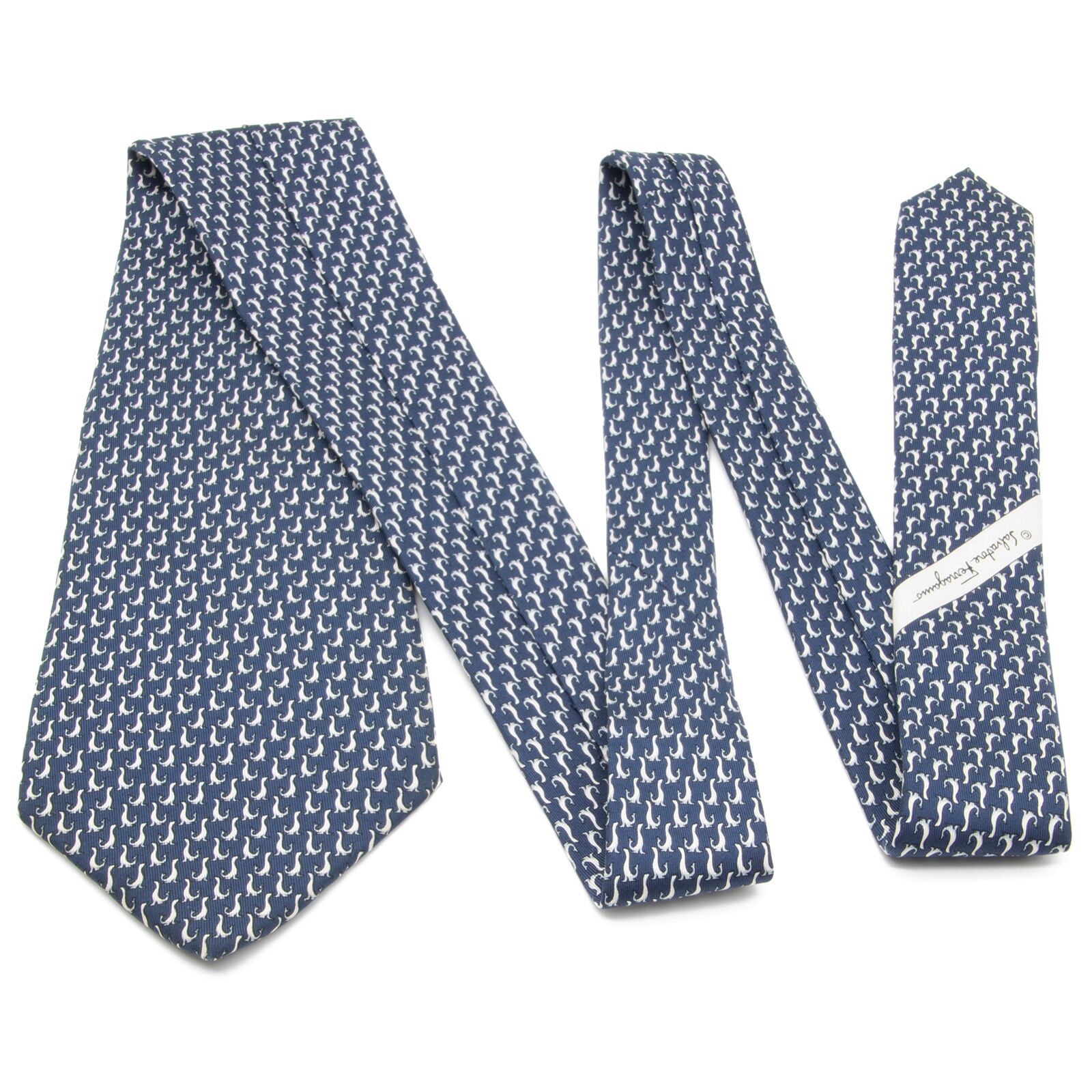 送料無料 フェラガモ ネクタイ シルク 青 ネイビーブルー 白 珍しい 動物 アニマル アシカ 総柄 かわいい ブランド イタリア製 綺麗 N370