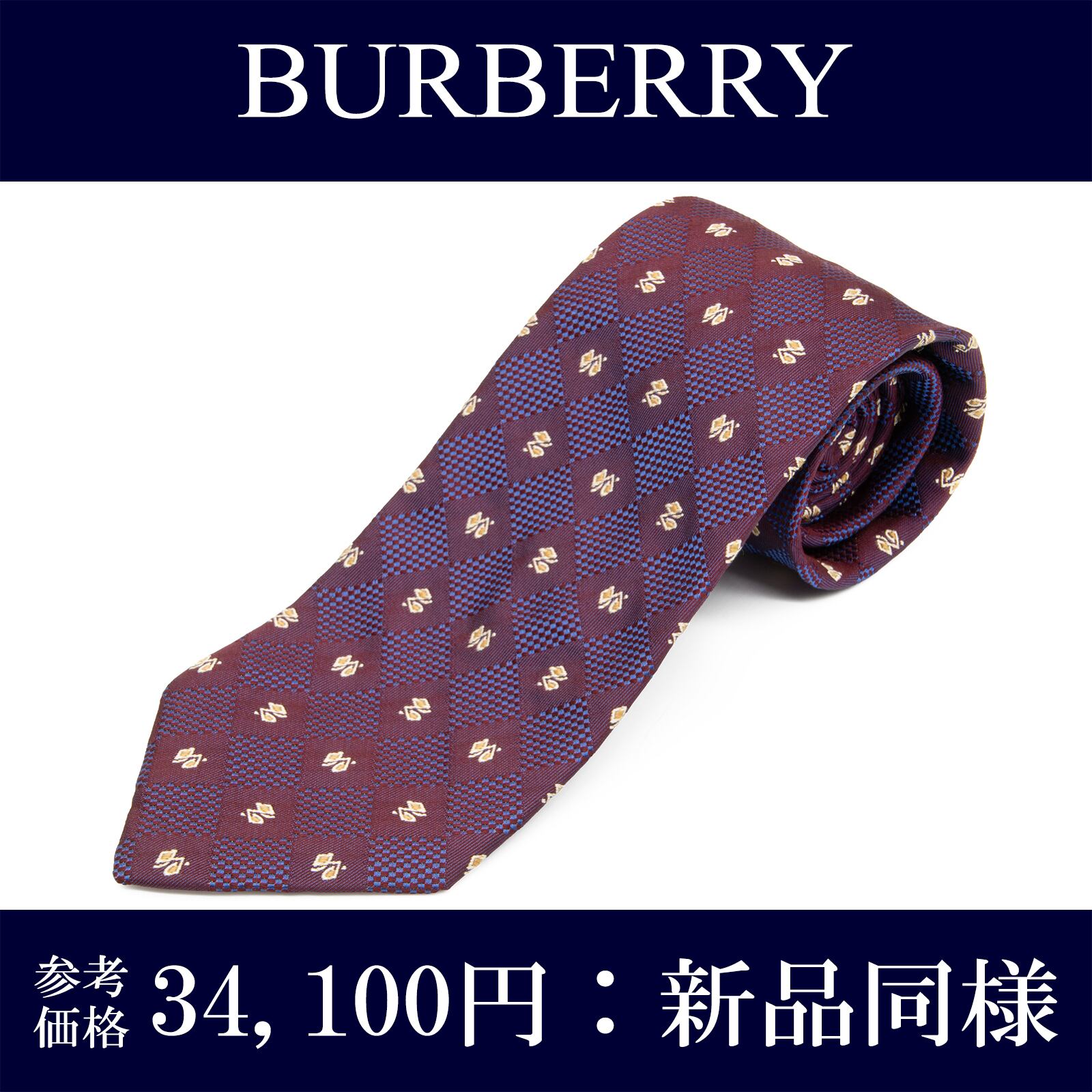送料無料 バーバリー ネクタイ ジャガード 新品同様 シルク 赤紫 バーガンディー ネイビーブルー アイボリー 四角 マーク 光沢 綺麗 N914