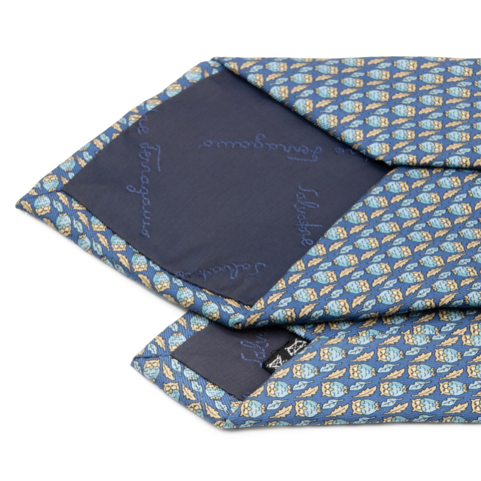 送料無料 フェラガモ ネクタイ 新品同様 シルク 青 水色 ベージュ カジュアル 動物 アニマル フクロウ ブランド おしゃれ イタリア製 N827