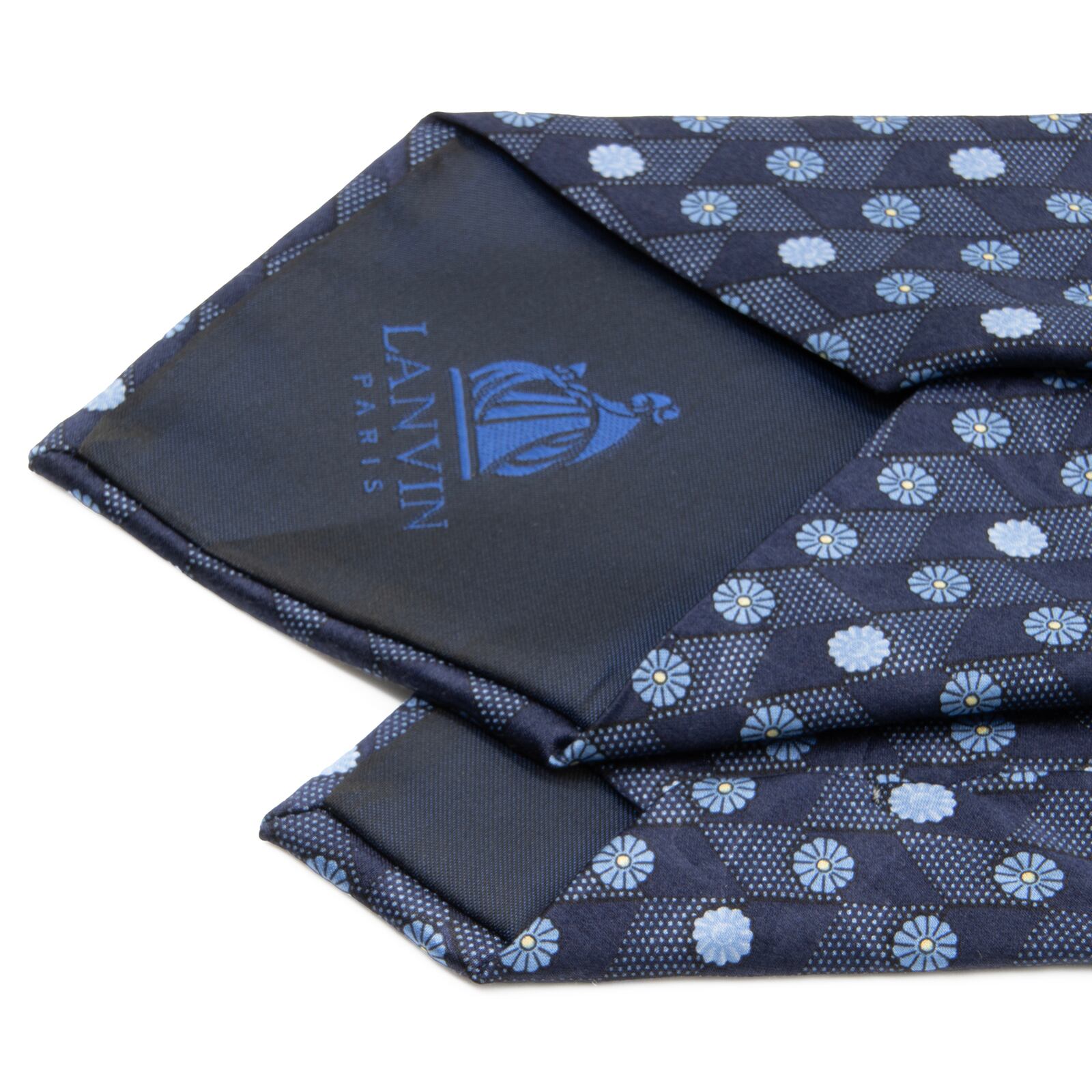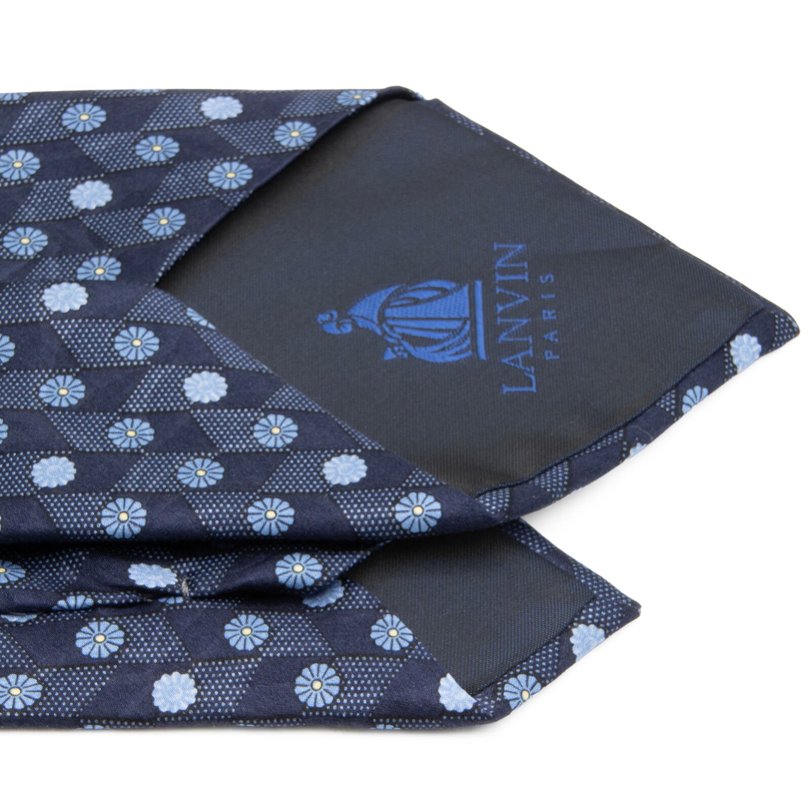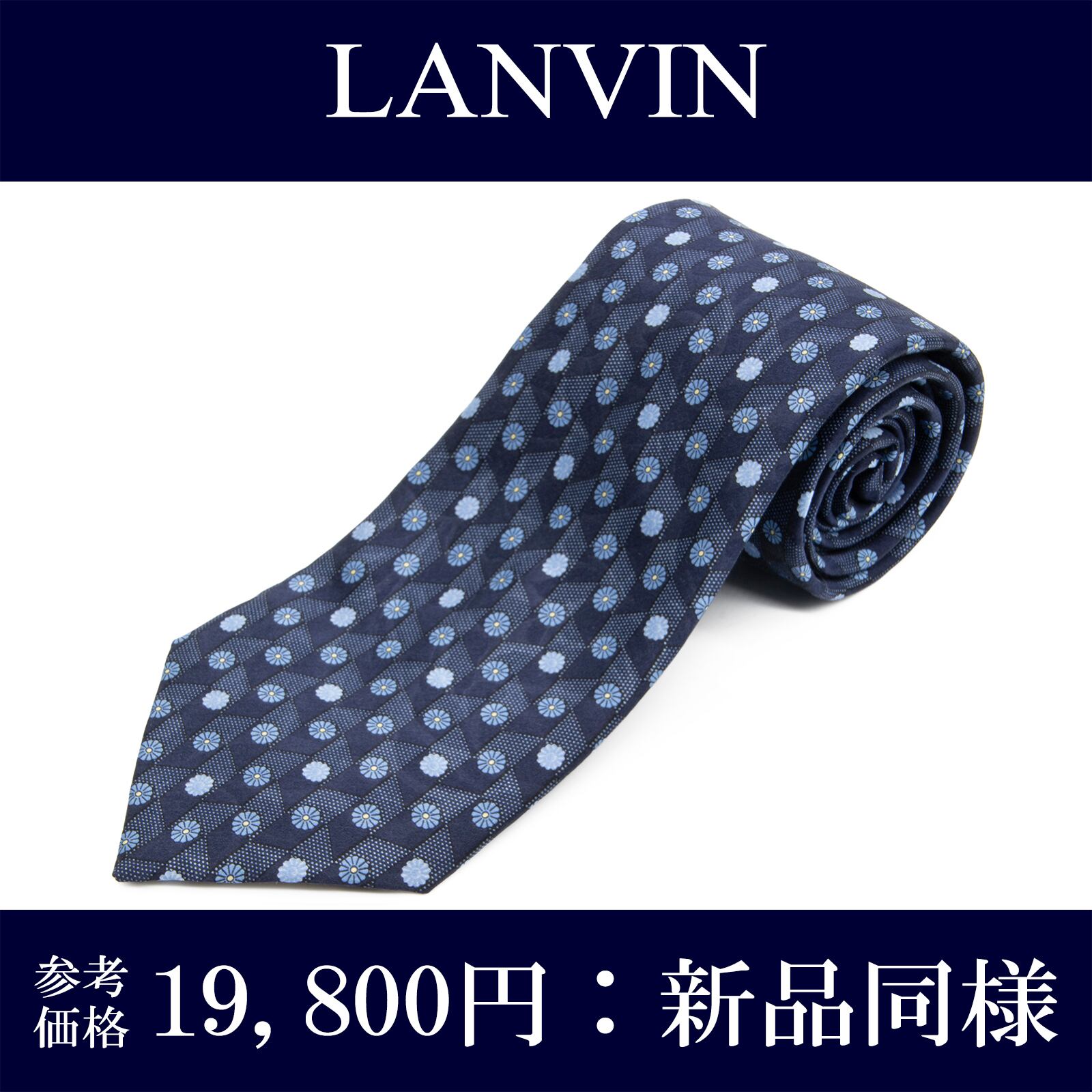 送料無料 ランバン ネクタイ 新品同様 シルク ネイビーブルー 水色 黄色 ビジネス 花 フラワー 菊 四角 マーク ブランド フランス製 N836