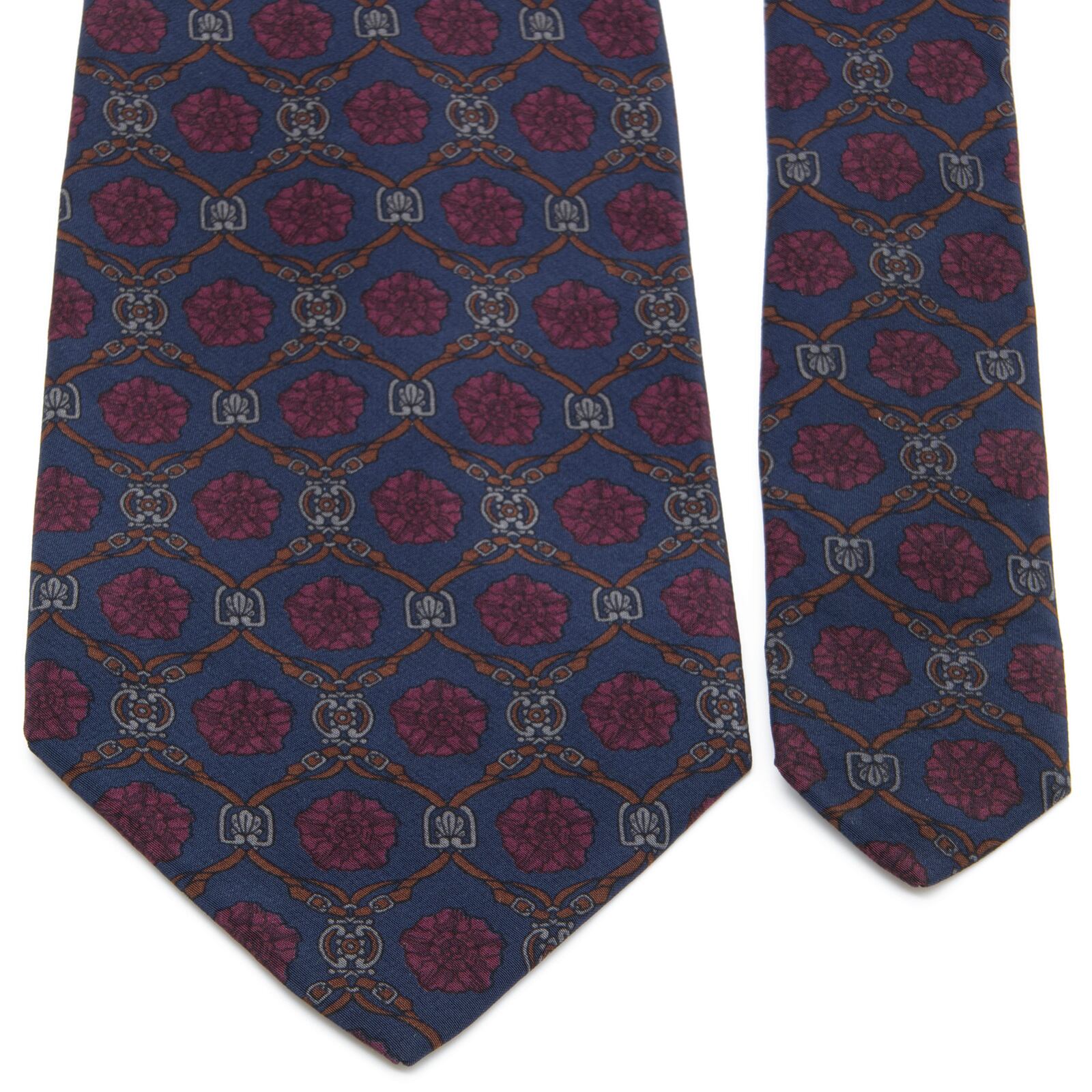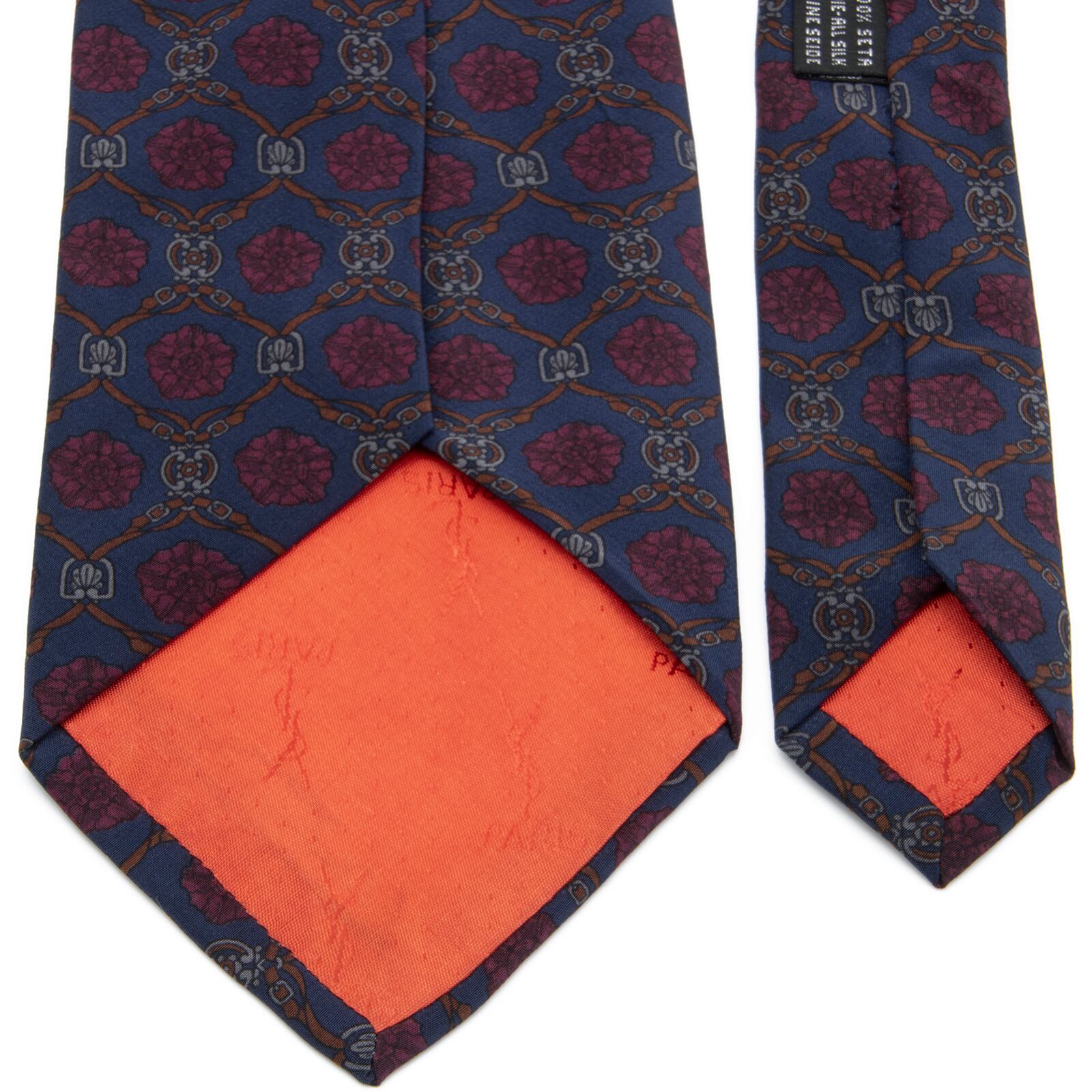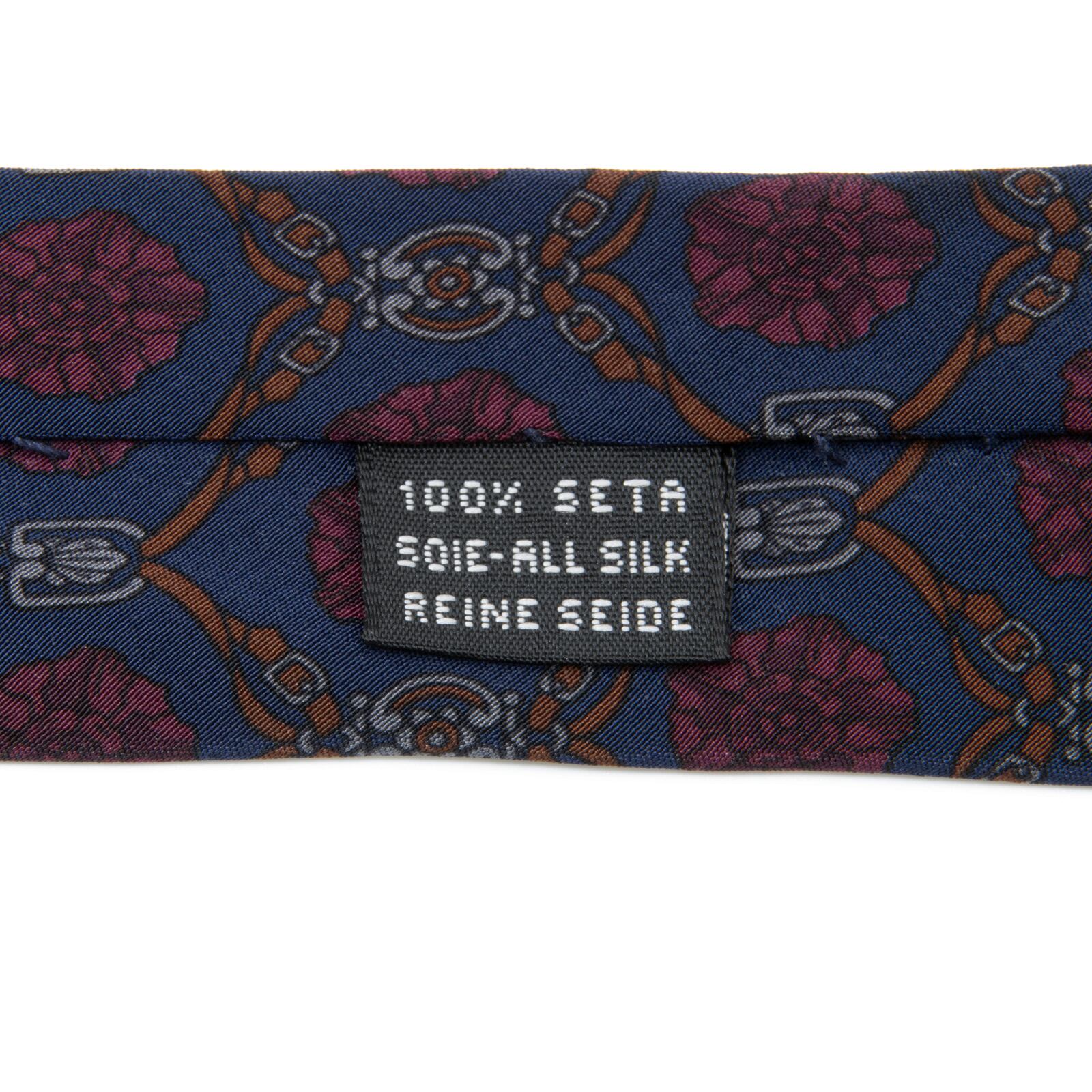 送料無料 サンローラン ネクタイ レギュラータイ 新品同様 シルク ネイビーブルー バーガンディー 茶色 花 革ベルト 紋様 イタリア製 N994