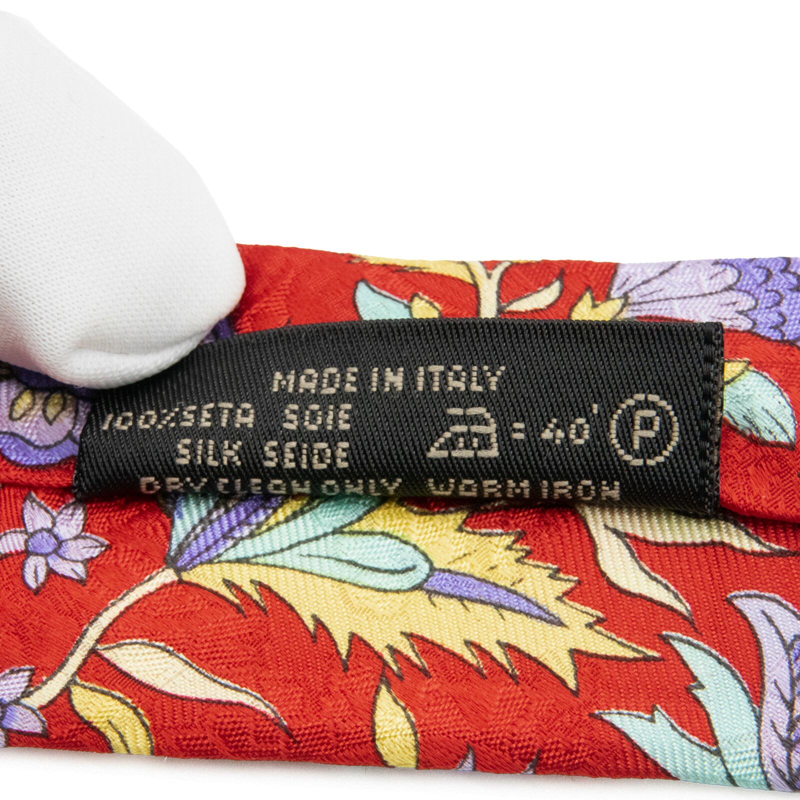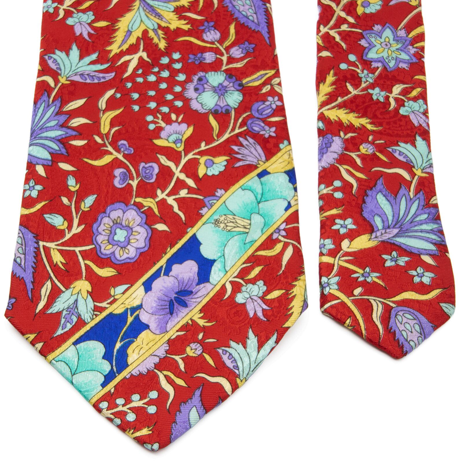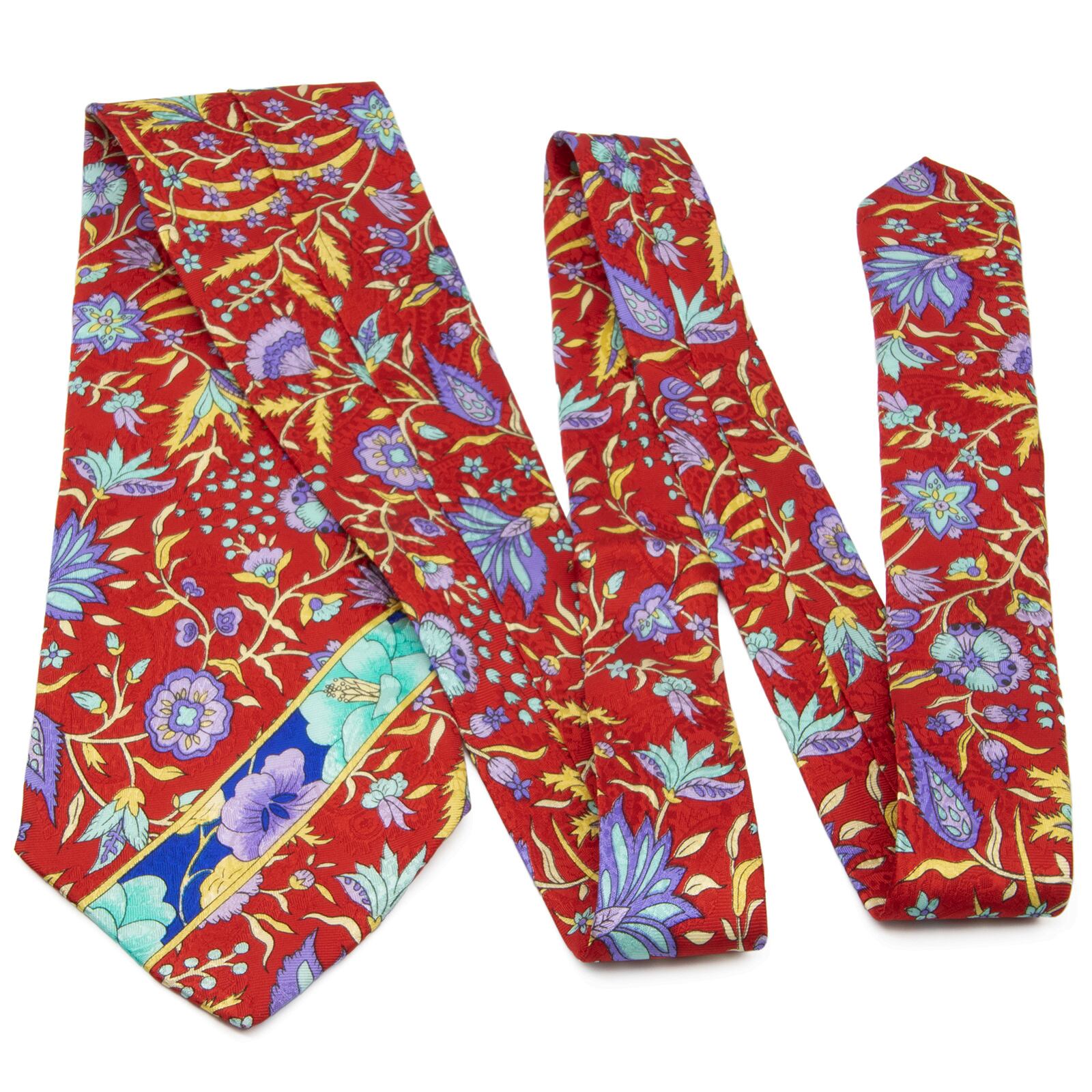 こちらのネクタイは、鮮やかなレッドを基調に、イエローやパープル、青緑色が織りなす花とペイズリーの総柄で、まさに芸術品のような一本です。