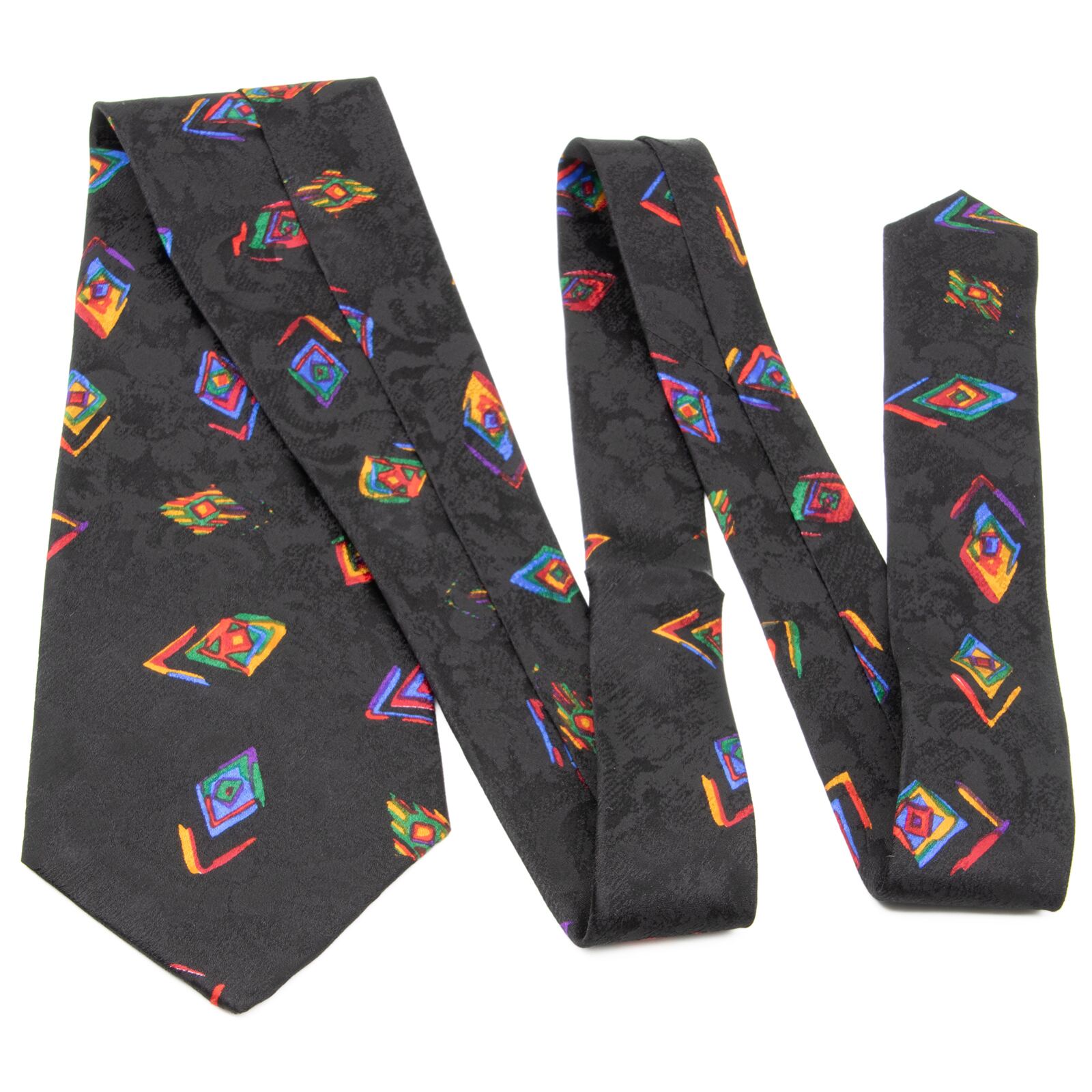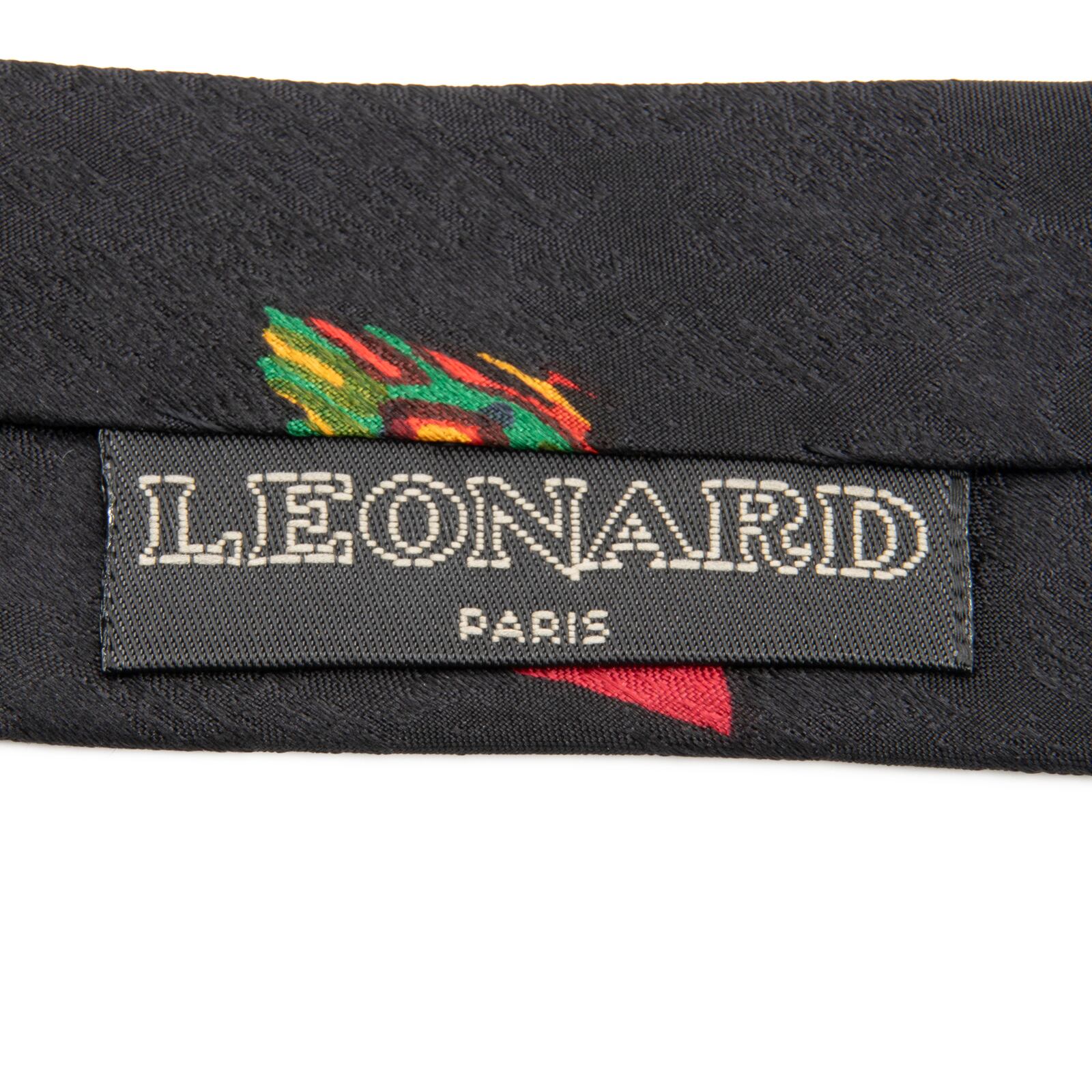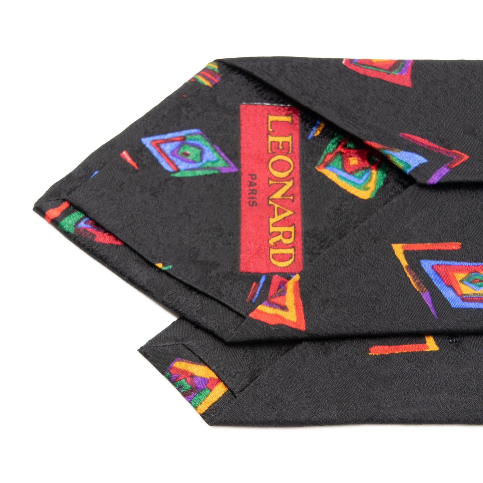 胸元に差をつける、レオナールのレギュラータイでございます。黒を基調としながらも、様々な色彩の幾何学模様が大胆に配置されており、見る人の目を惹きつけます。
