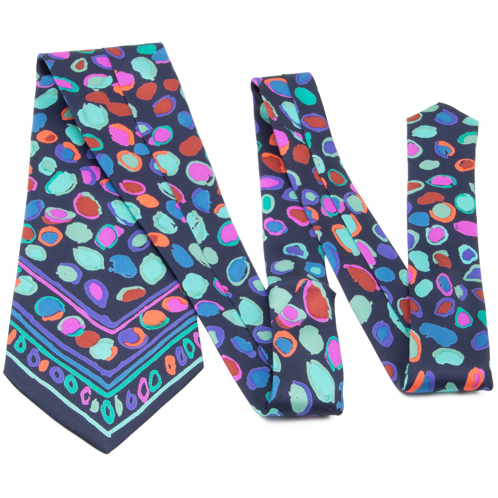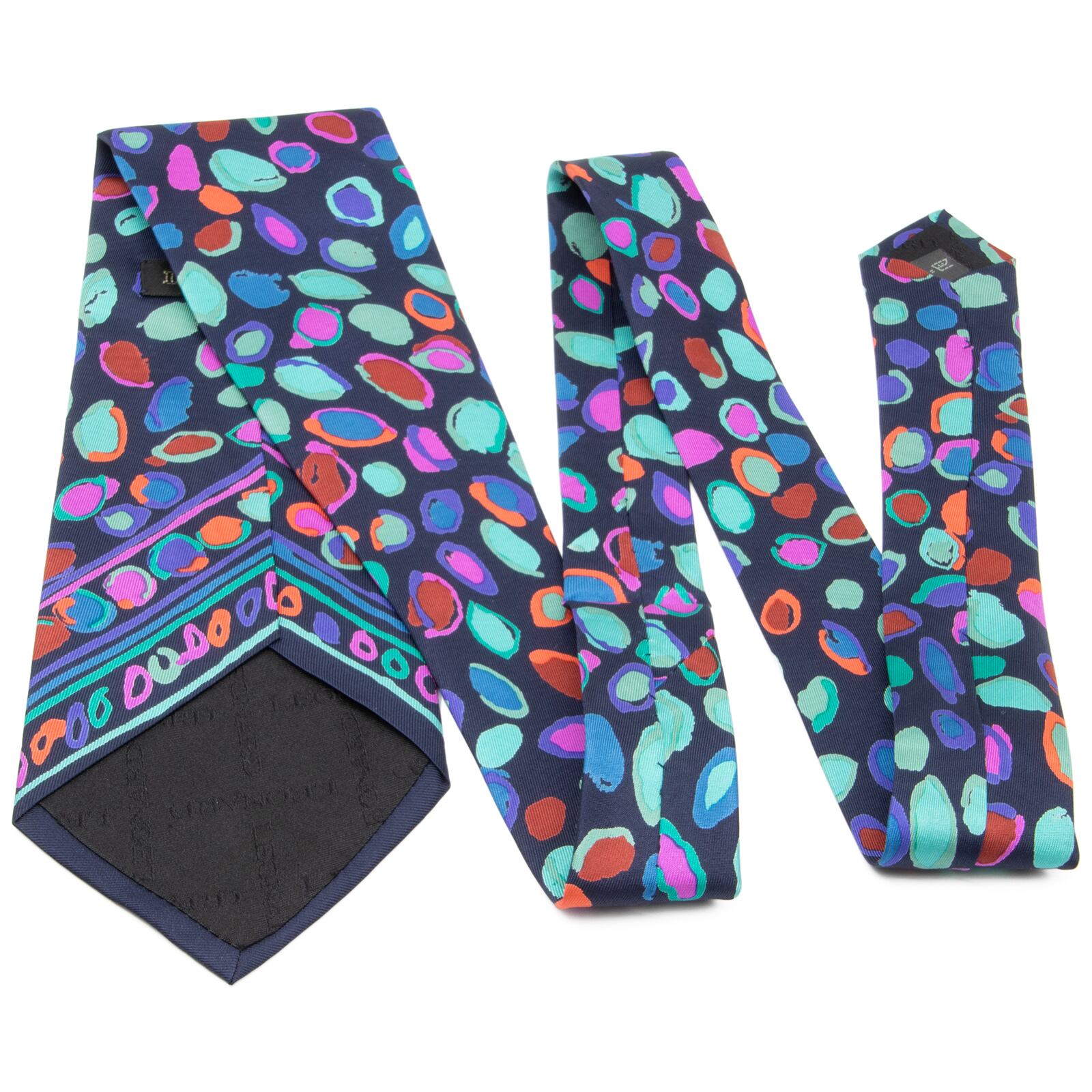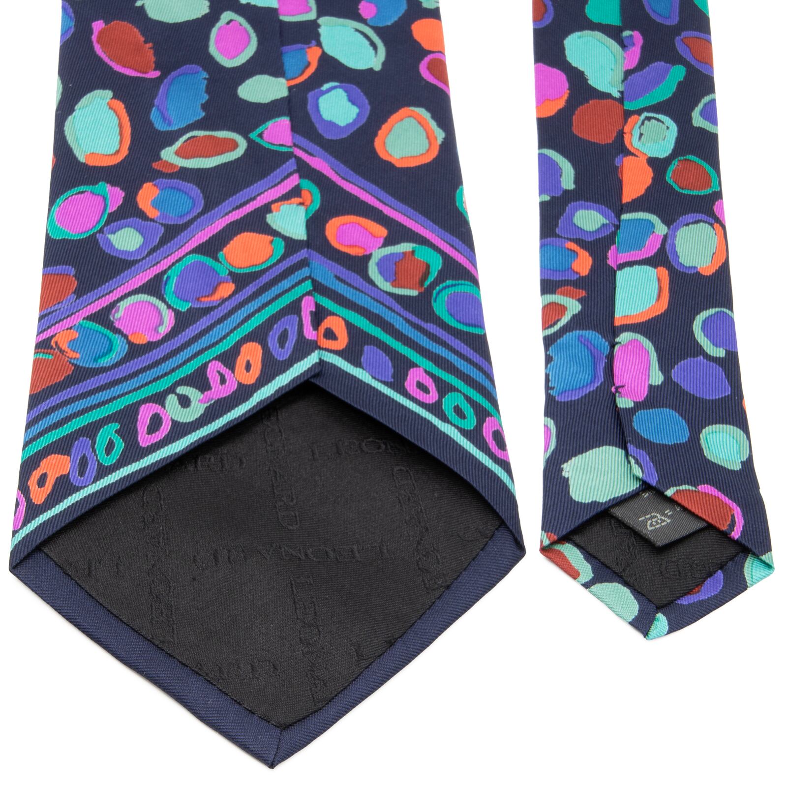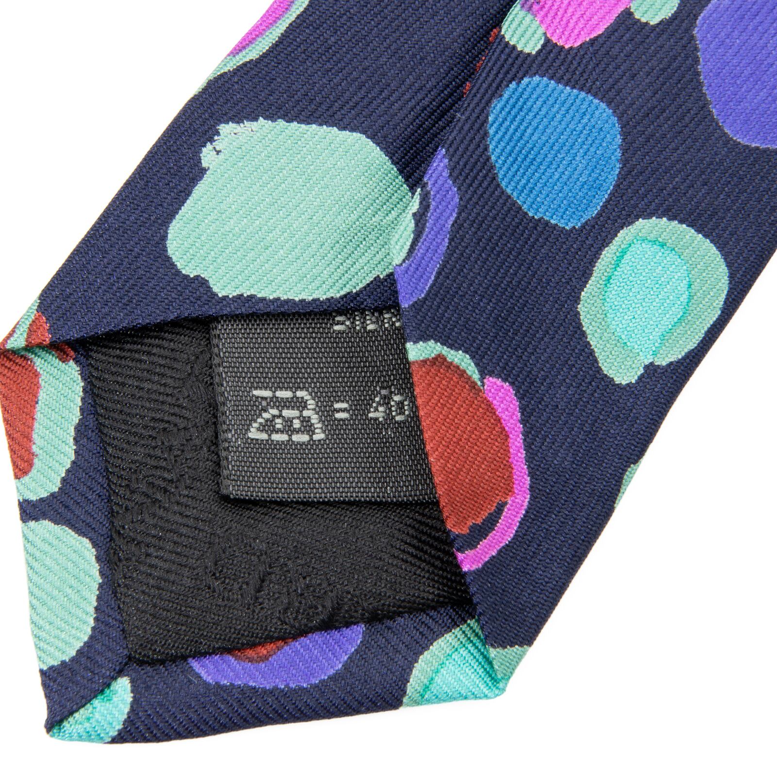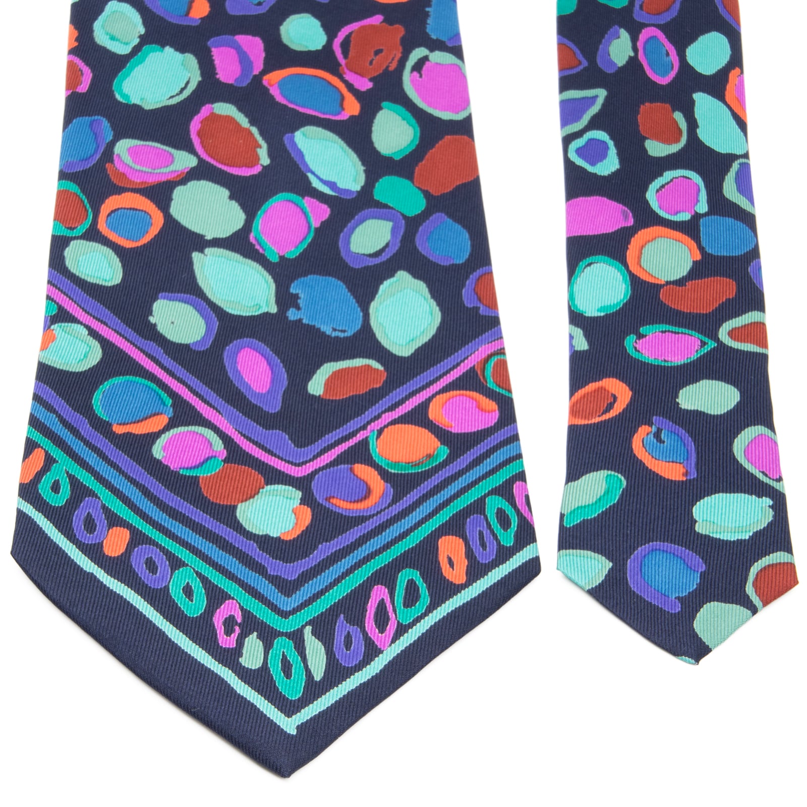 こちらのネクタイは、深みのあるネイビーブルーをベースに、水色、パープル、オレンジ、ブラウンなどの色彩豊かな丸い模様が散りばめられた総柄デザインは、遊び心と上品さを兼ね備えております。