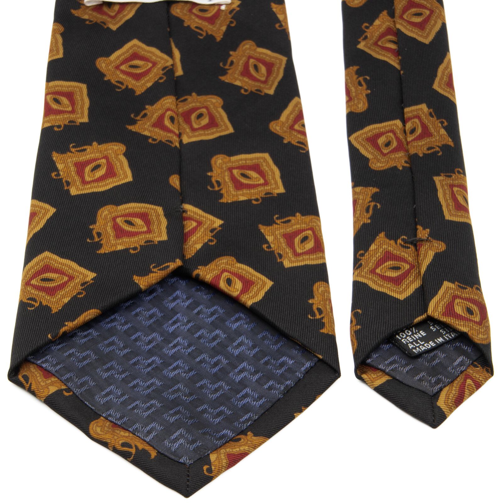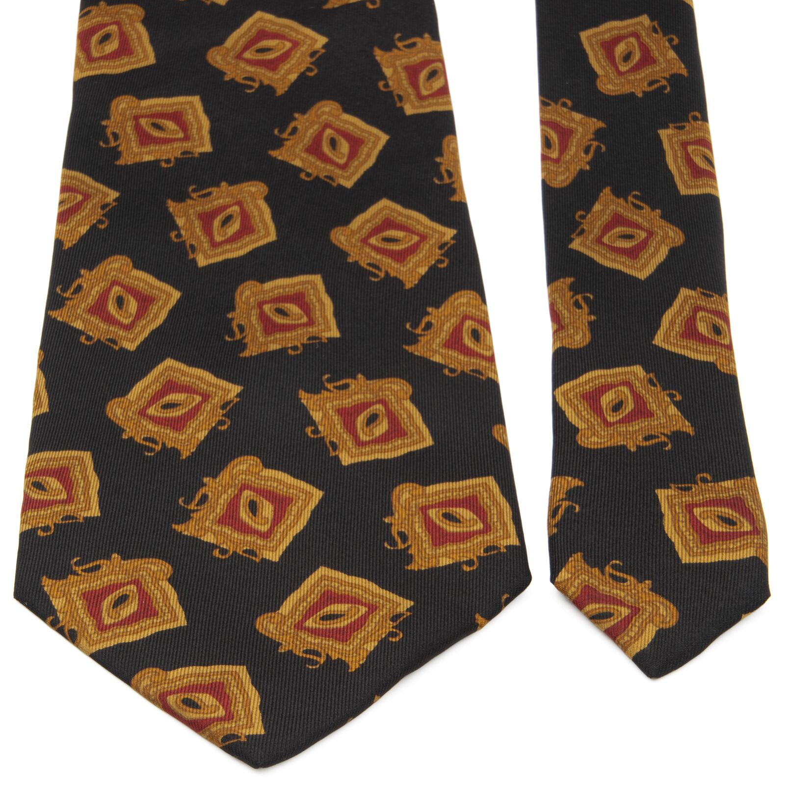 こちらのネクタイは、シックなブラックの地で、ブラウンとレッドを基調とした四角いマークが散りばめられた総柄デザインは、落ち着きの中に個性を光らせます。