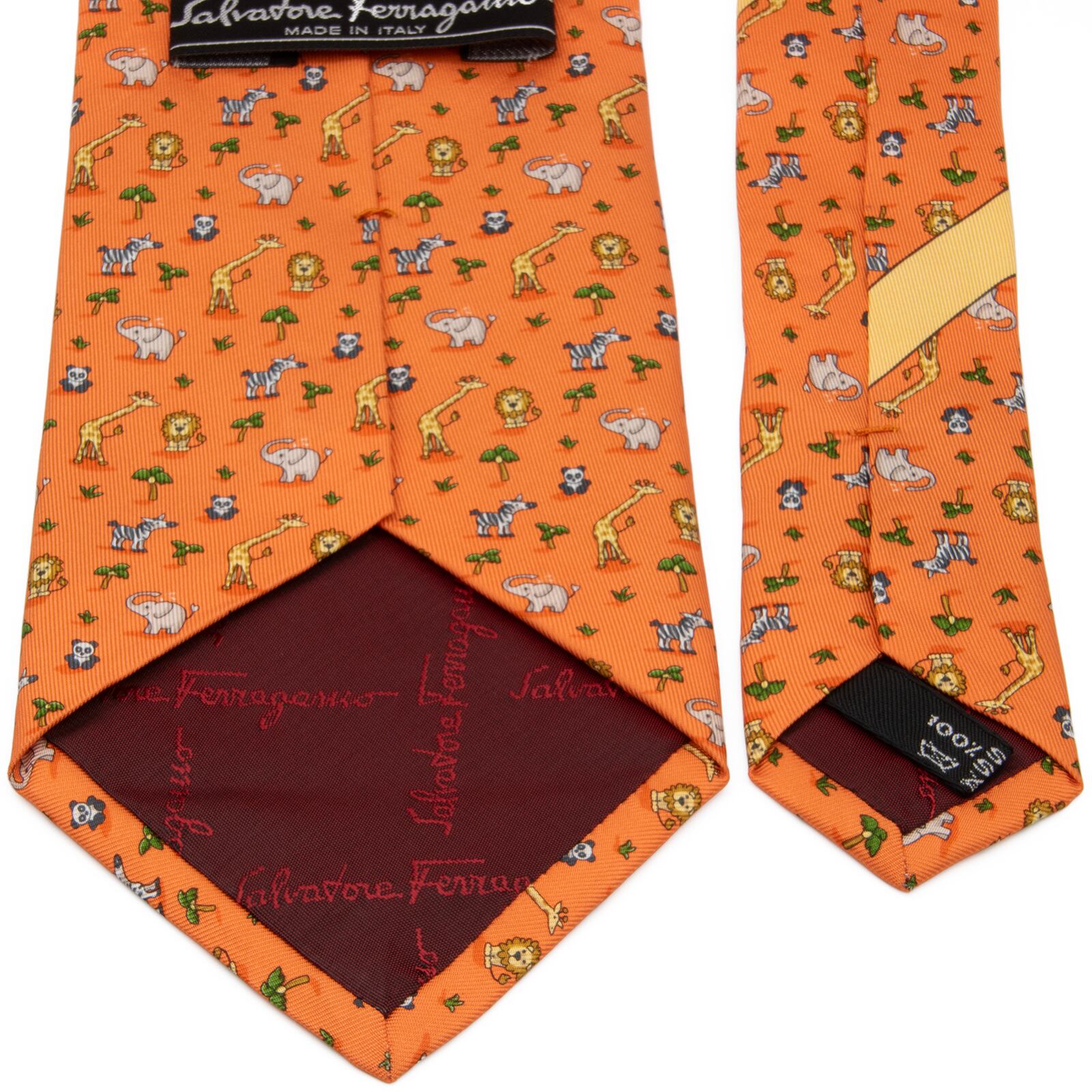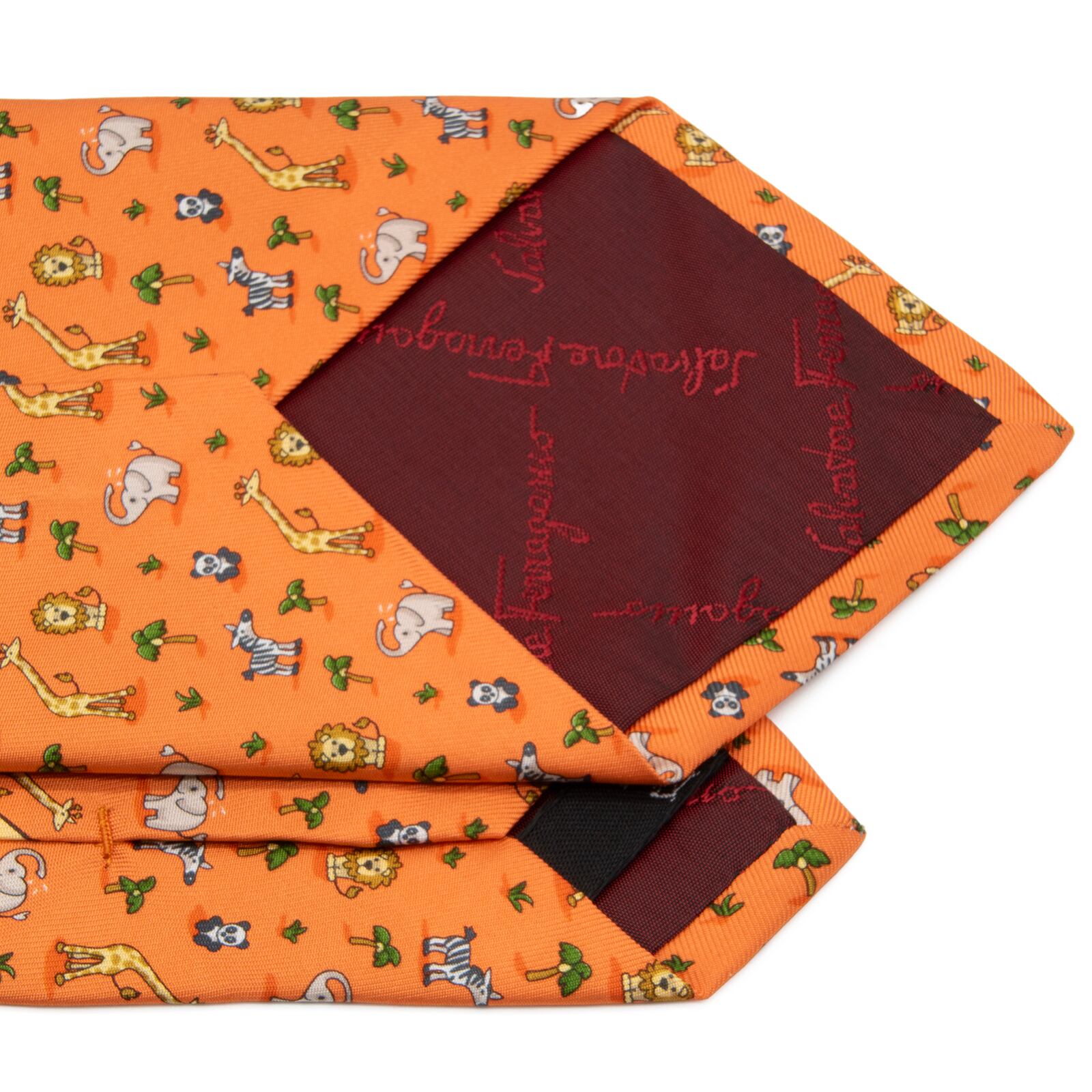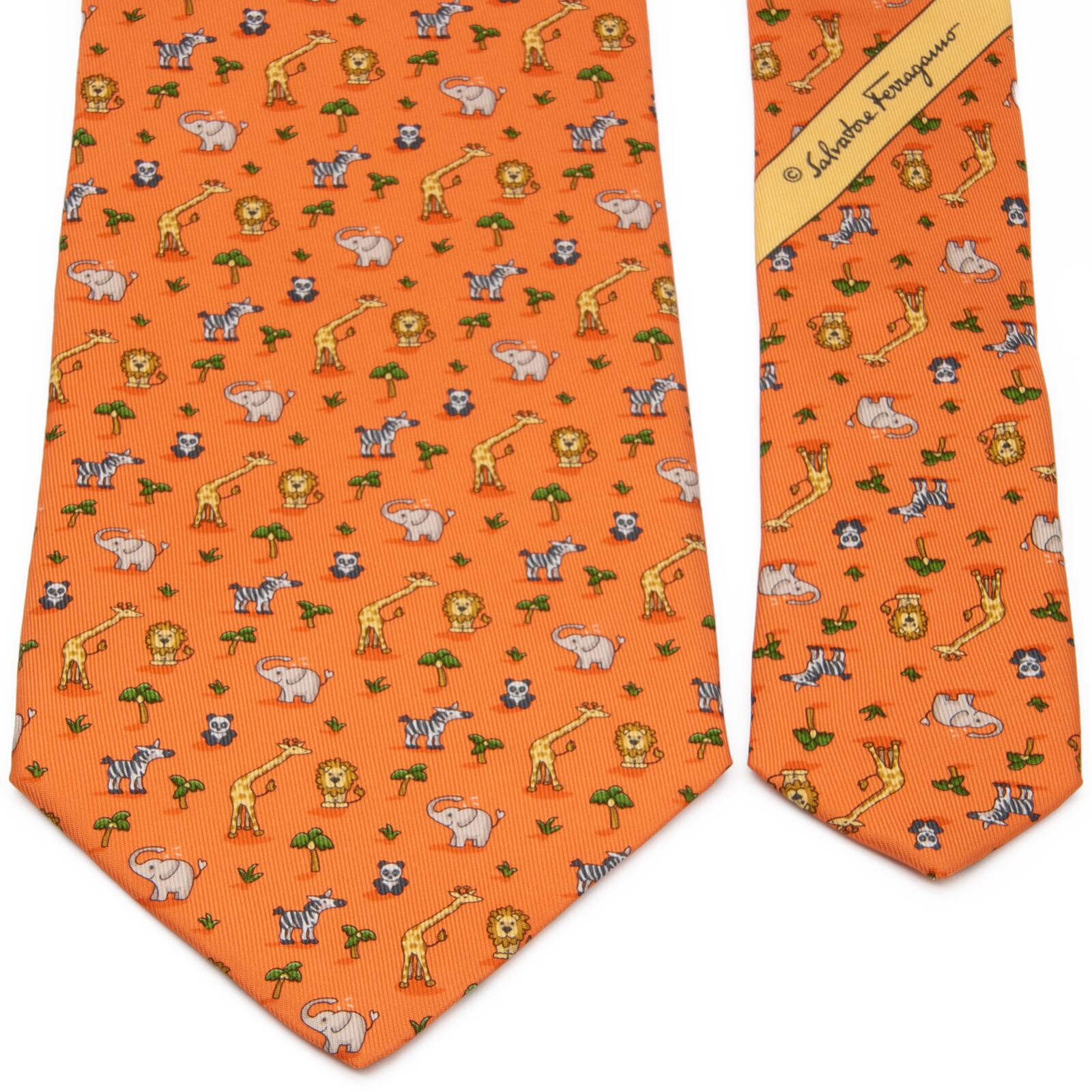 送料無料 フェラガモ ネクタイ 新品 シルク オレンジ 黄色 グレー 黒 緑 茶色 小紋 動物 ゾウ キリン パンダ ライオン 木 かわいい P126