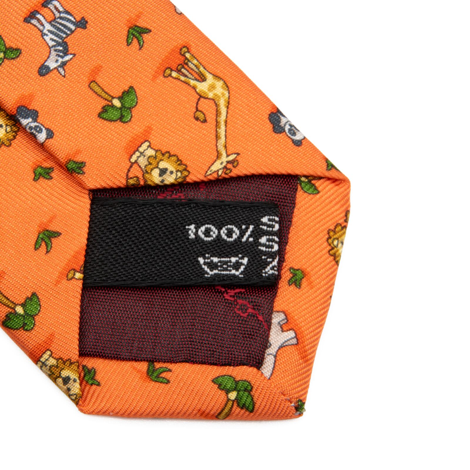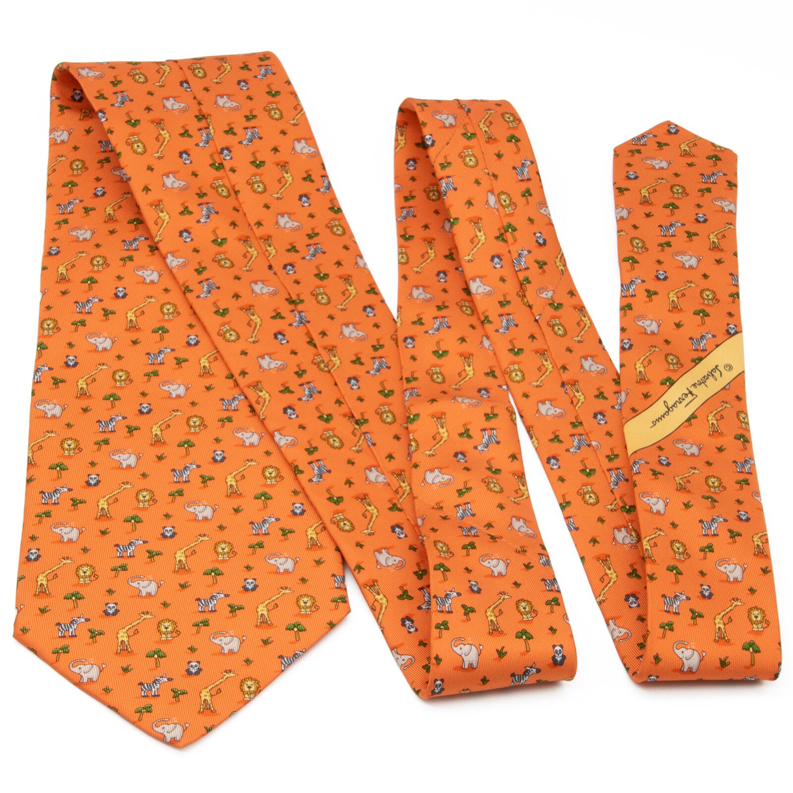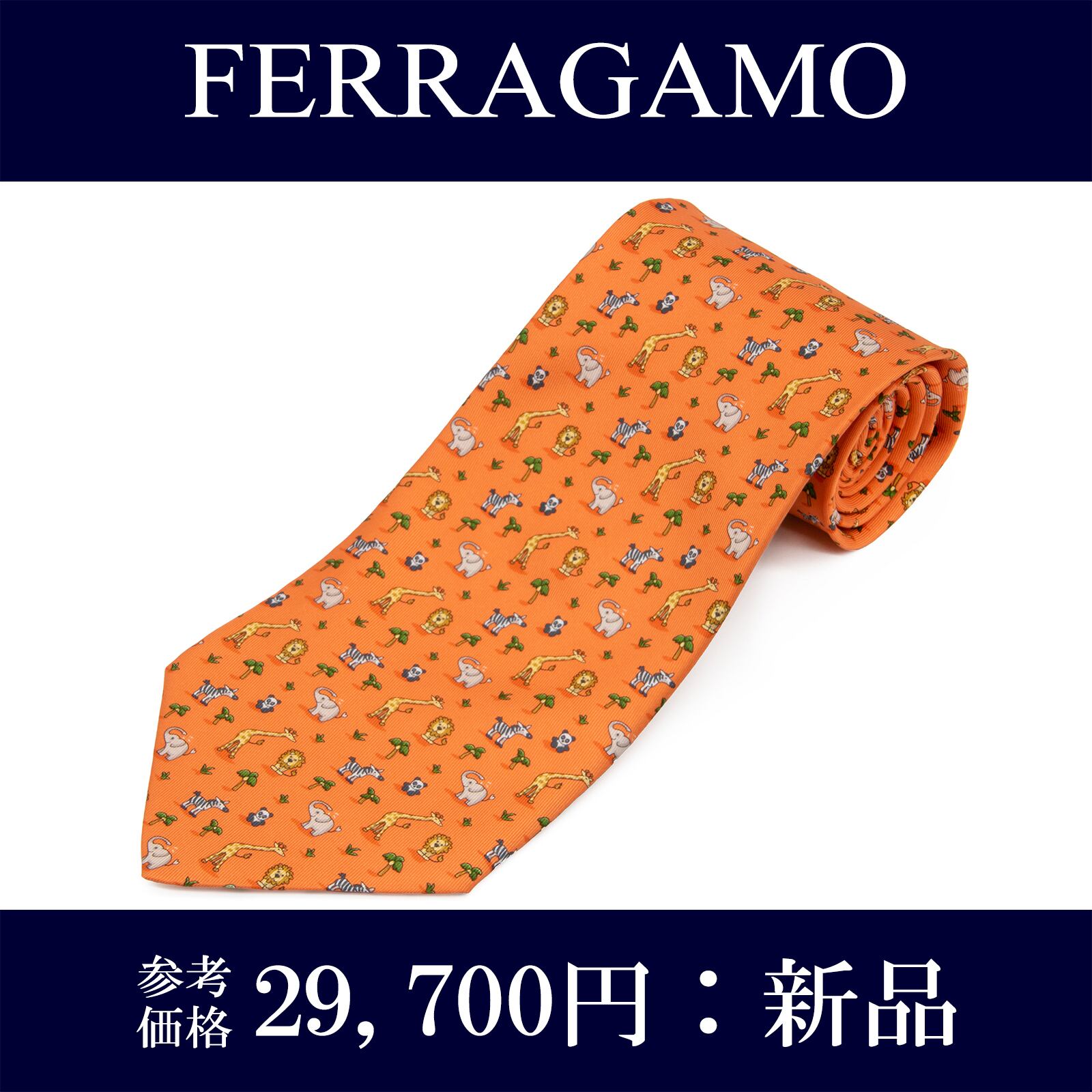 送料無料 フェラガモ ネクタイ 新品 シルク オレンジ 黄色 グレー 黒 緑 茶色 小紋 動物 ゾウ キリン パンダ ライオン 木 かわいい P126