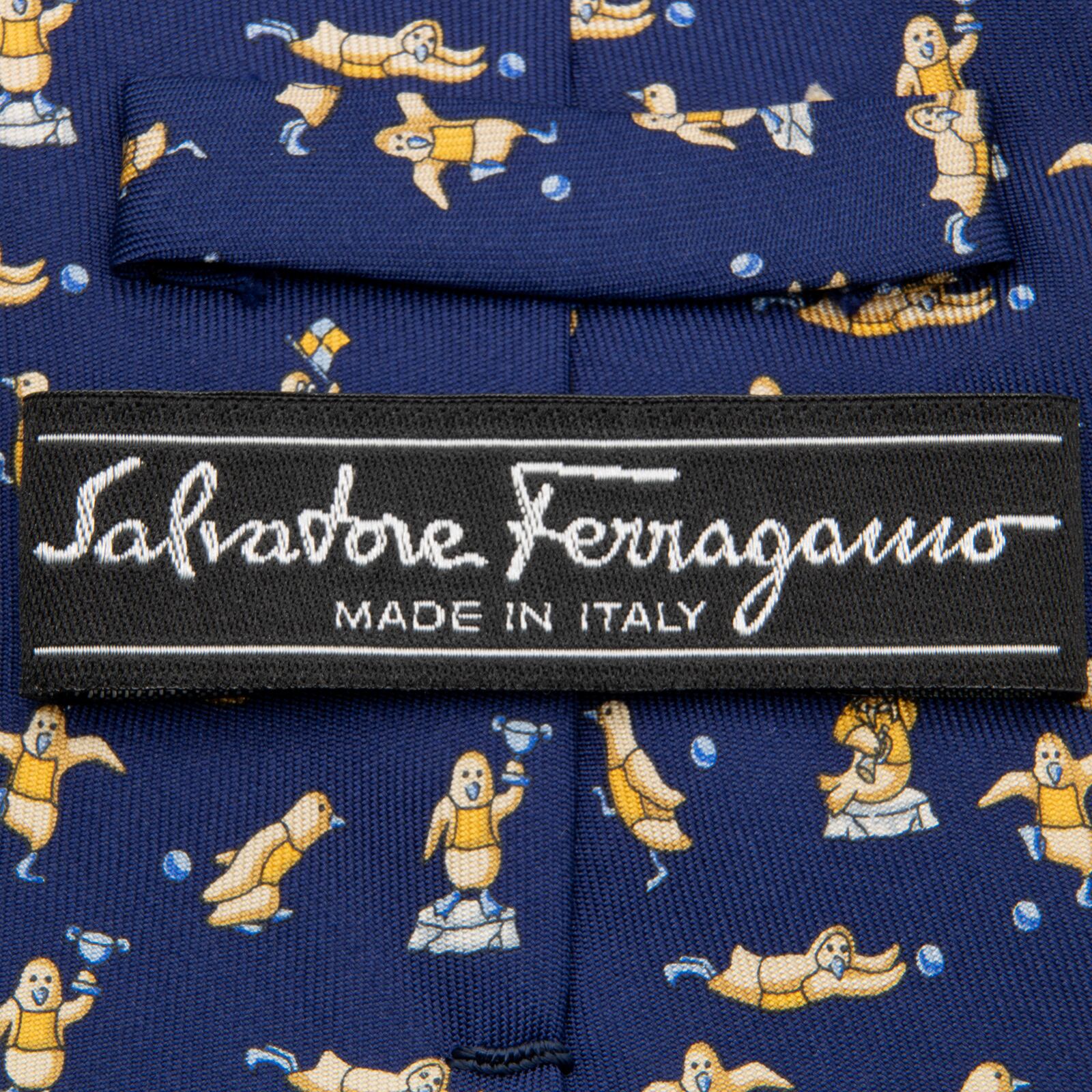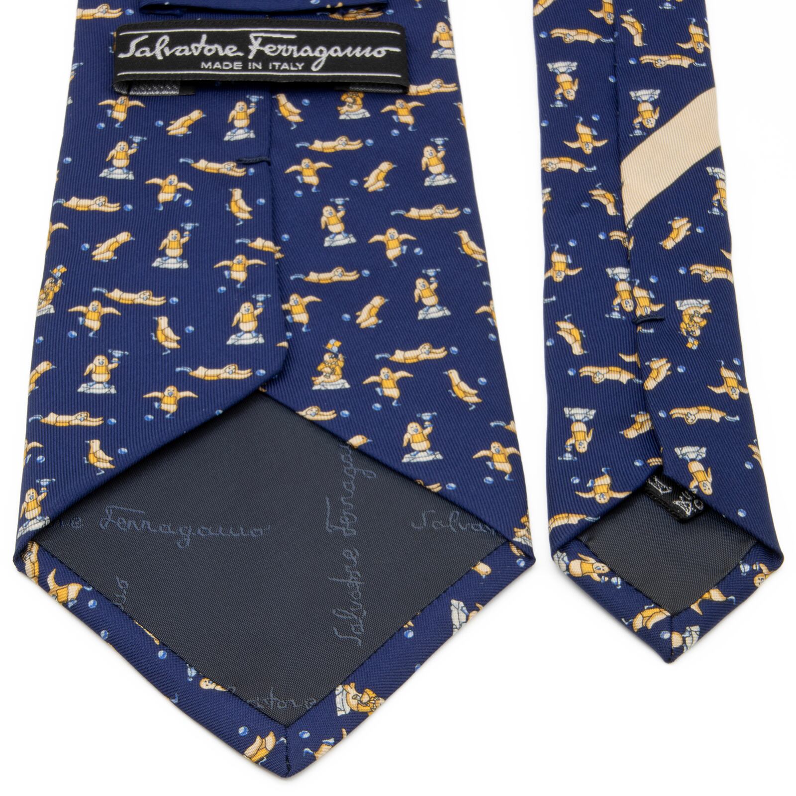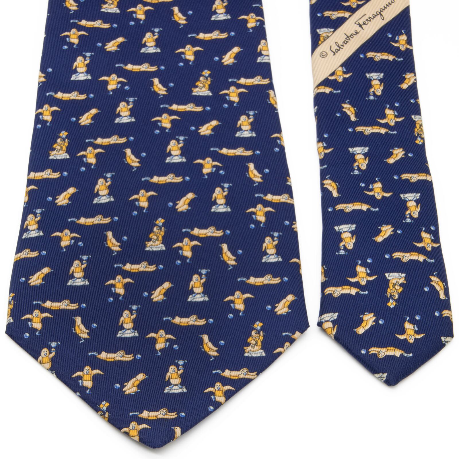 送料無料 フェラガモ ネクタイ シルク ネイビーブルー 黄色 水色 白 ビジネス カジュアル 小紋 動物 ペンギン かわいい おしゃれ 綺麗 P138