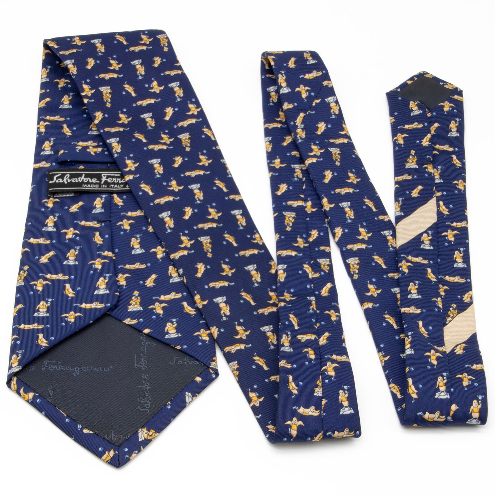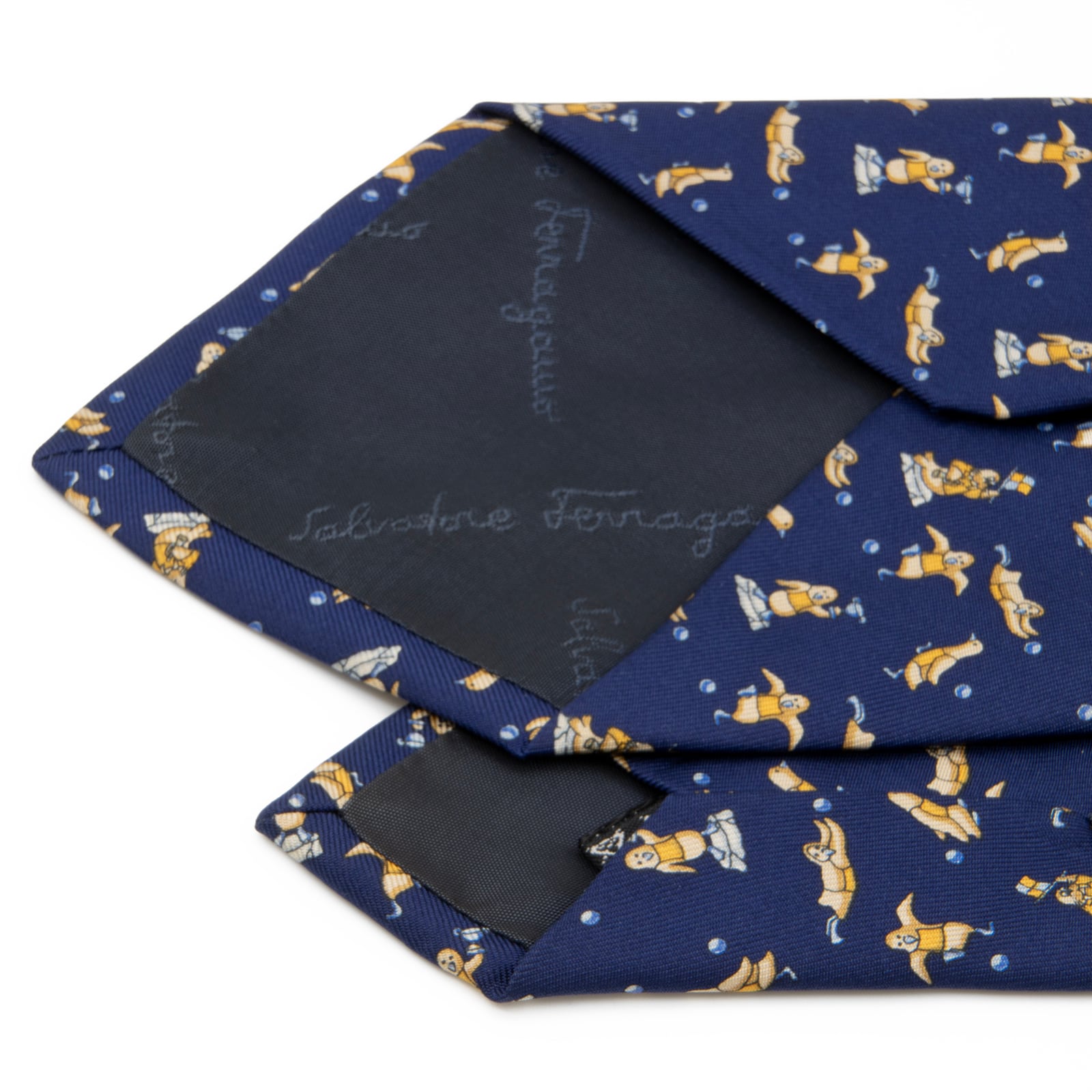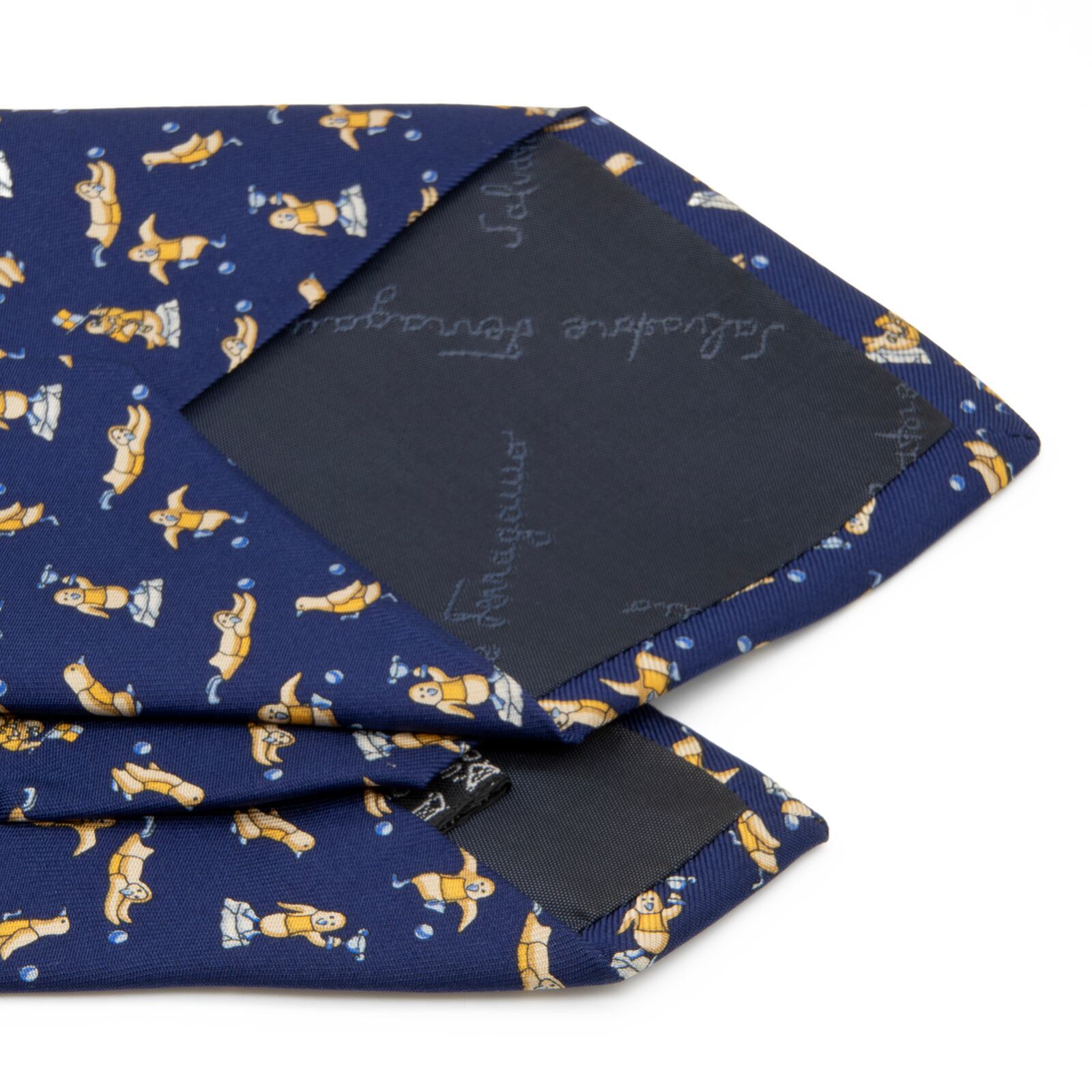 送料無料 フェラガモ ネクタイ シルク ネイビーブルー 黄色 水色 白 ビジネス カジュアル 小紋 動物 ペンギン かわいい おしゃれ 綺麗 P138