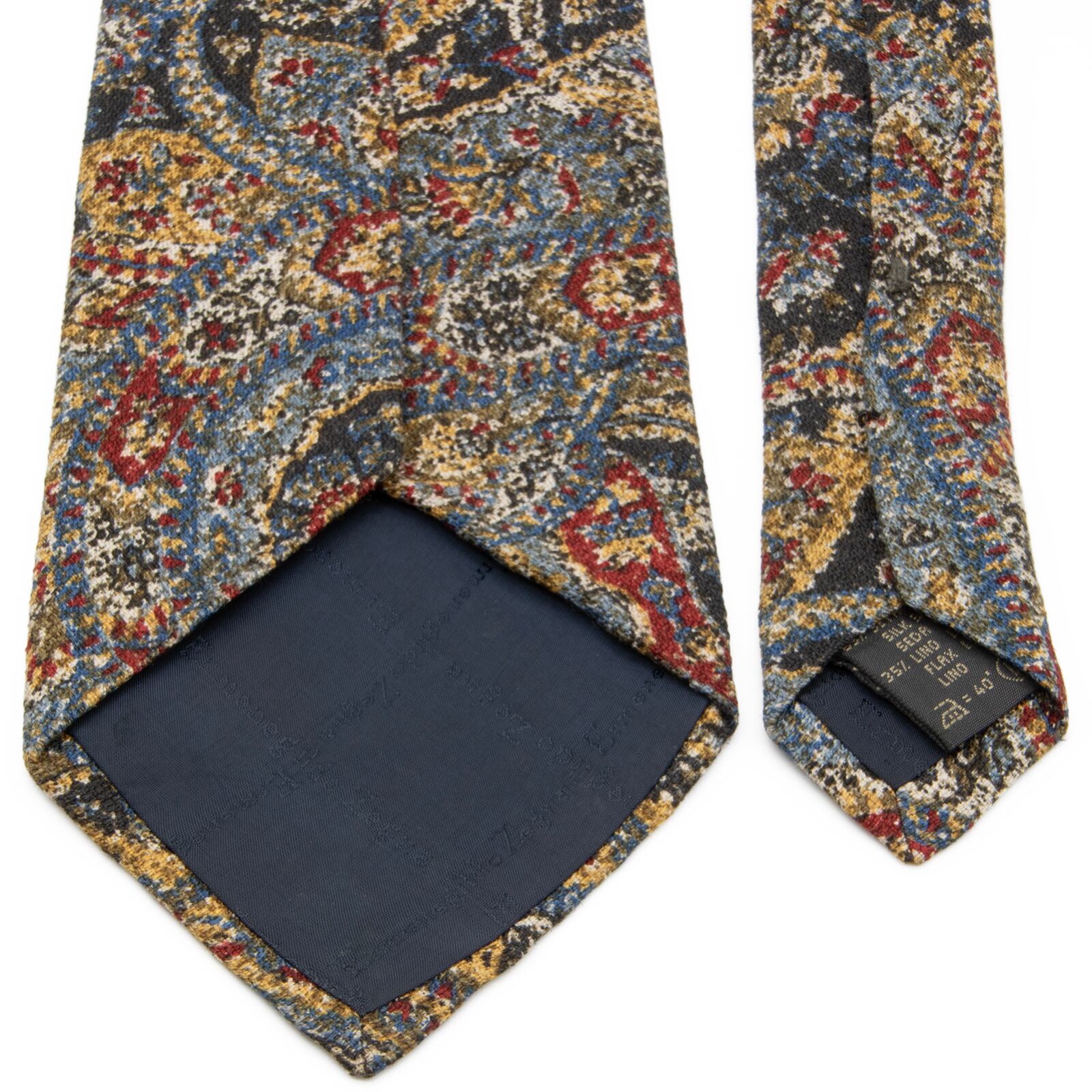 ブルーやイエロー、レッドといった無数の色の点が、複雑で美しいペイズリー柄を織りなしております。