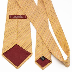 太陽のように明るいオレンジイエローの地に、気品あふれるパープルと、クリーンなオフホワイトのストライプが走る、大変美しい一本です。