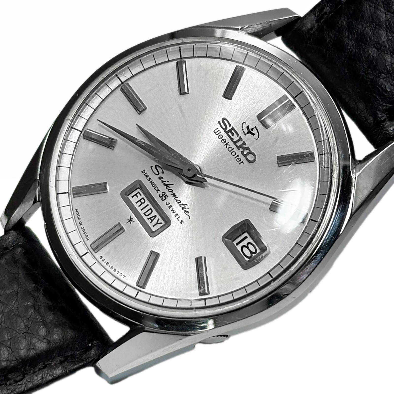 6時位置に曜日をフル表示する「ウィークデーター」は、当時のセイコーの技術力が結集した、革新的なモデルでございました。