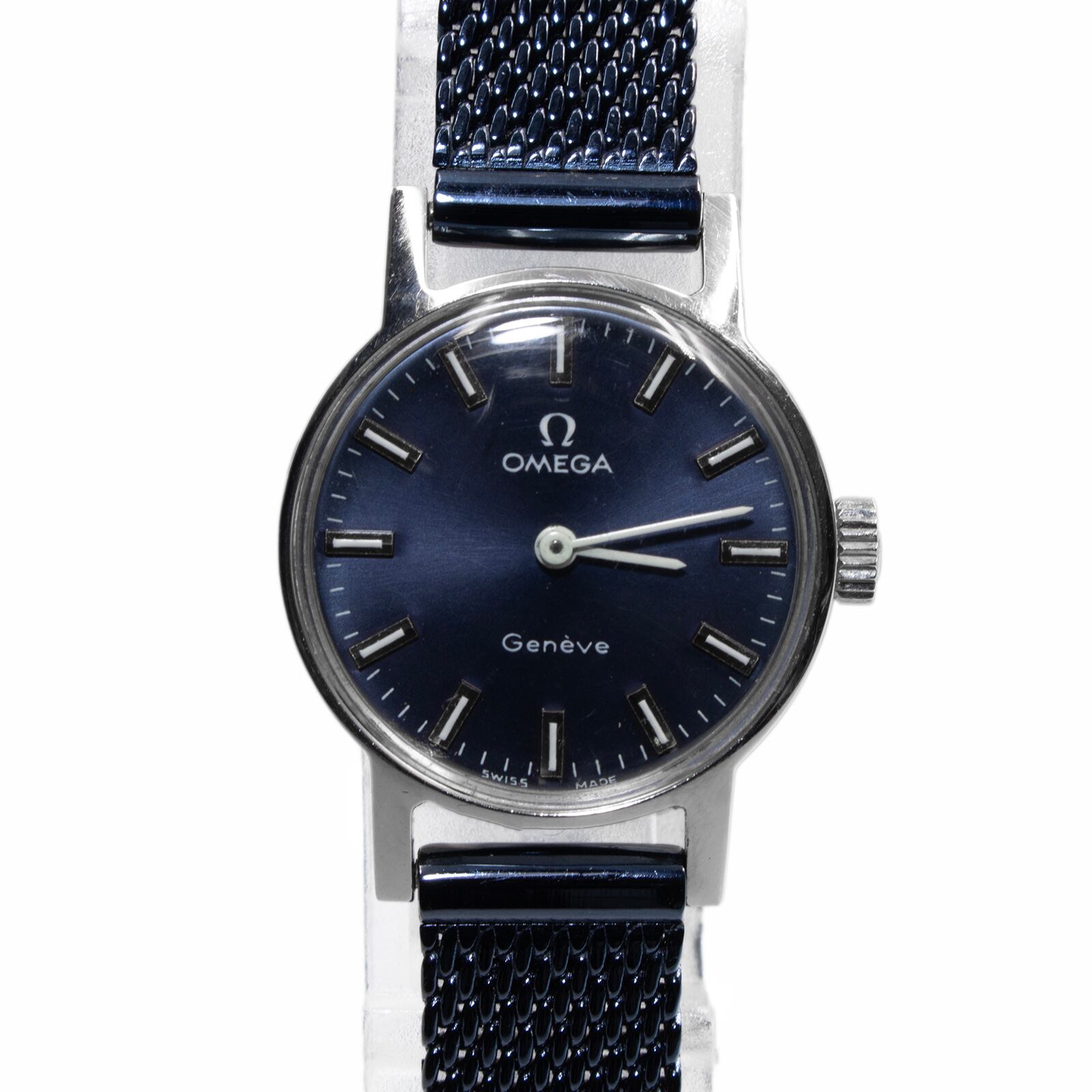 送料無料 オメガ 腕時計 手巻き レディース ジュネーブ 青 ネイビーブルー ヴィンテージ 小型 軽い ロゴ マーク ドレスウォッチ 綺麗 Q123