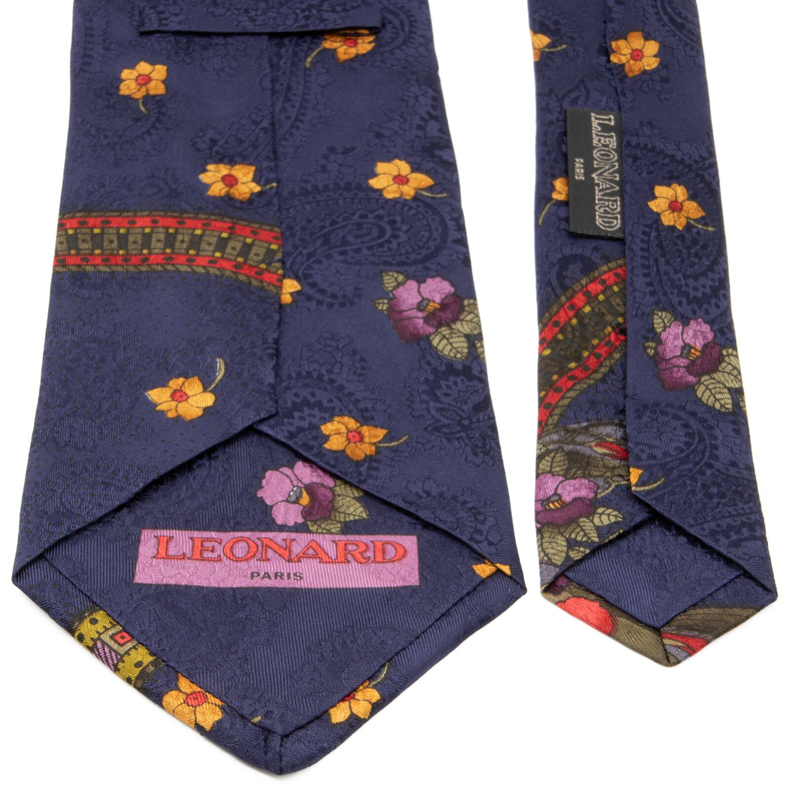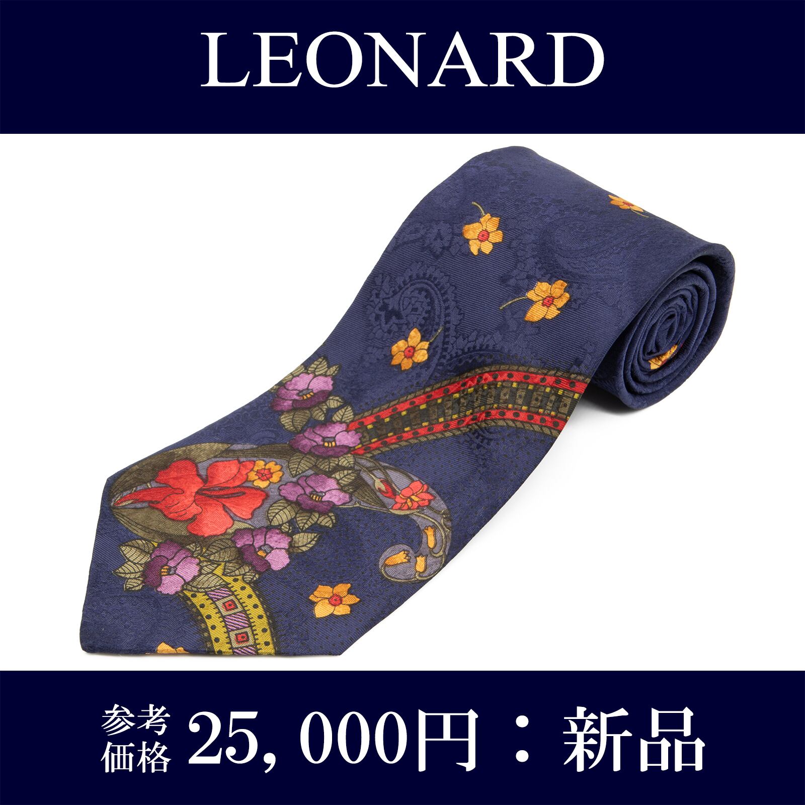 送料無料 レオナール ネクタイ 新品 シルク ネイビーブルー オレンジ 緑 赤 紫 ペイズリー 花 フラワー ブランド おしゃれ イタリア製 N784