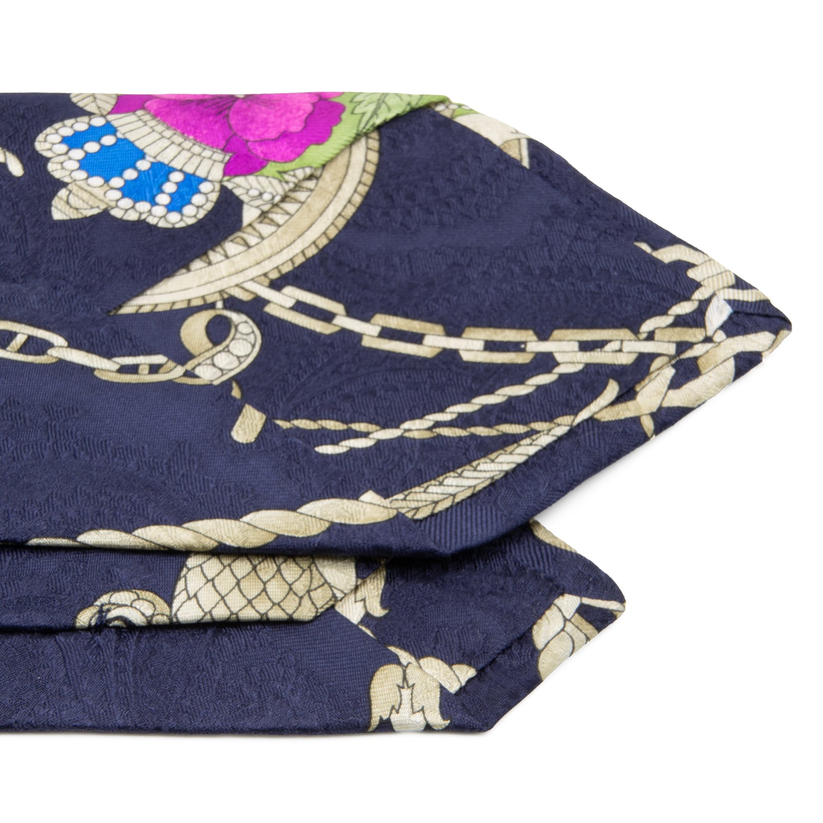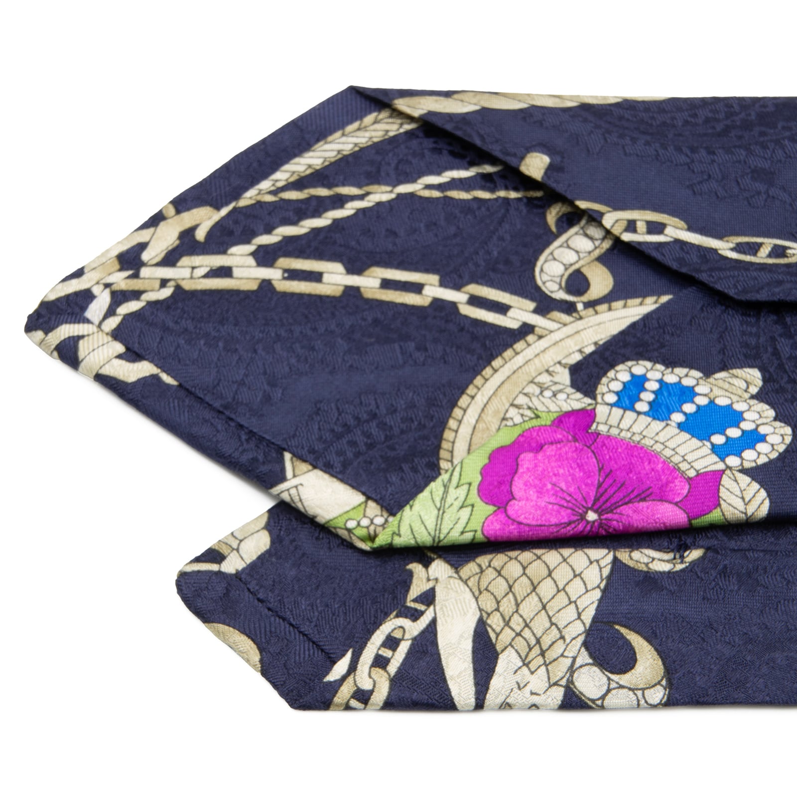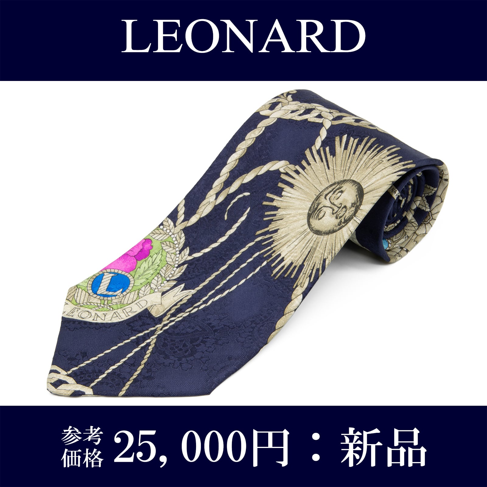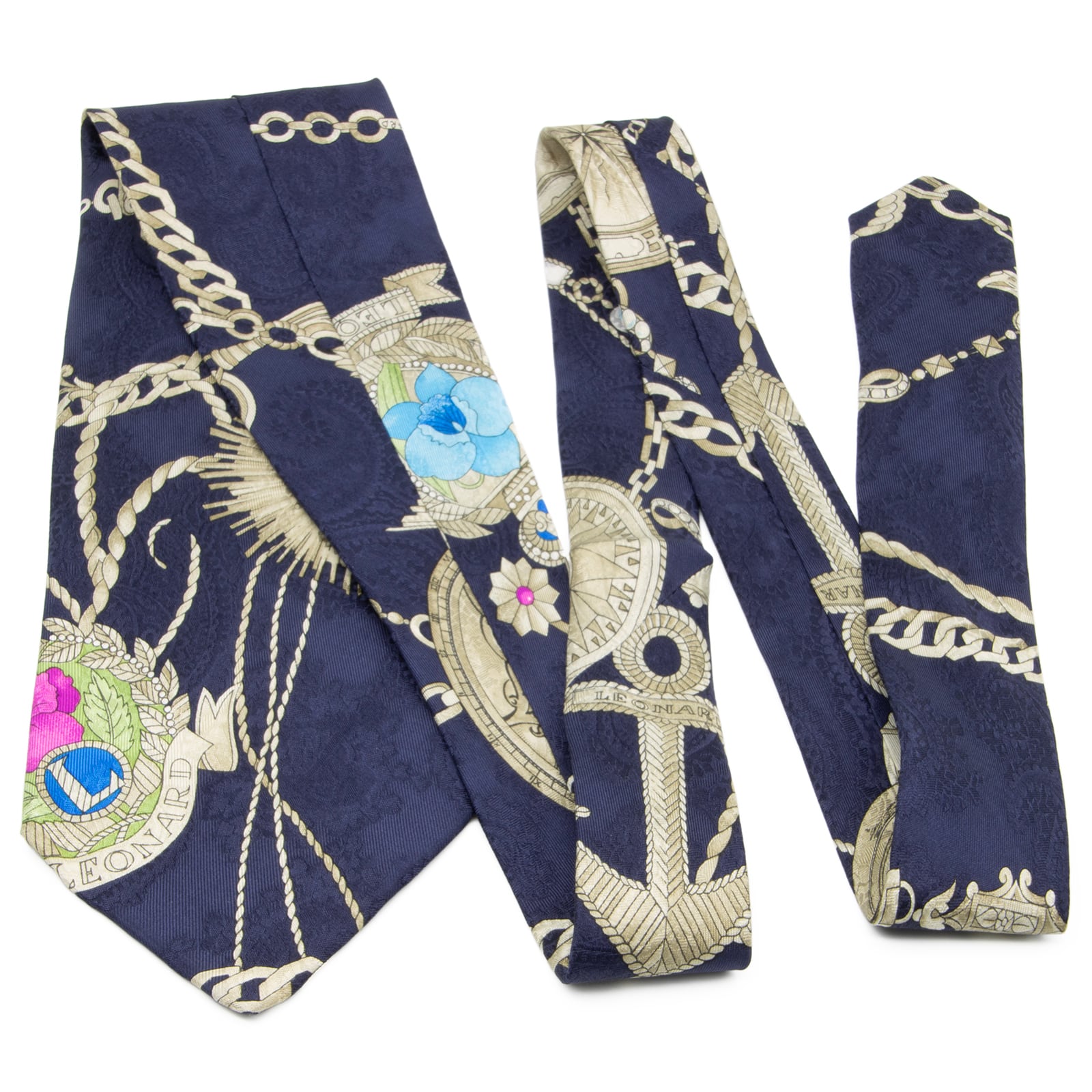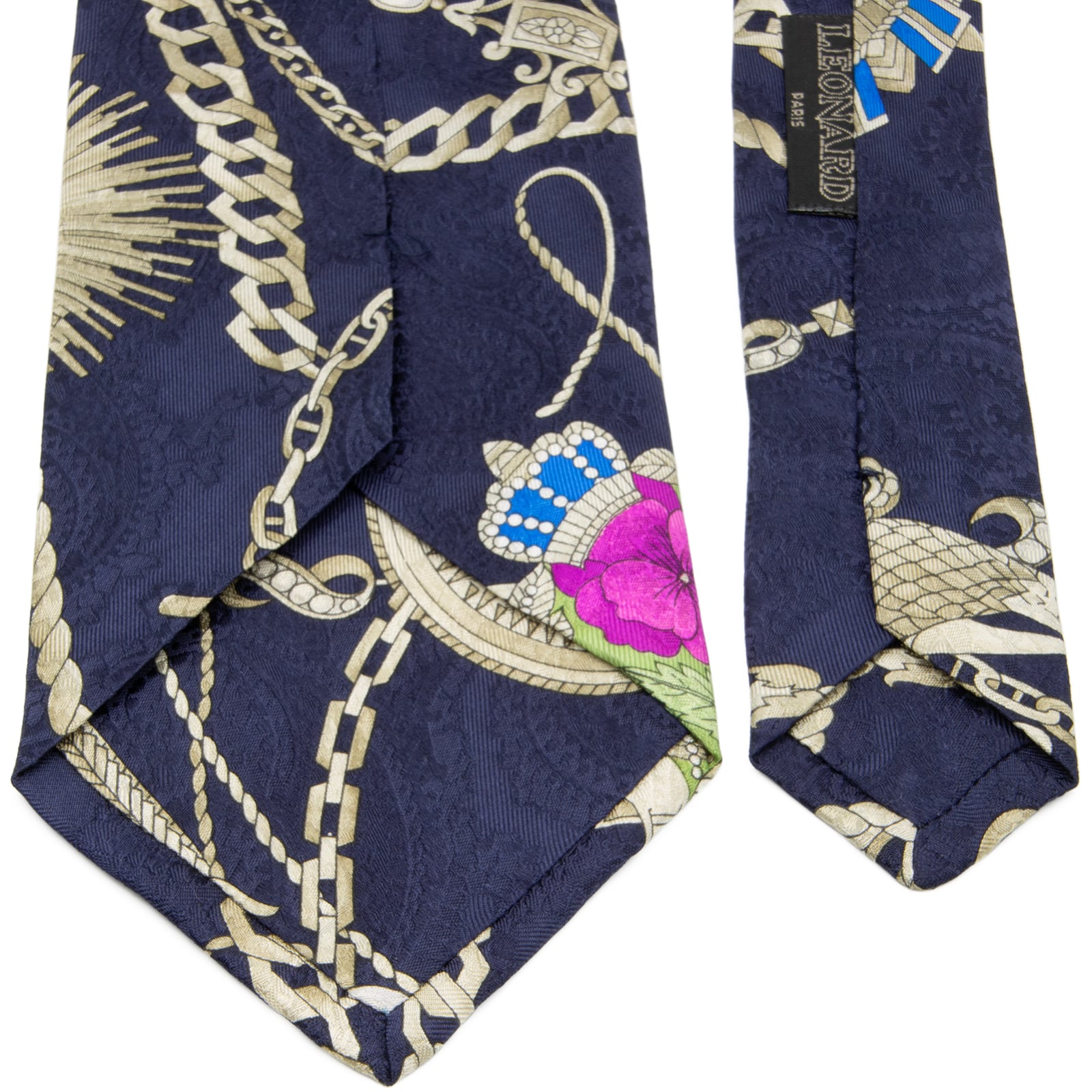 送料無料 レオナール ネクタイ 新品 シルク ネイビーブルー エクリュ 黄緑色 紫 ペイズリー チェーン ロゴ マーク ブランド イタリア N848