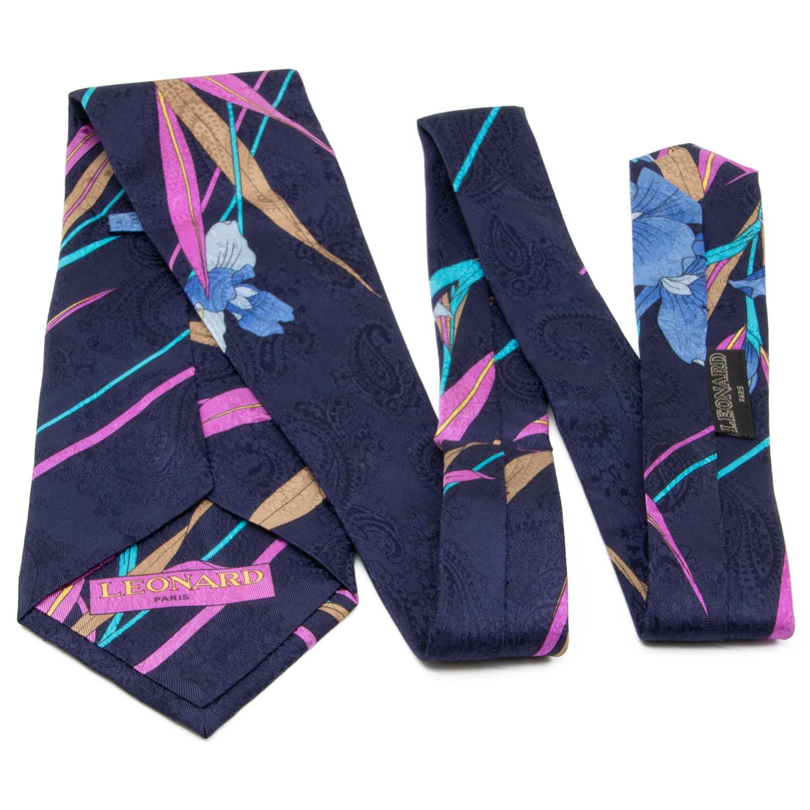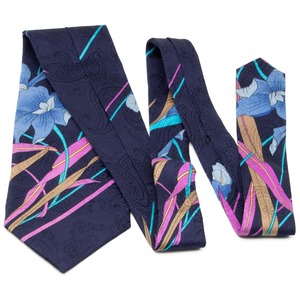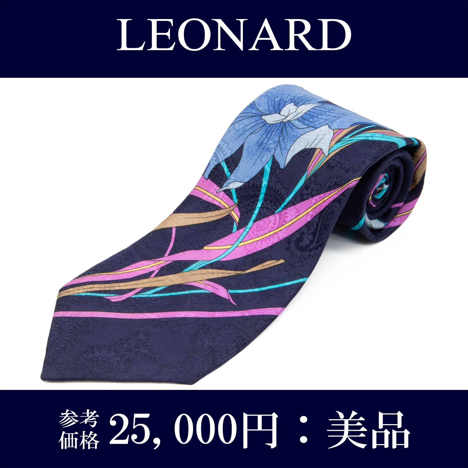 送料無料 レオナール ネクタイ レギュラータイ シルク ネイビーブルー 紫 水色 ゴールド 黄色 ペイズリー 花 ブランド イタリア 綺麗 N855