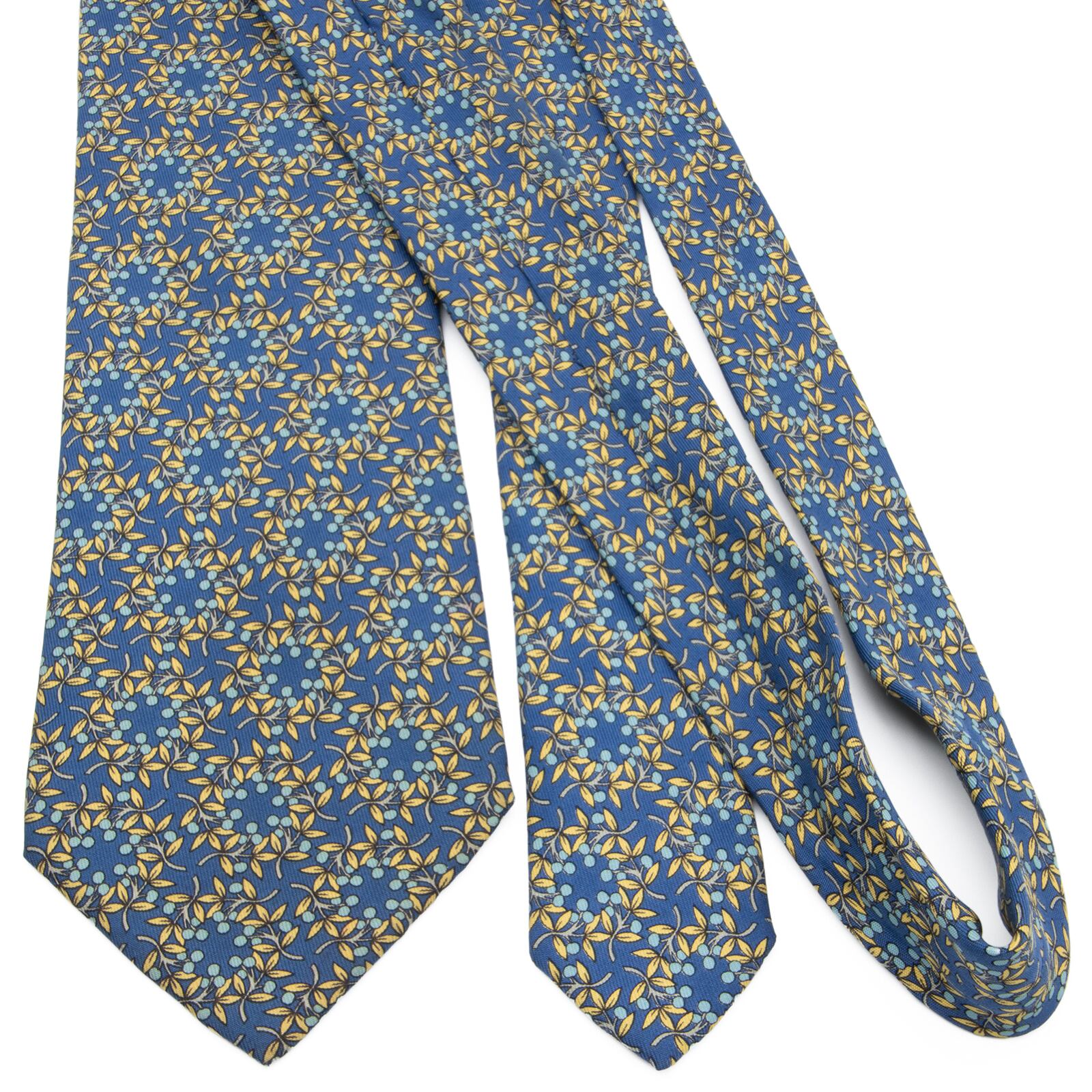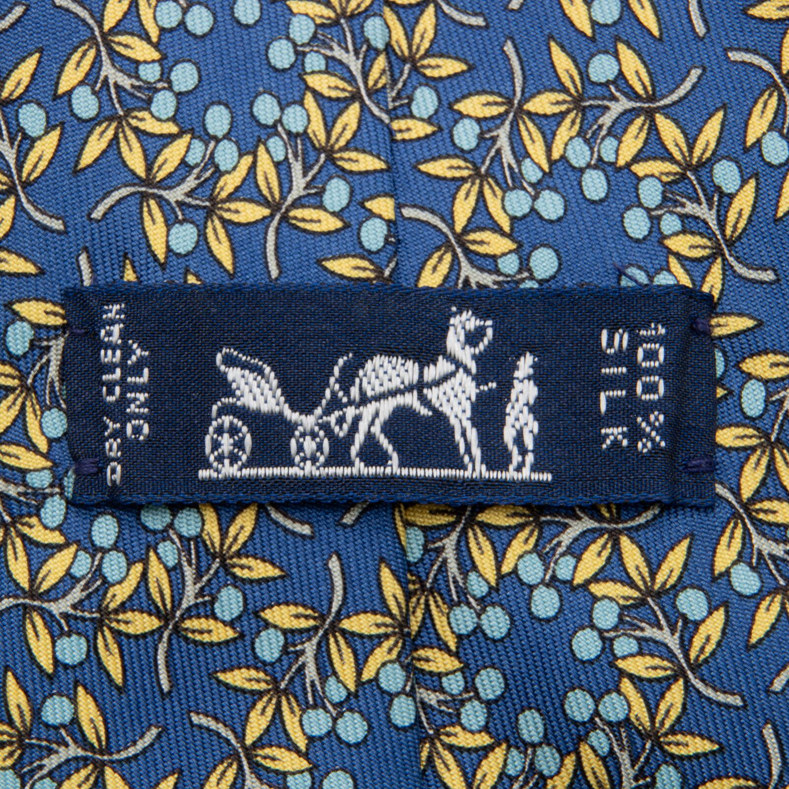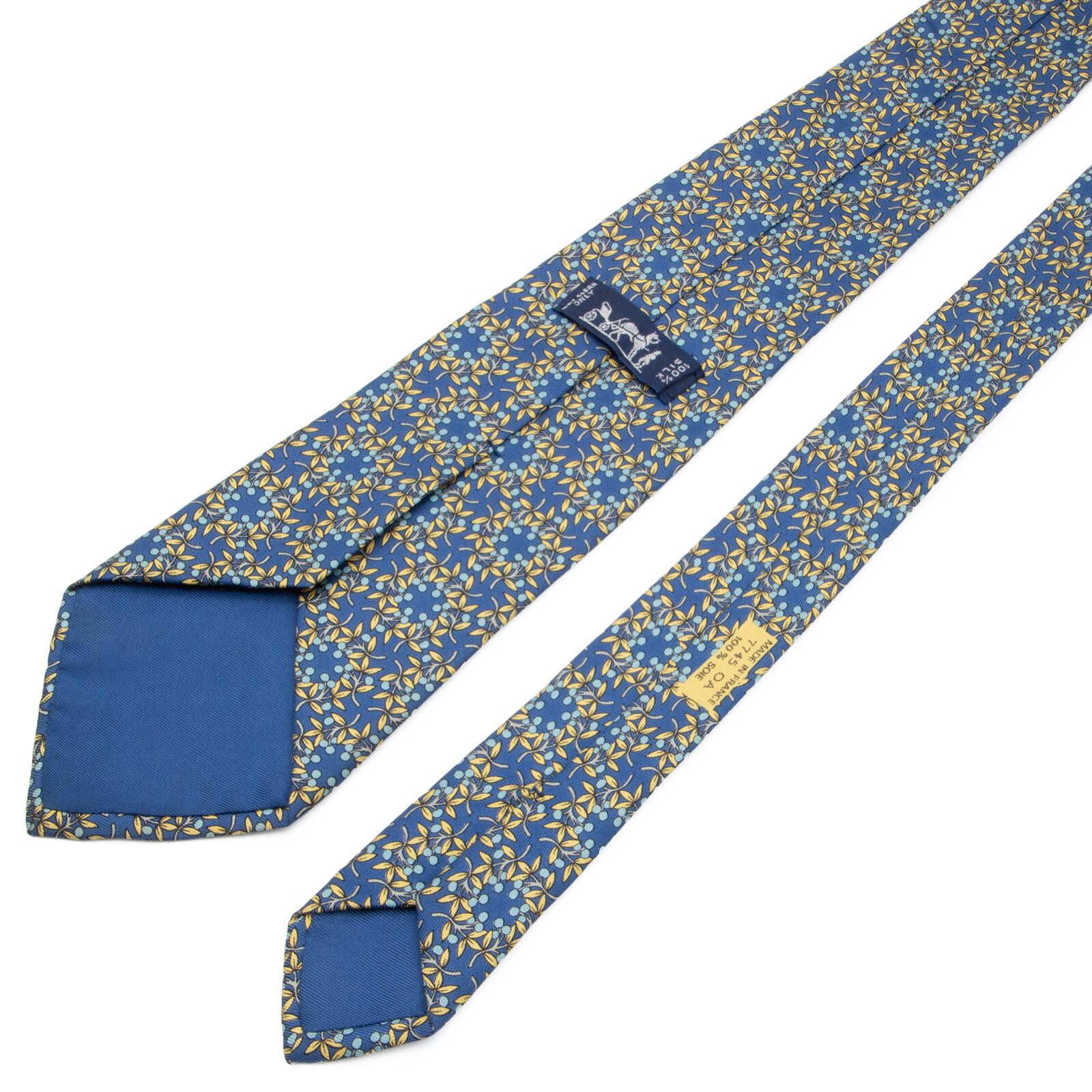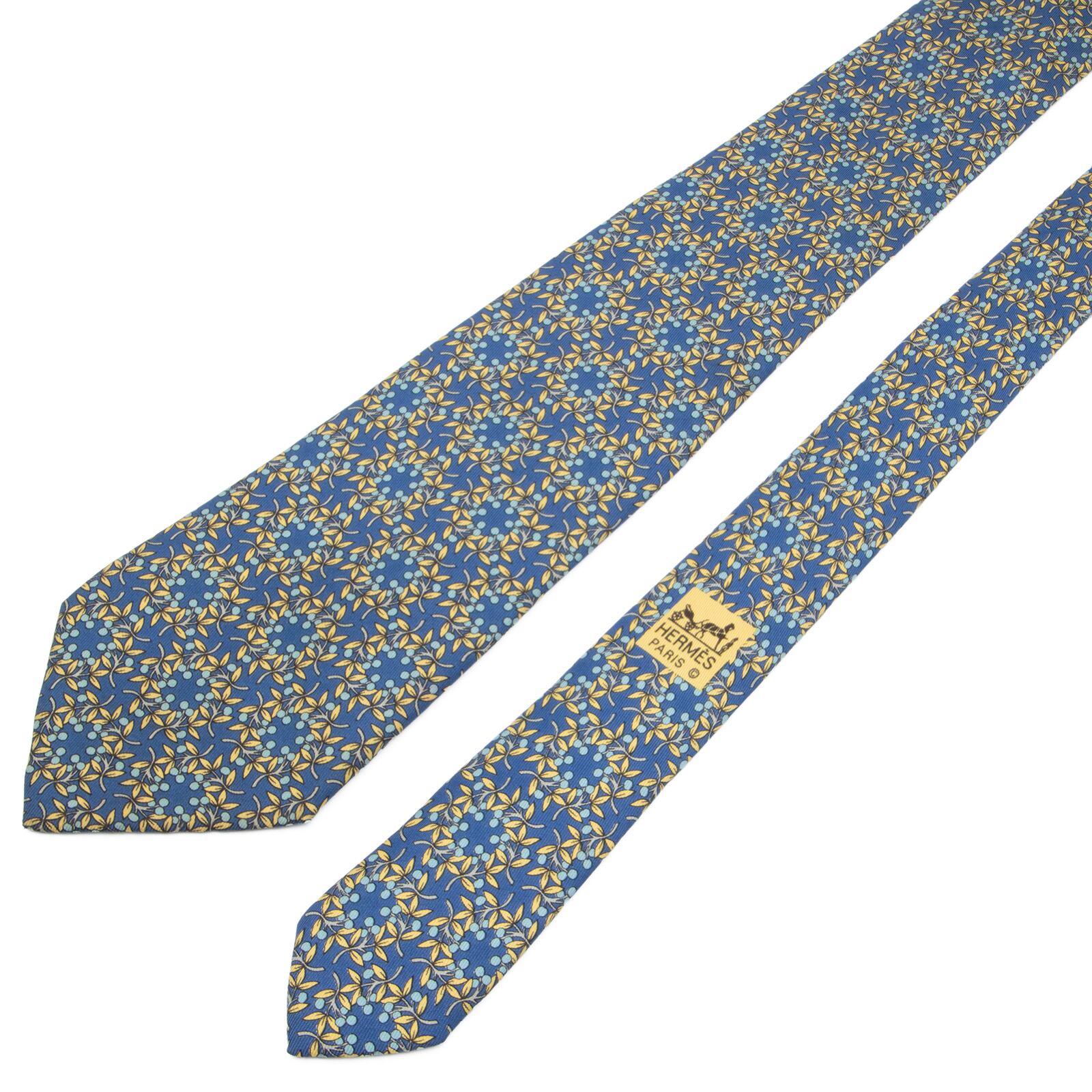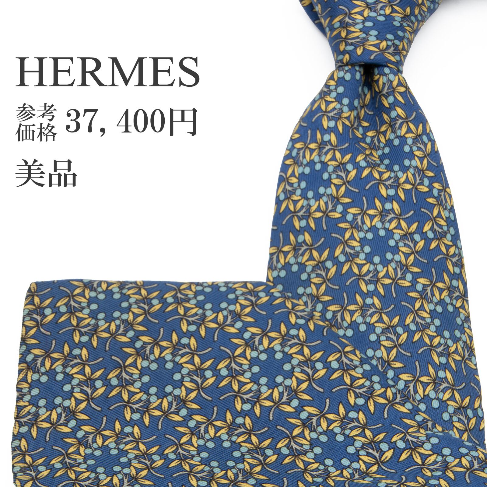送料無料 エルメス ネクタイ レギュラータイ シルク 青 ブルー 水色 黄色 イエロー グレー 葉っぱ リーフ ブランド フランス製 綺麗 P200