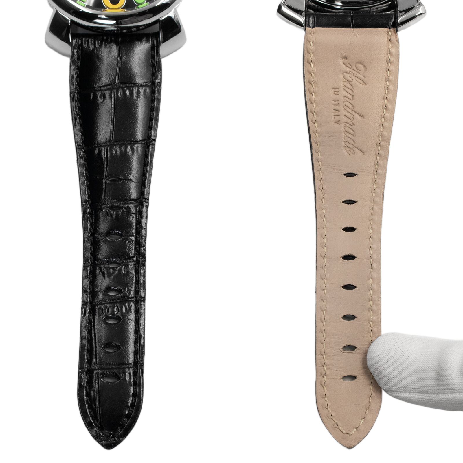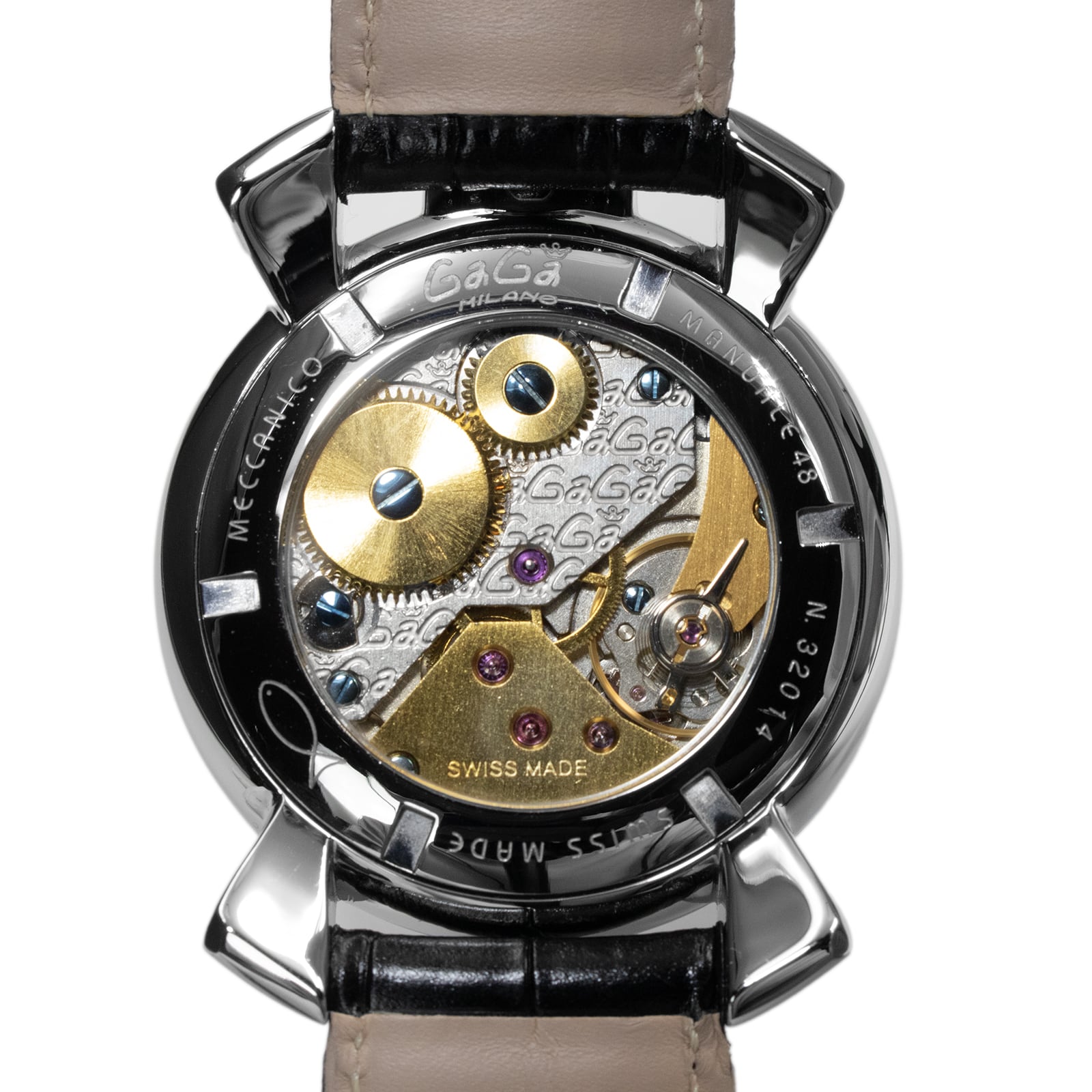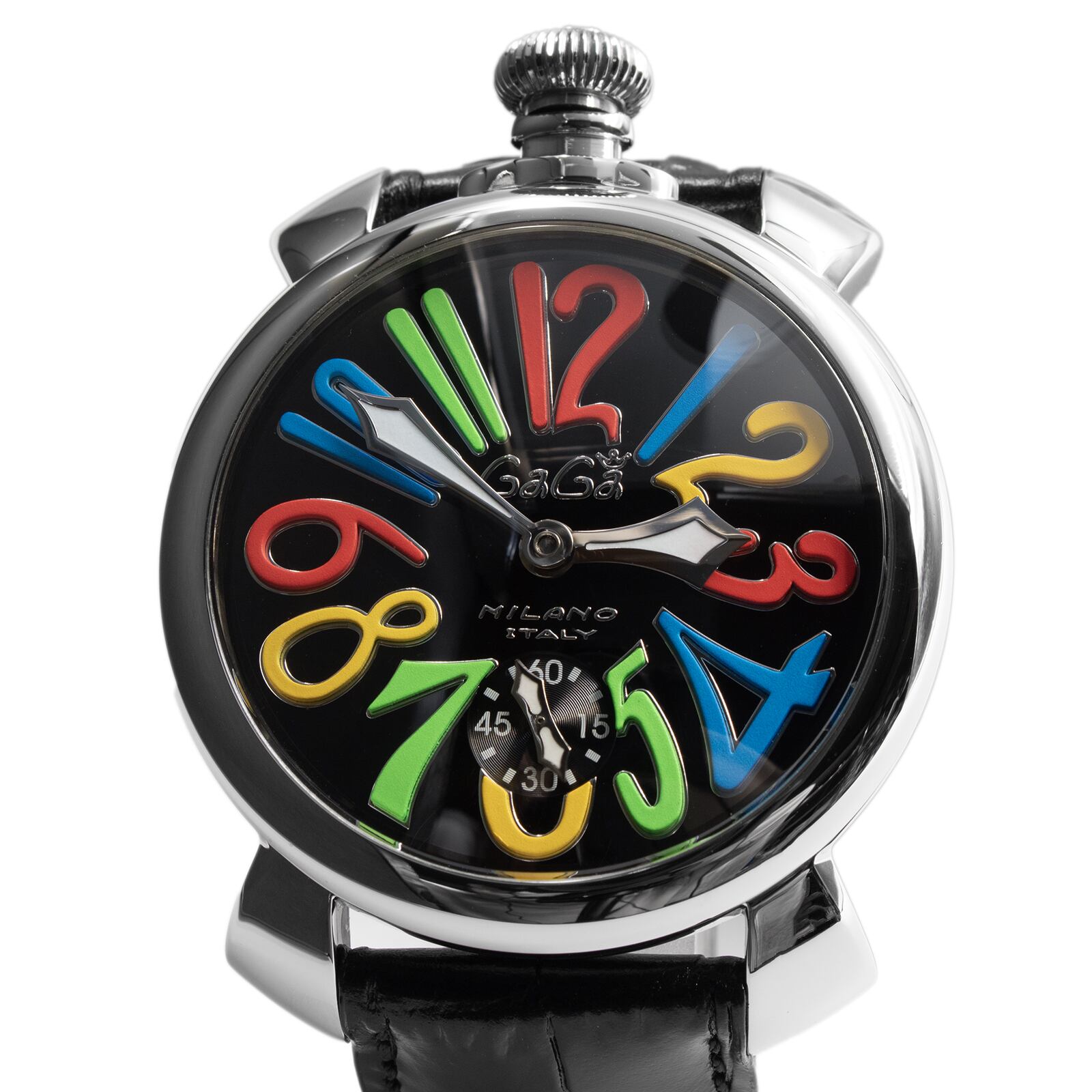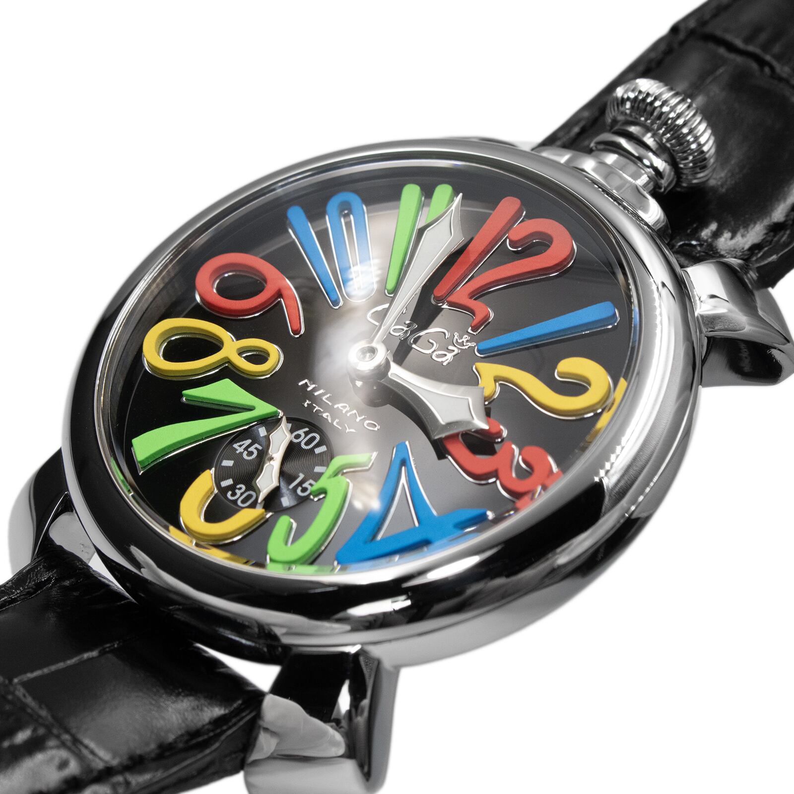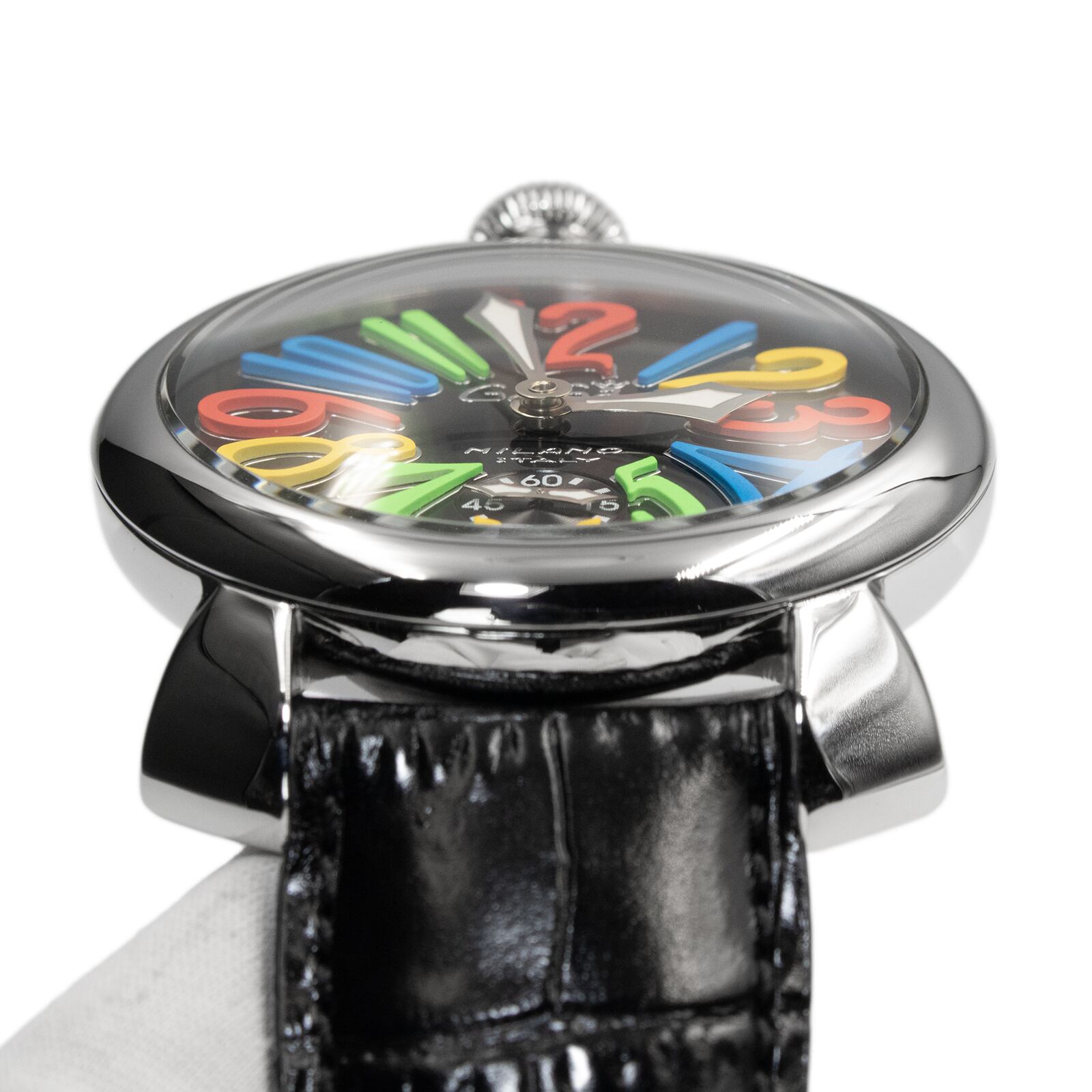 送料無料 ガガミラノ 腕時計 手巻き 新品同様 メンズ マヌアーレ48mm 5010.02S 黒 派手 目立つ 大型 裏スケ カラフル ロゴ 革ベルト Q130