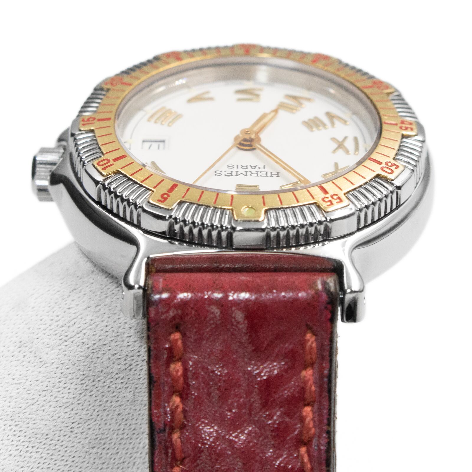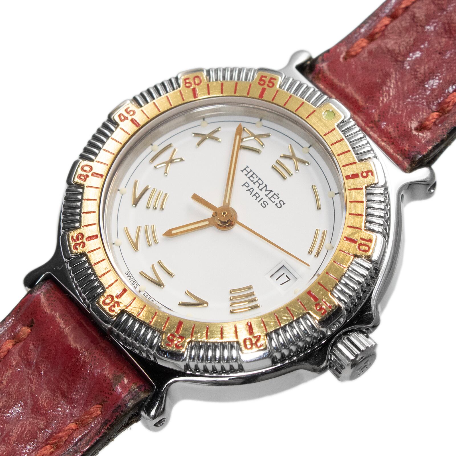 送料無料 エルメス 腕時計 レディース キャプテンニモ 白 ホワイト ゴールド 赤 珍しい レアカラー ヴィンテージ ロゴ 革ベルト 綺麗 Q131