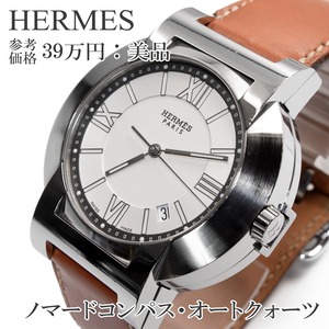 送料無料 エルメス 腕時計 オートクォーツ メンズ ノマードコンパス N02.910 白 茶色 大型 目立つ ロゴ マーク 革ベルト 蓄電池 綺麗 Q134