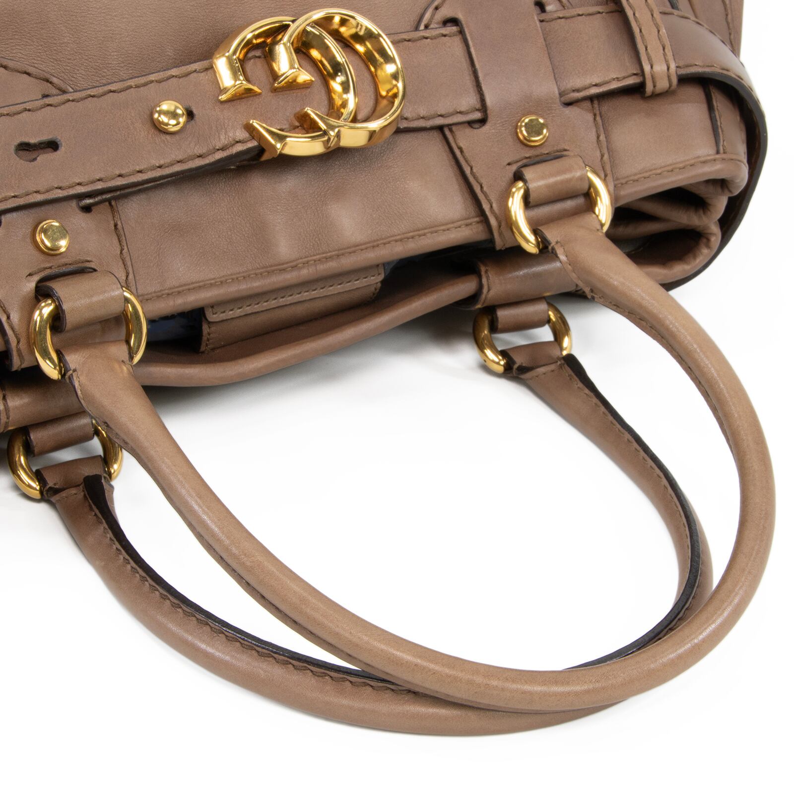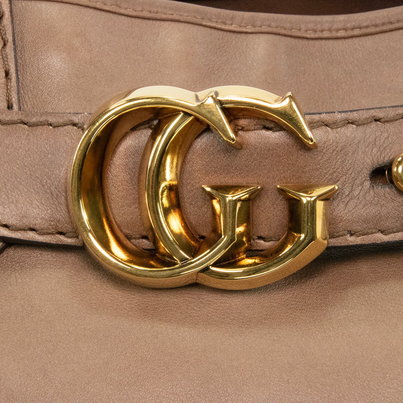 ブランドを象徴するインターロッキングGの金具が、フロントで優雅な存在感を放っております。