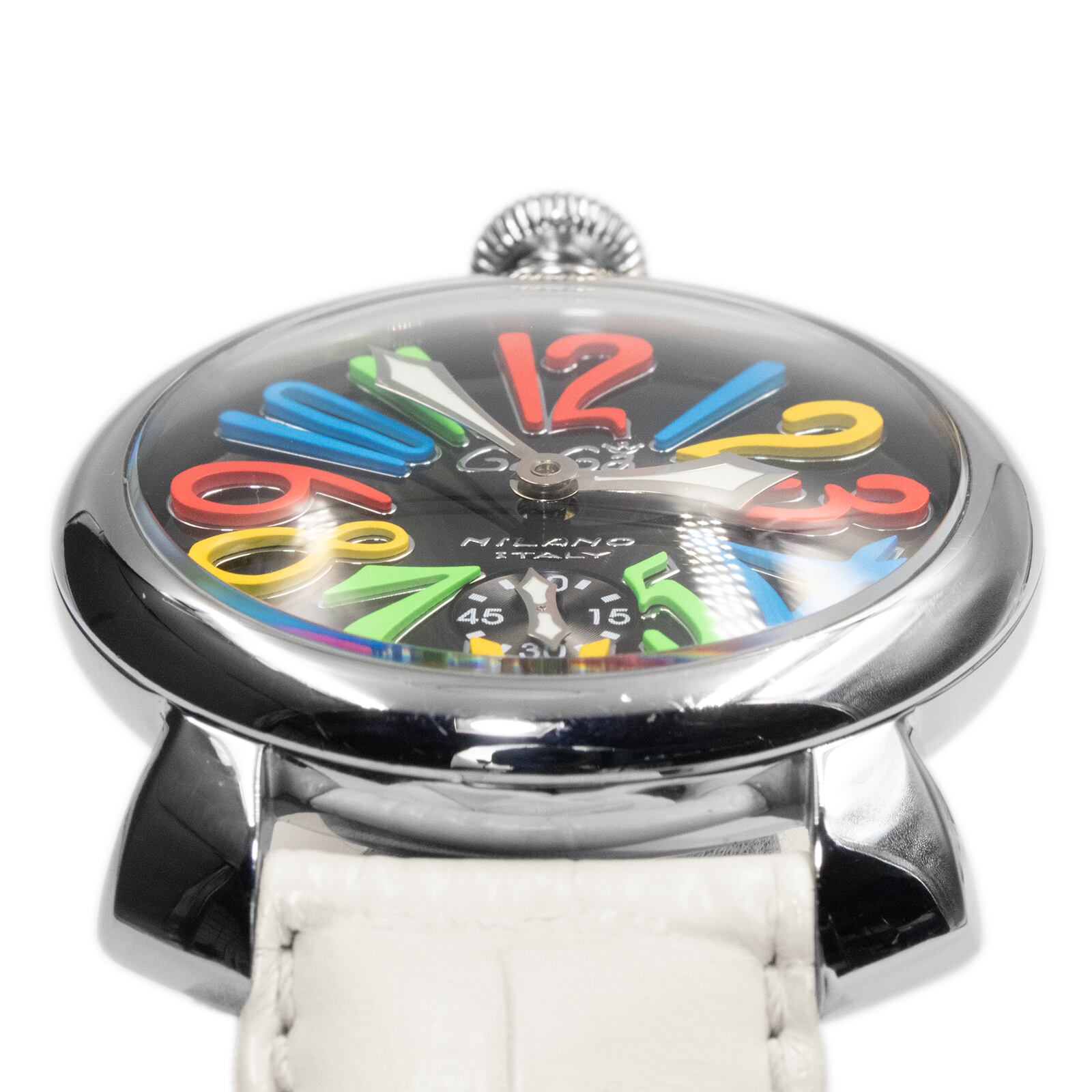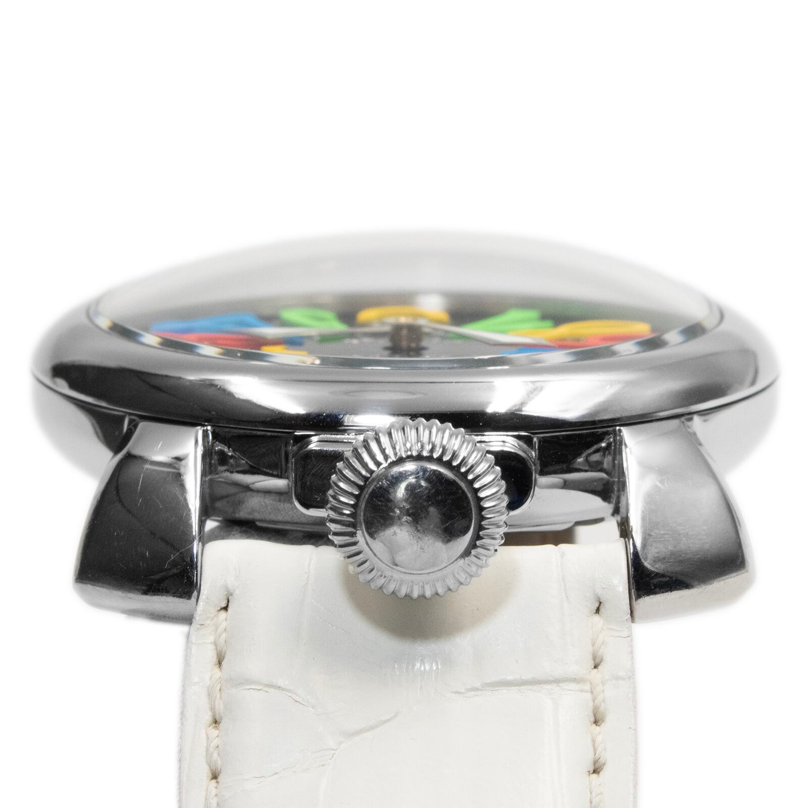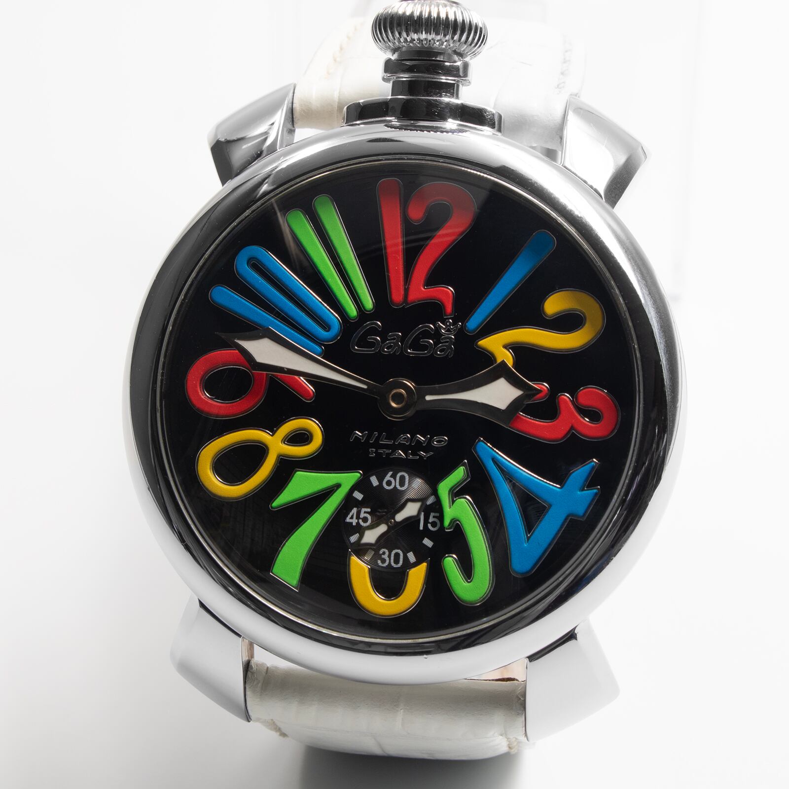 こちらはイタリアの伊達男を思わせるカラフルなデザインをした、ガガミラノの腕時計でございます。