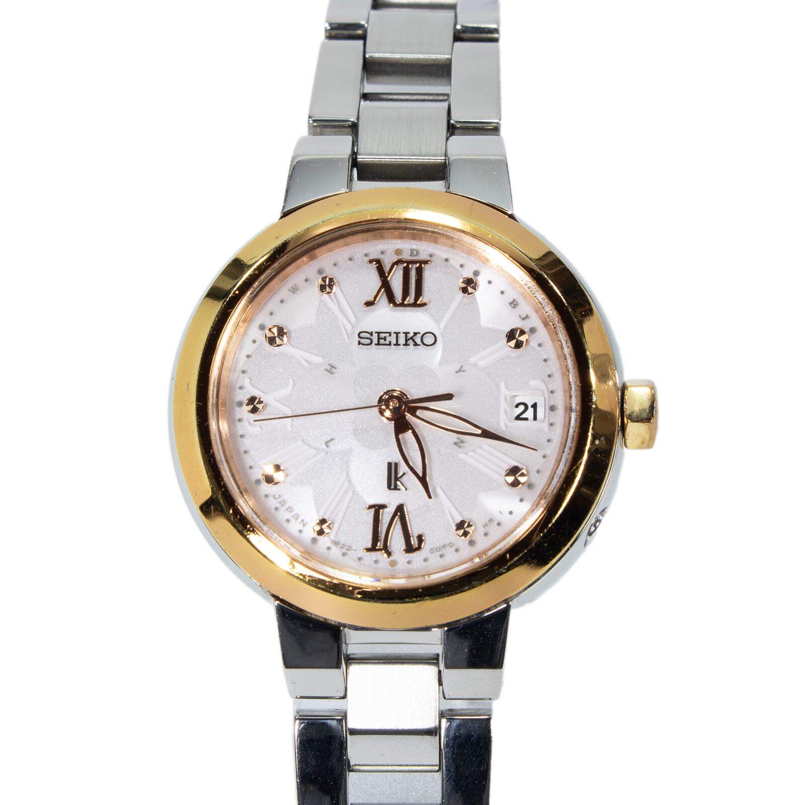 こちらは文字盤に可憐な花が咲いているフェミニンなデザインをした、セイコーの腕時計でございます。