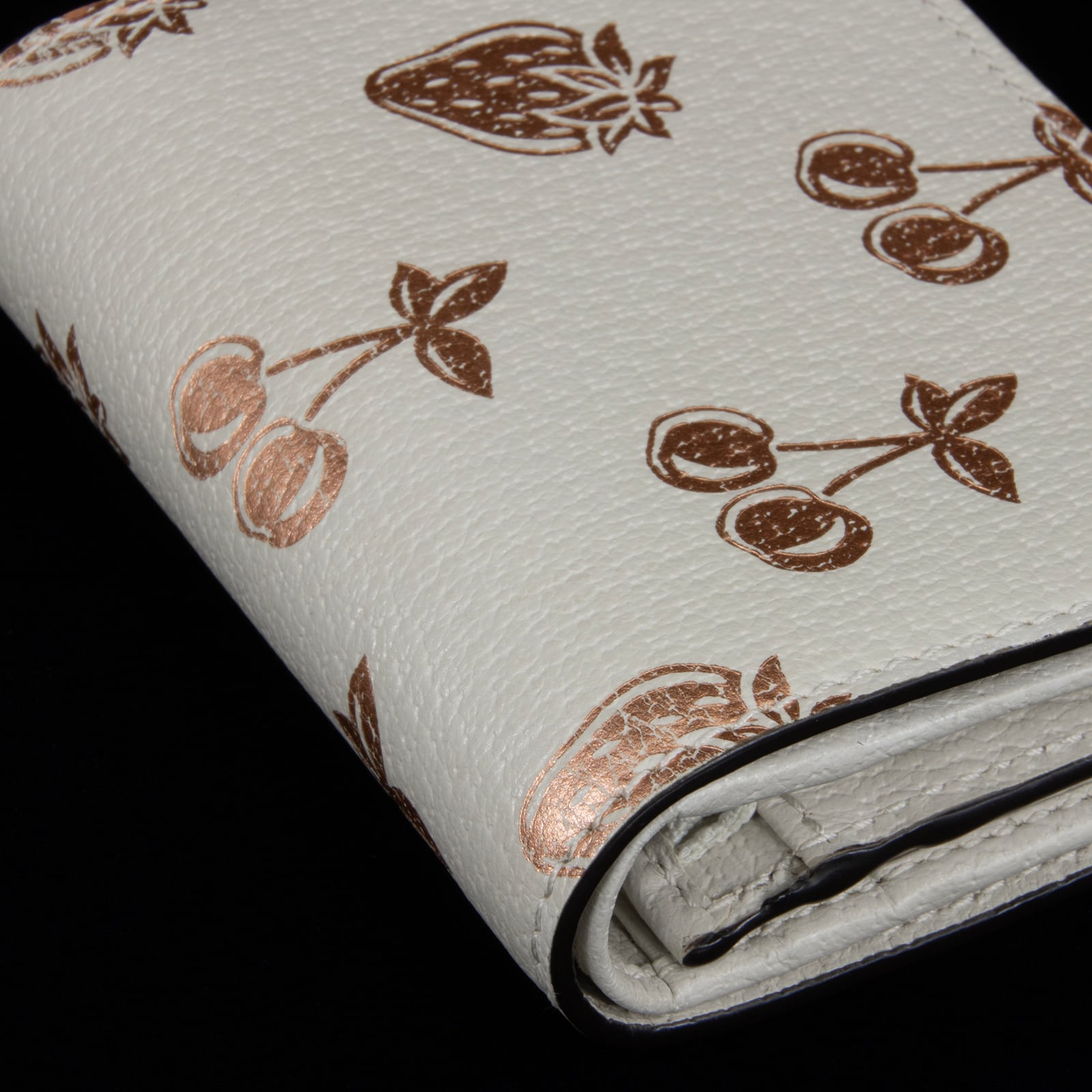 清潔感のあるオフホワイトの地に、愛らしいストロベリーとチェリーのモチーフが散りばめられております。