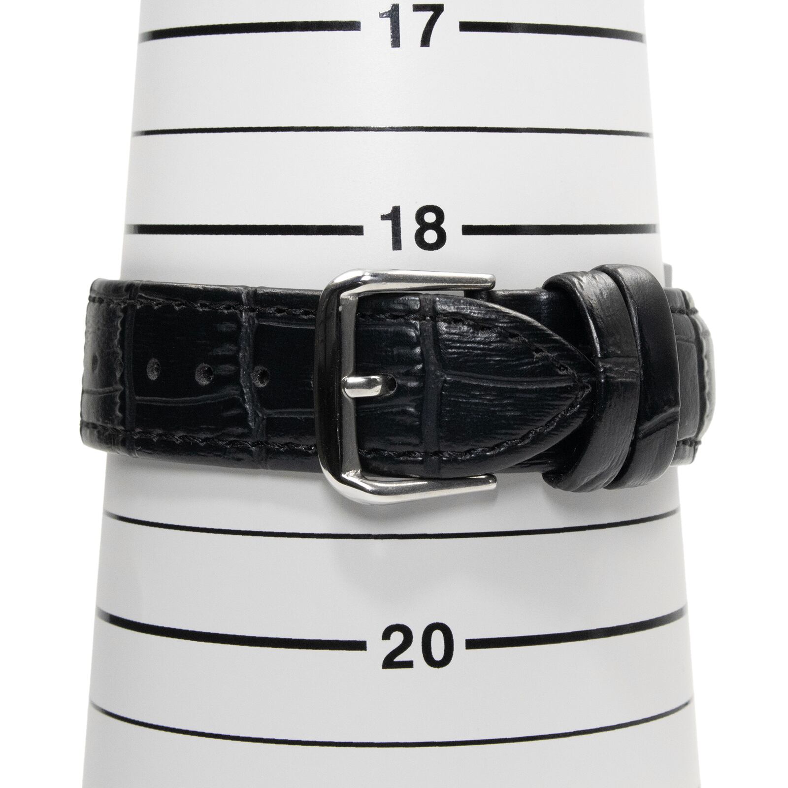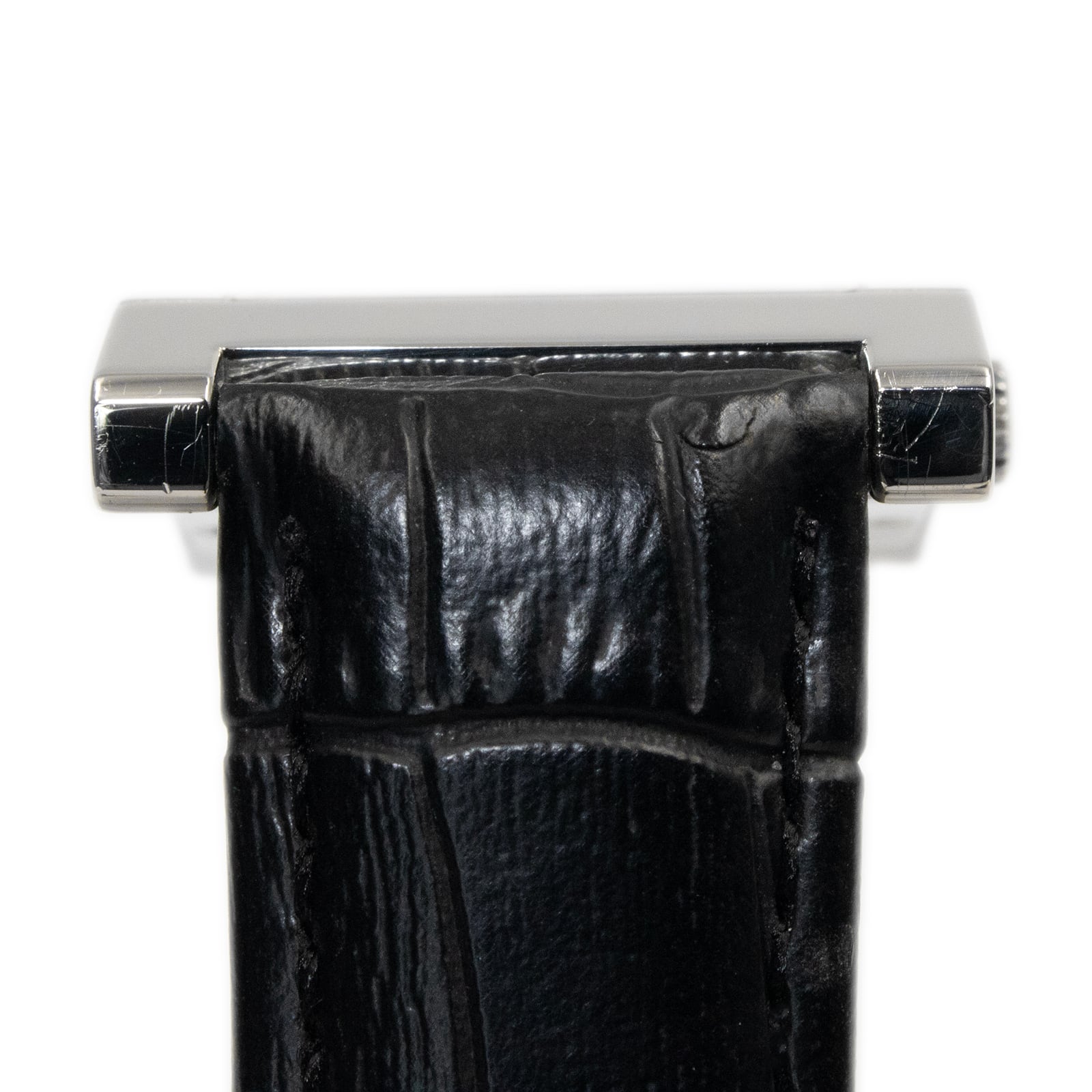 クラシカルなスクエアケースと、シックなブラックの革ベルトの組み合わせは、まさに王道と呼べるデザインでございます。