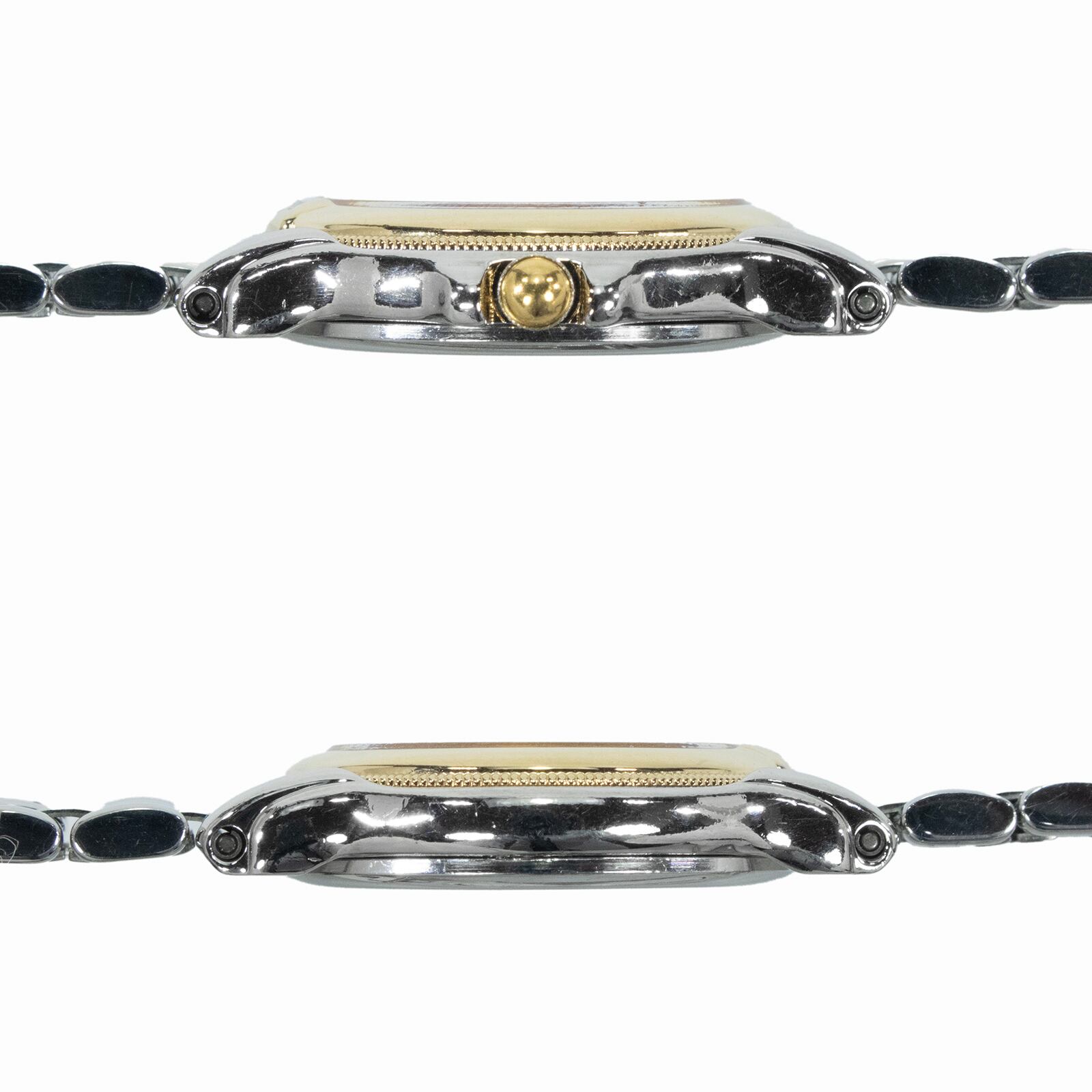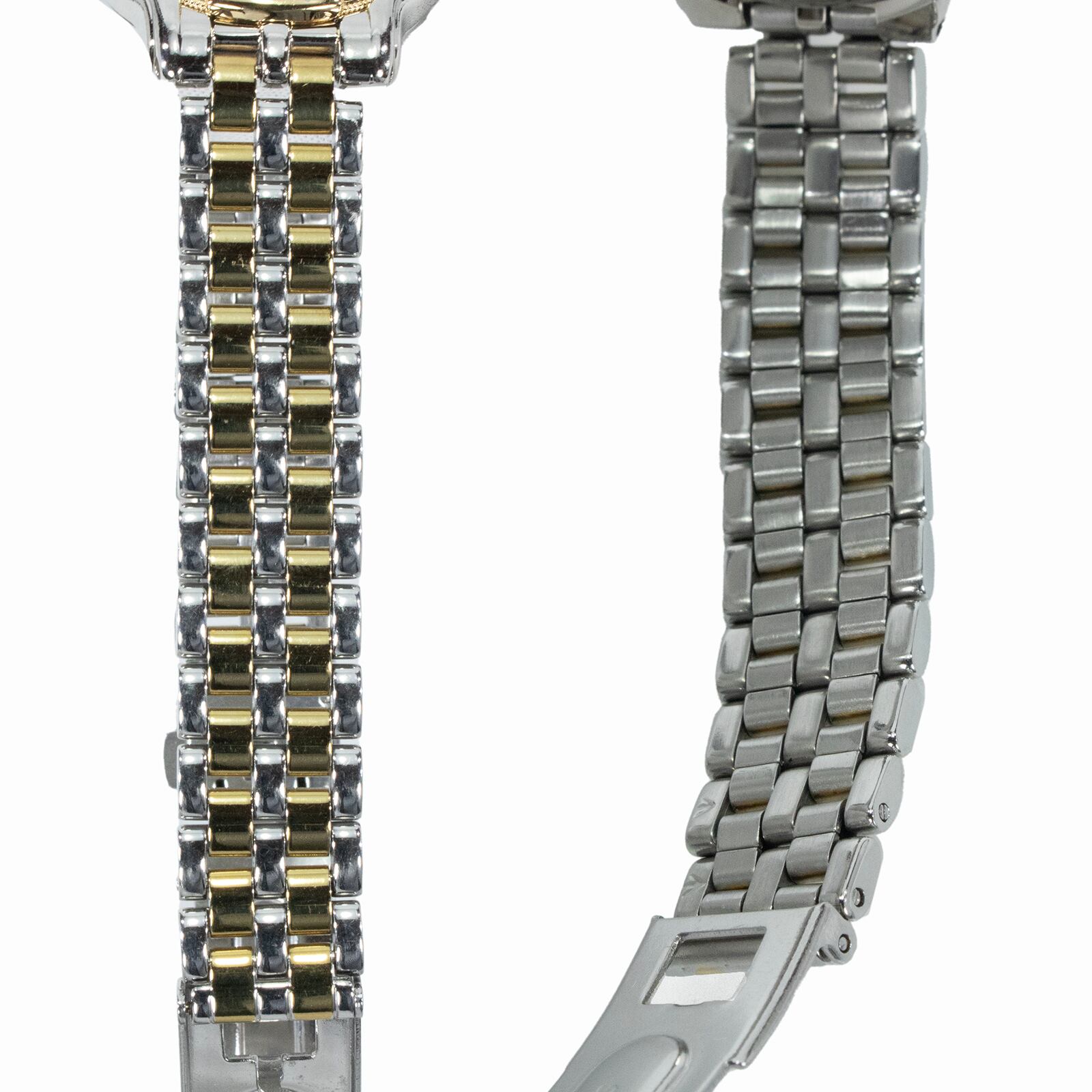 温かみのあるアイボリーの文字盤と、シルバーとゴールドのコンビカラーが、上品で落ち着いた印象を与えます。