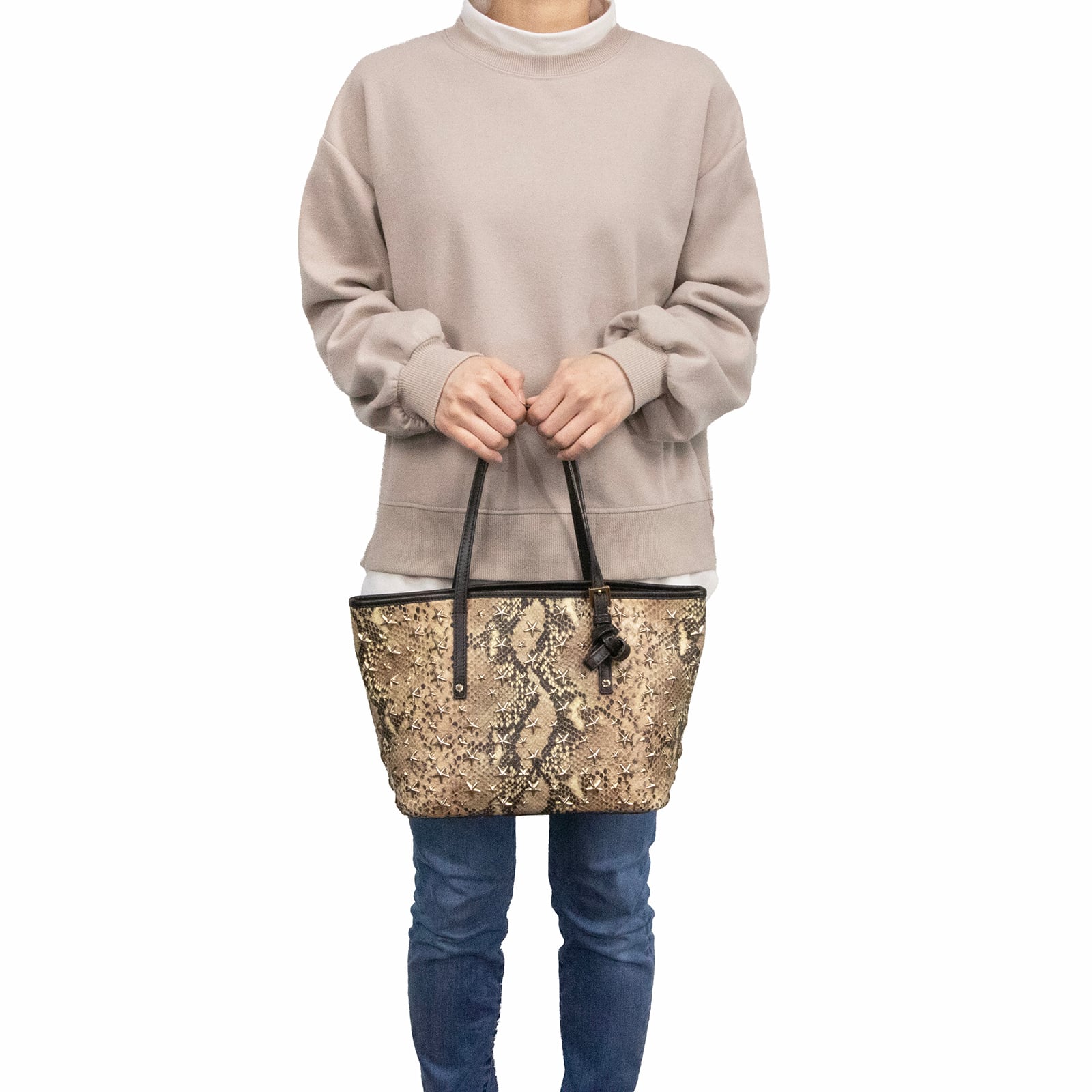 ベージュ系の落ち着いた地色に浮かび上がるリアルなパイソン柄は、大人の女性にふさわしい気品と風格を感じさせます。