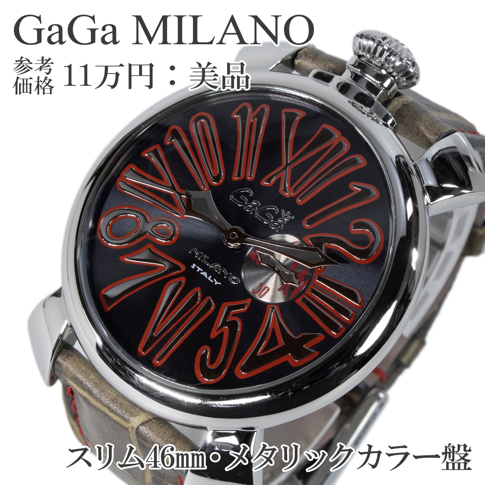 こちらは46ミリの迫力と、スリムな着け心地を両立させている、ガガミラノの腕時計でございます。
