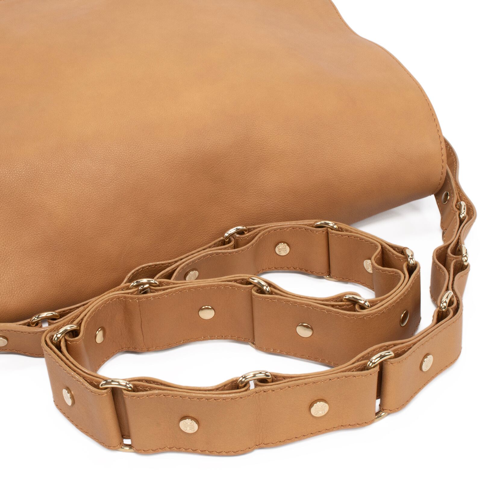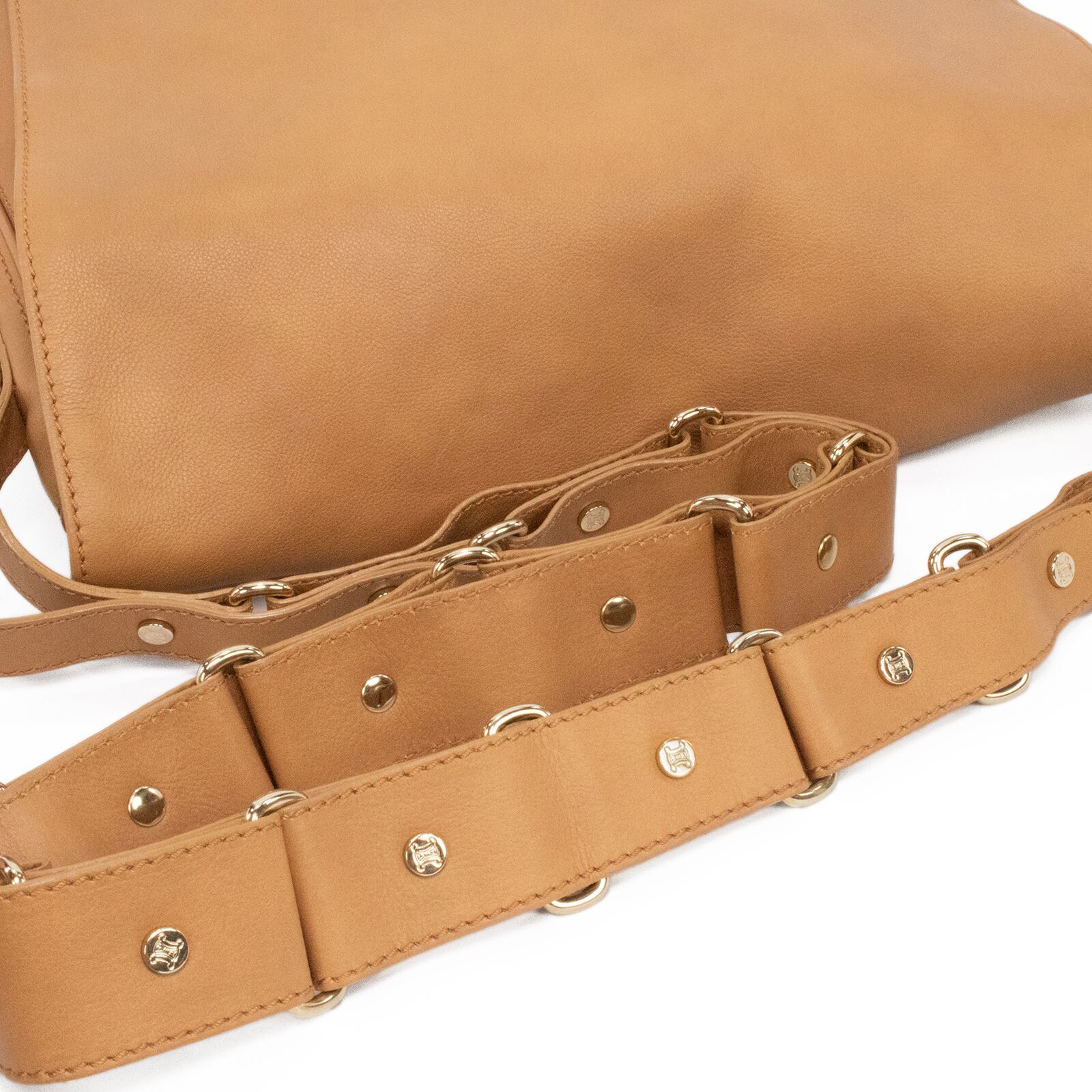 落ち着きのあるブラウンのレザーに、ブランドの象徴であるブラゾンが刻印されたスタッズがリズミカルに配置され、洗練された遊び心を感じさせます。