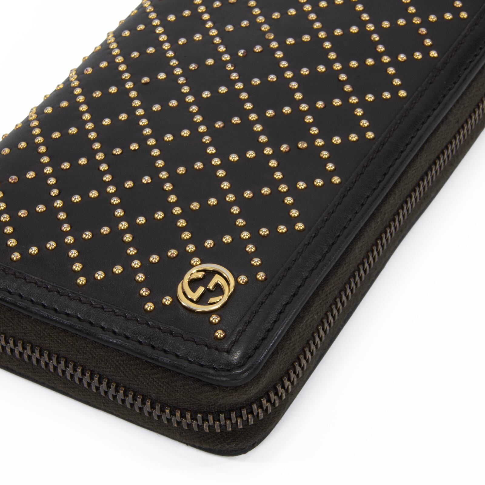 本物 送料無料 グッチ 長財布 ラウンドファスナー メンズ レディース 日本限定 ディアマンテ 茶色 ダークブラウン GGロゴ スタッズ G119