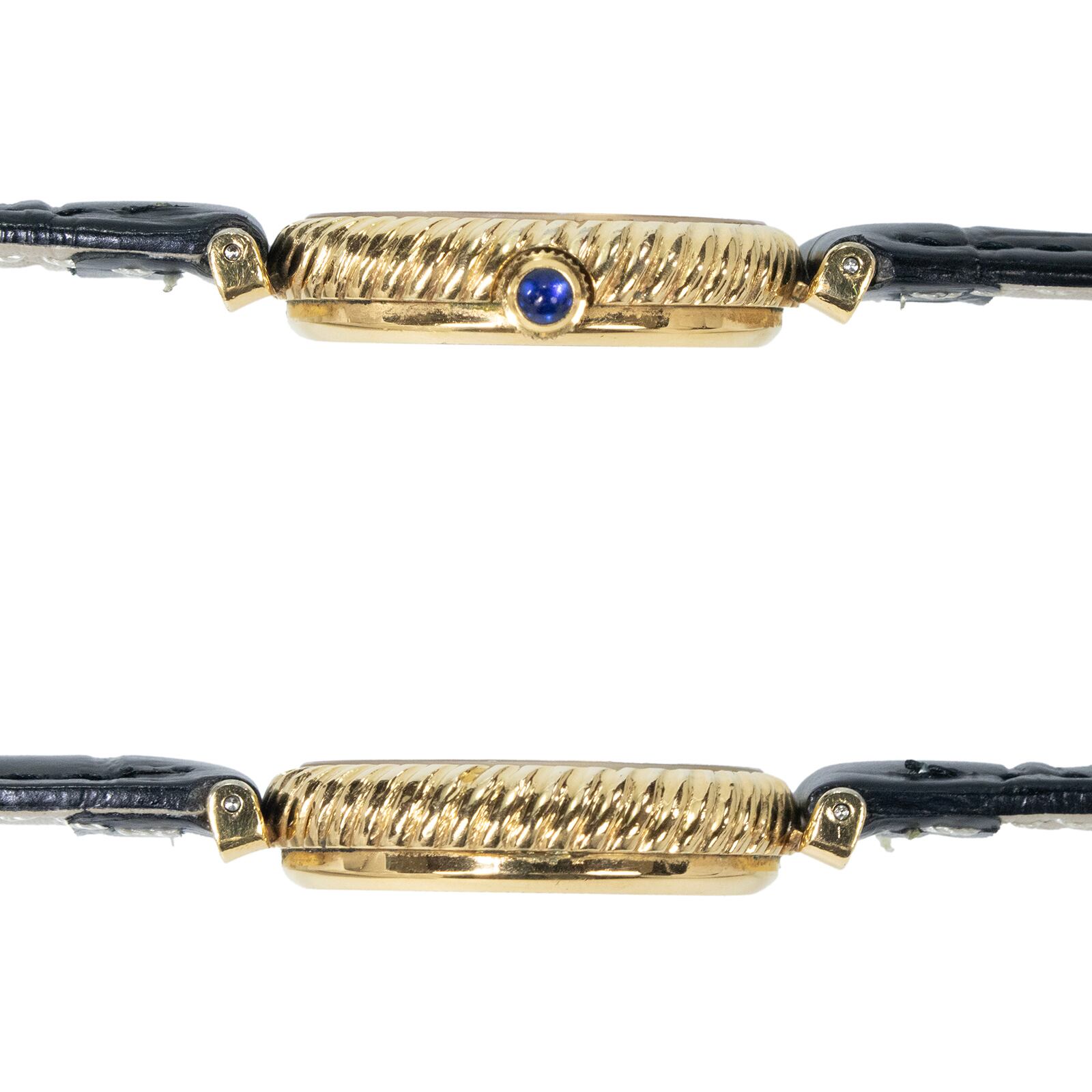 繊細な装飾が施されたゴールドのベゼルや、リューズにあしらわれたブルーのカボションが、宝飾品のような気品を添えております。