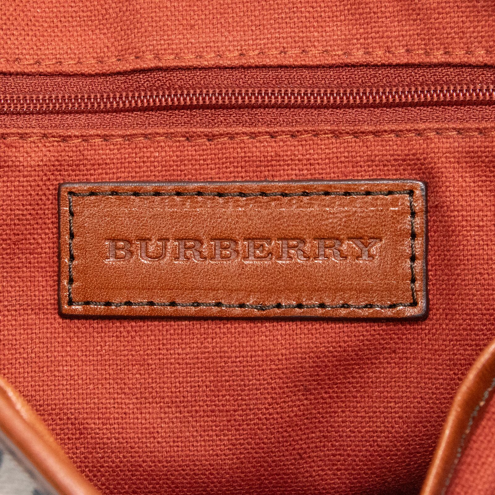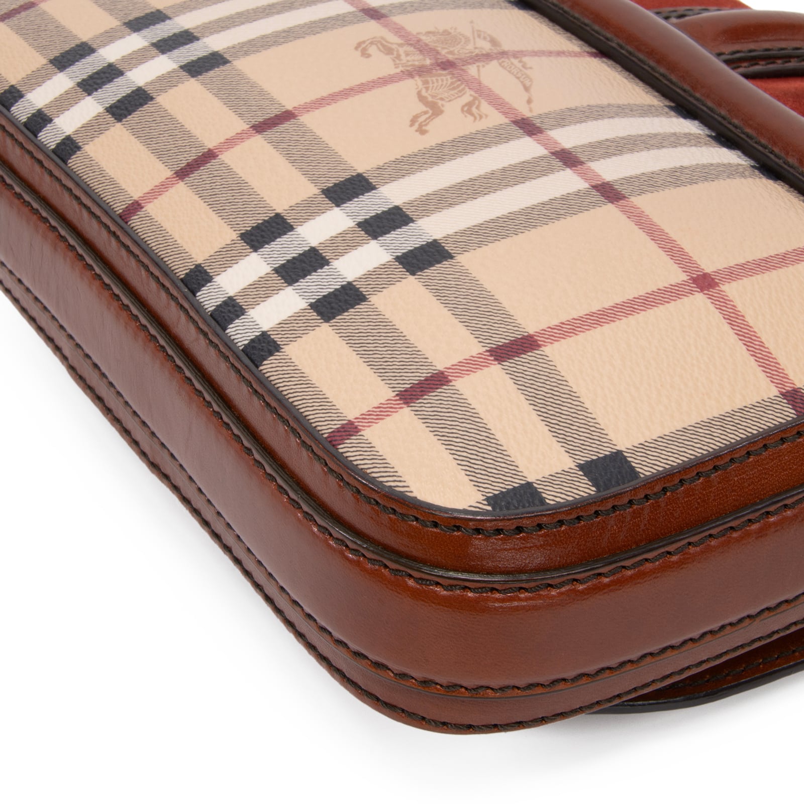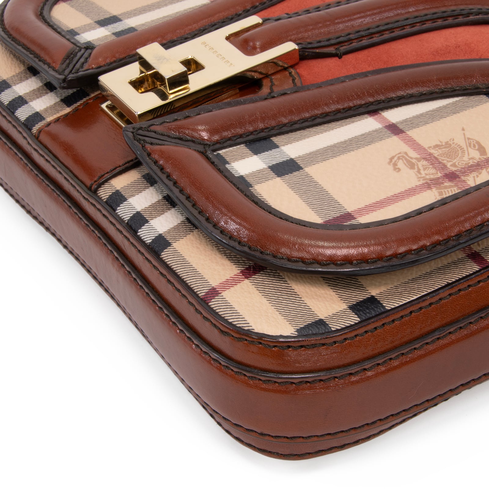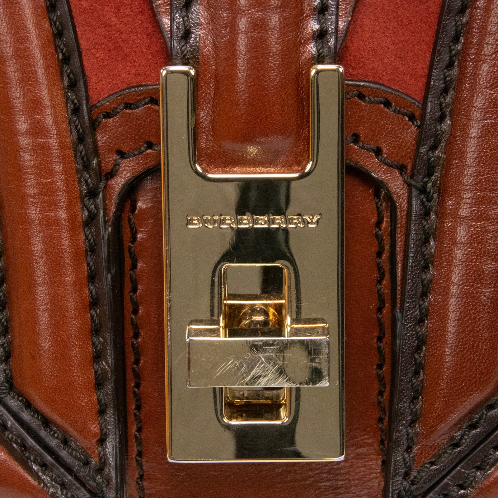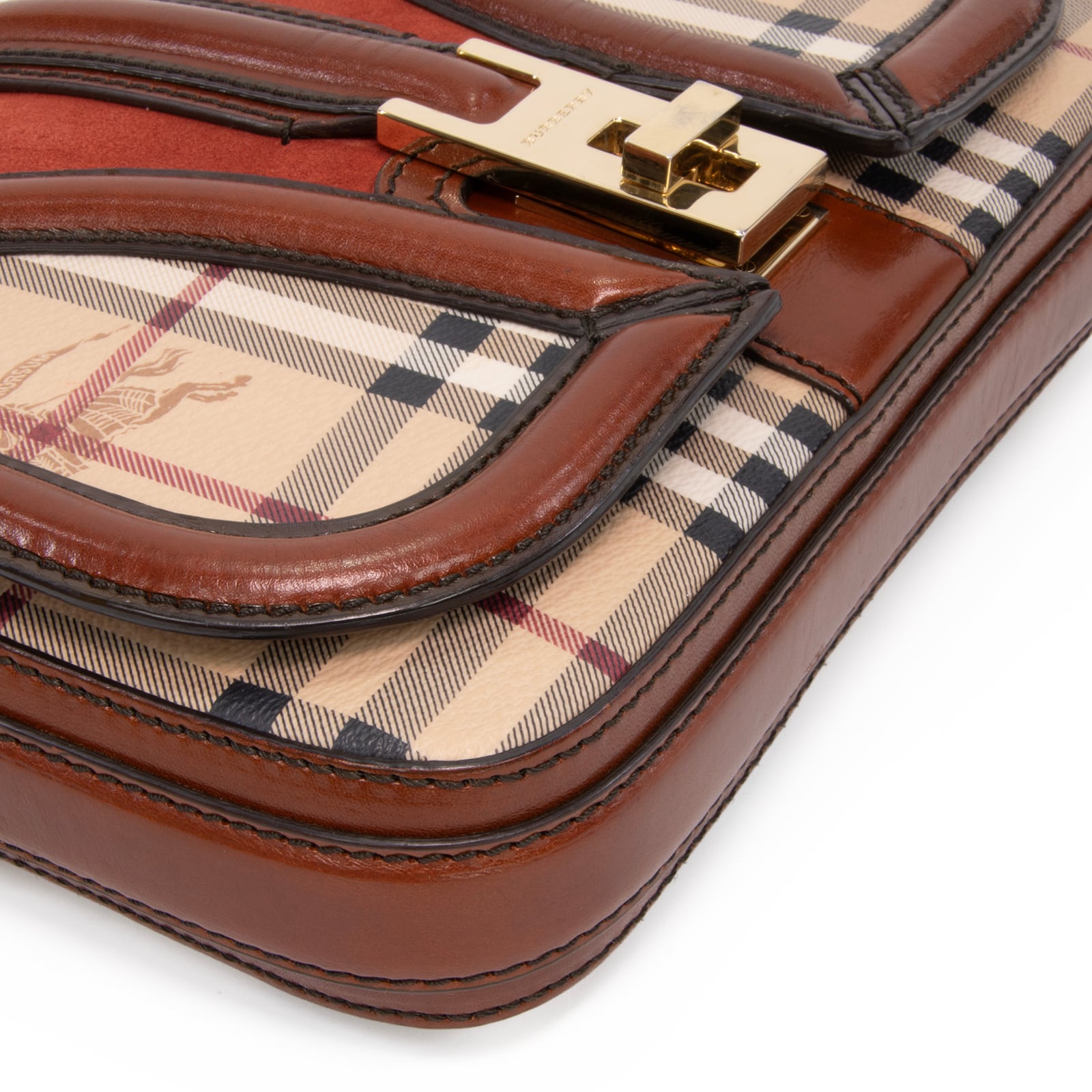 ブランドの象徴であるバーバリーチェックに、落ち着いたブラウン系のレザーと滑らかなレッド系のスエードを組み合わせた、大変美しいデザインが目を惹きます。