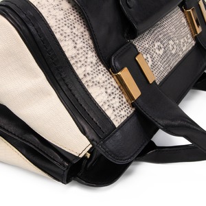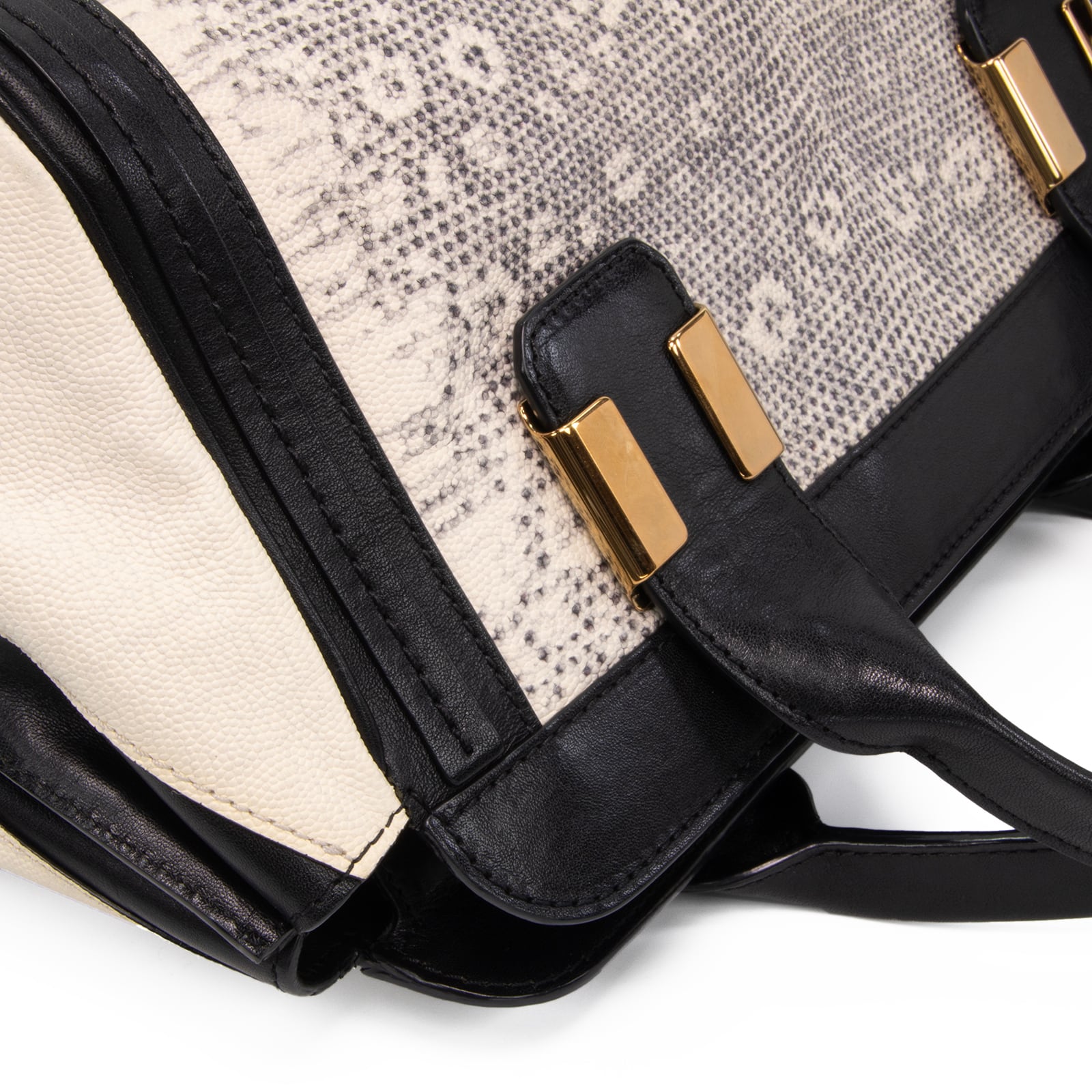 ブラックとオフホワイトの洗練された組み合わせに、エキゾチックなスネーク柄が配されたデザインは、唯一無二の存在感を放ちます。