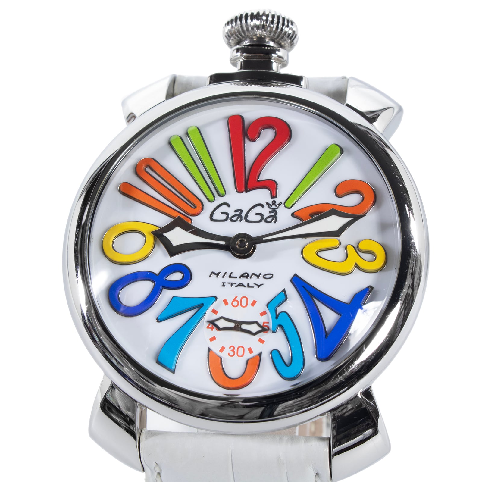 こちらはカラフルなインデックスが楽しい手巻き時計、ガガミラノの腕時計でございます。