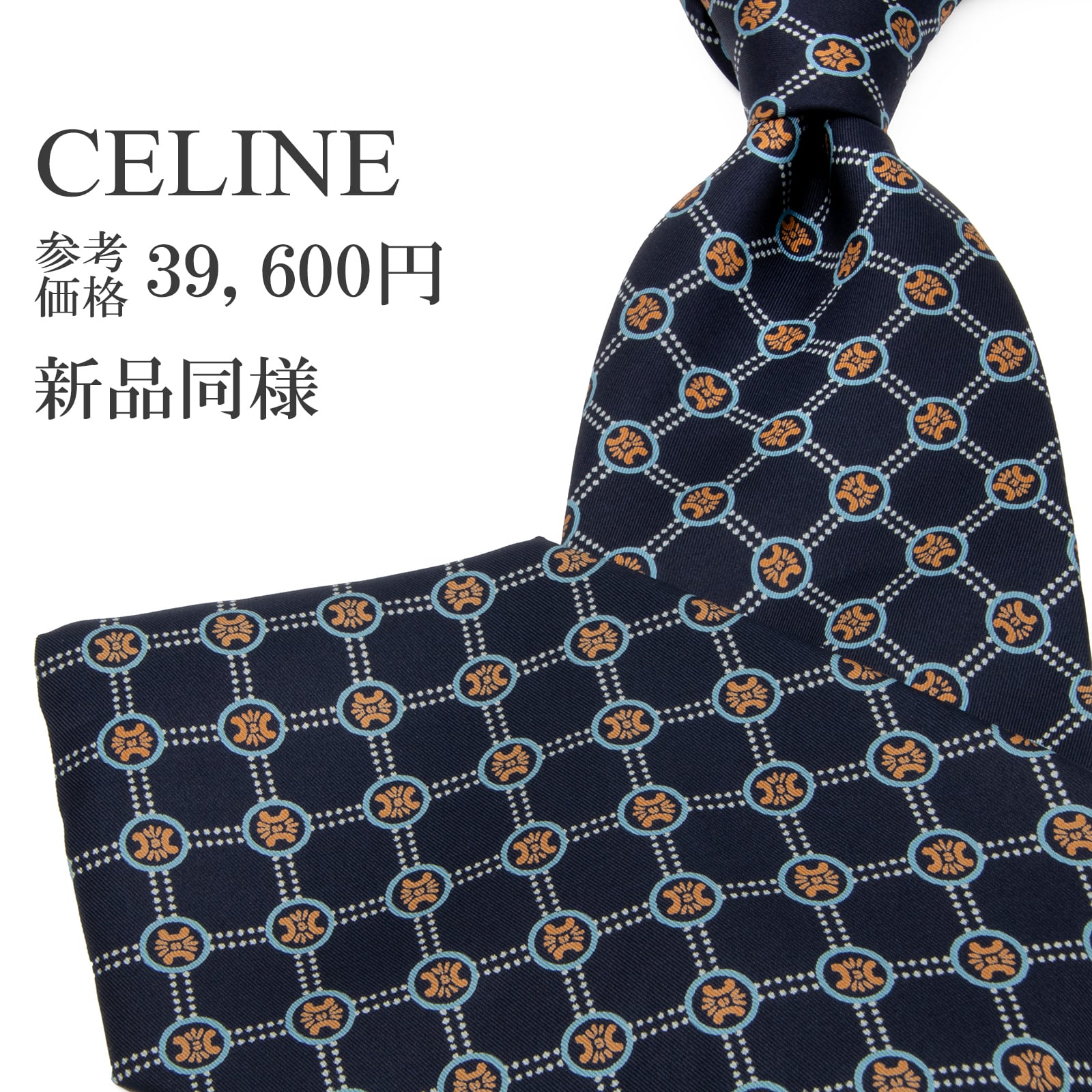 送料無料 セリーヌ ネクタイ 新品同様 シルク ネイビーブルー 茶色 水色 グレー マカダム ブラゾン ロゴ マーク サークル ブランド P360
