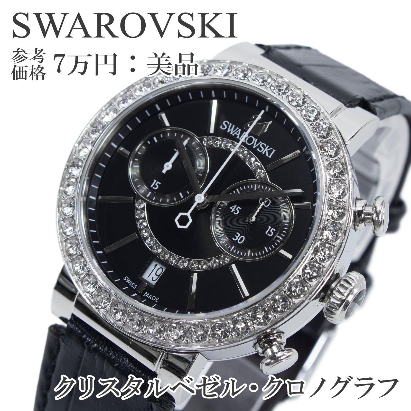 特徴:クロノグラフ・スモセコ・クリスタルベゼル・派手・目立つ・ロゴ・マーク・革ベルト・革バンド・ブランド・珍しい・人気・おしゃれ