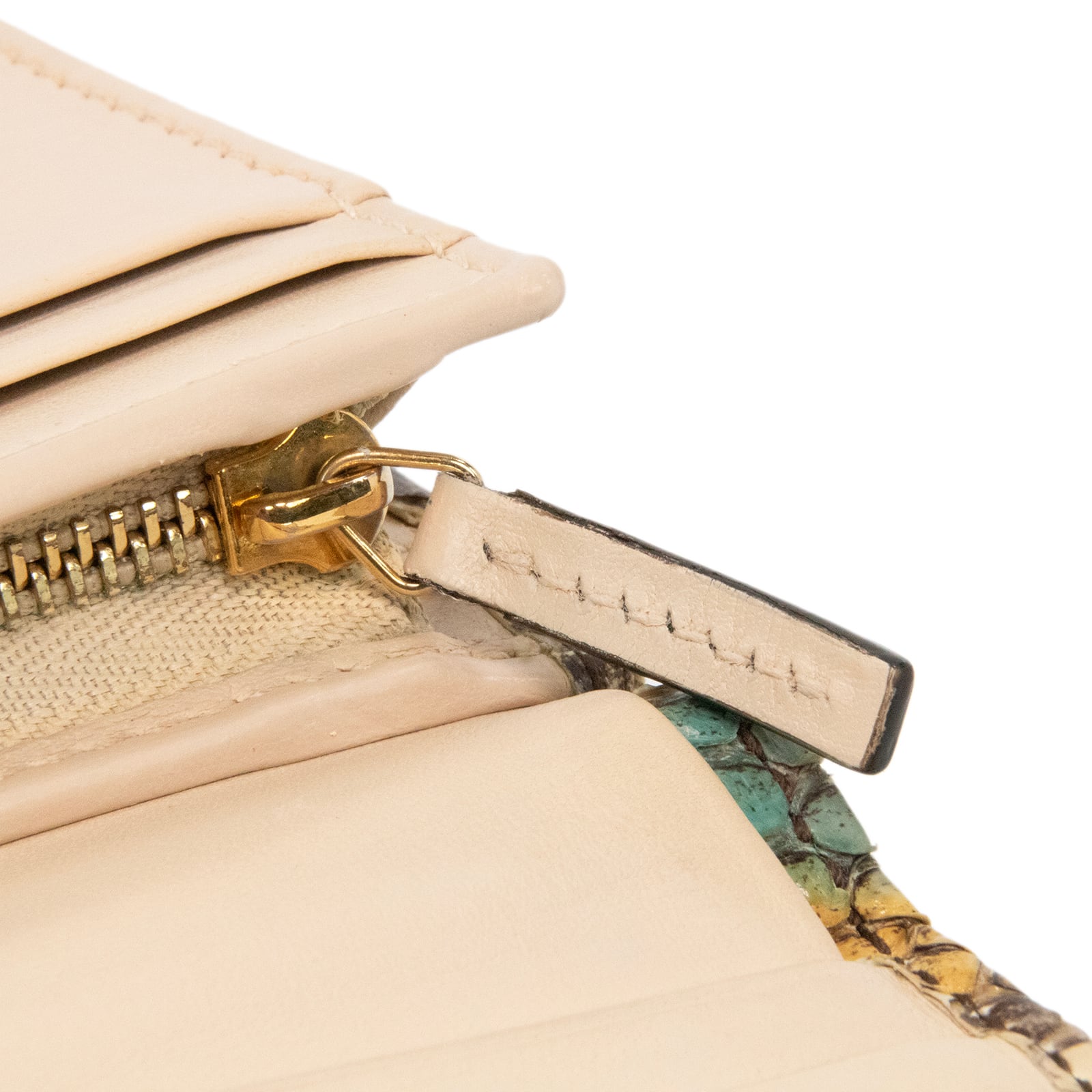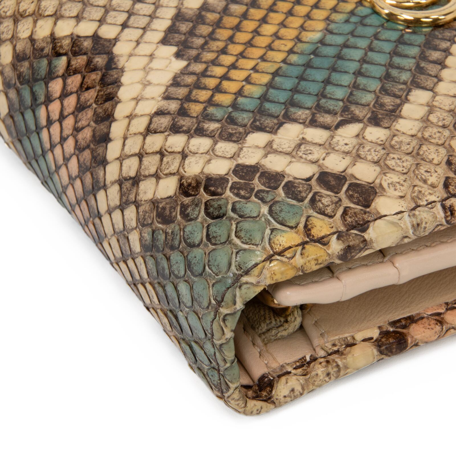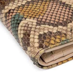 生命の息吹を感じさせるようなリアルな質感のパイソンレザーを贅沢に用い、ベージュやグリーン、イエローなどが織りなす色彩は、まさに自然が生んだ芸術ともいえる佇まいでございます。