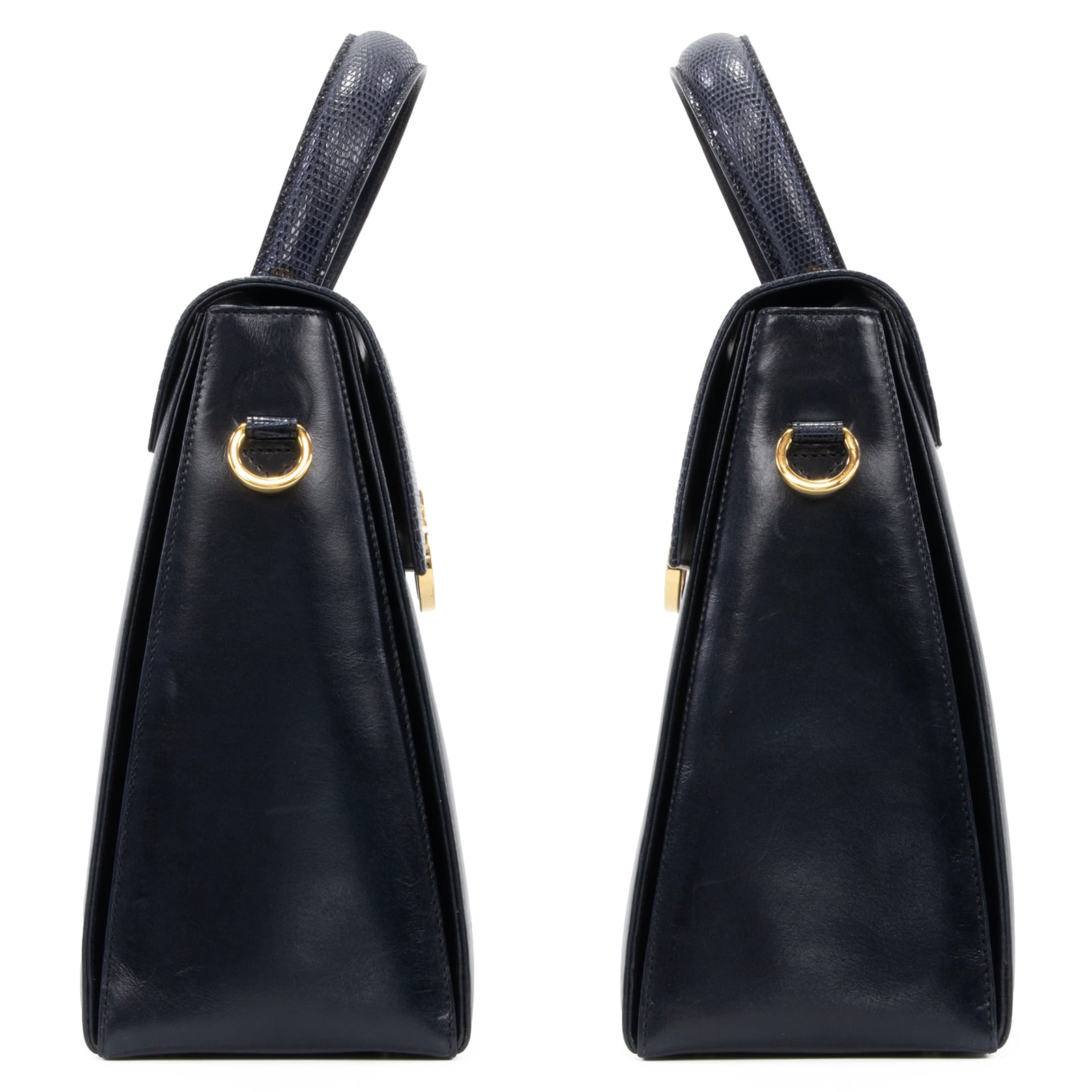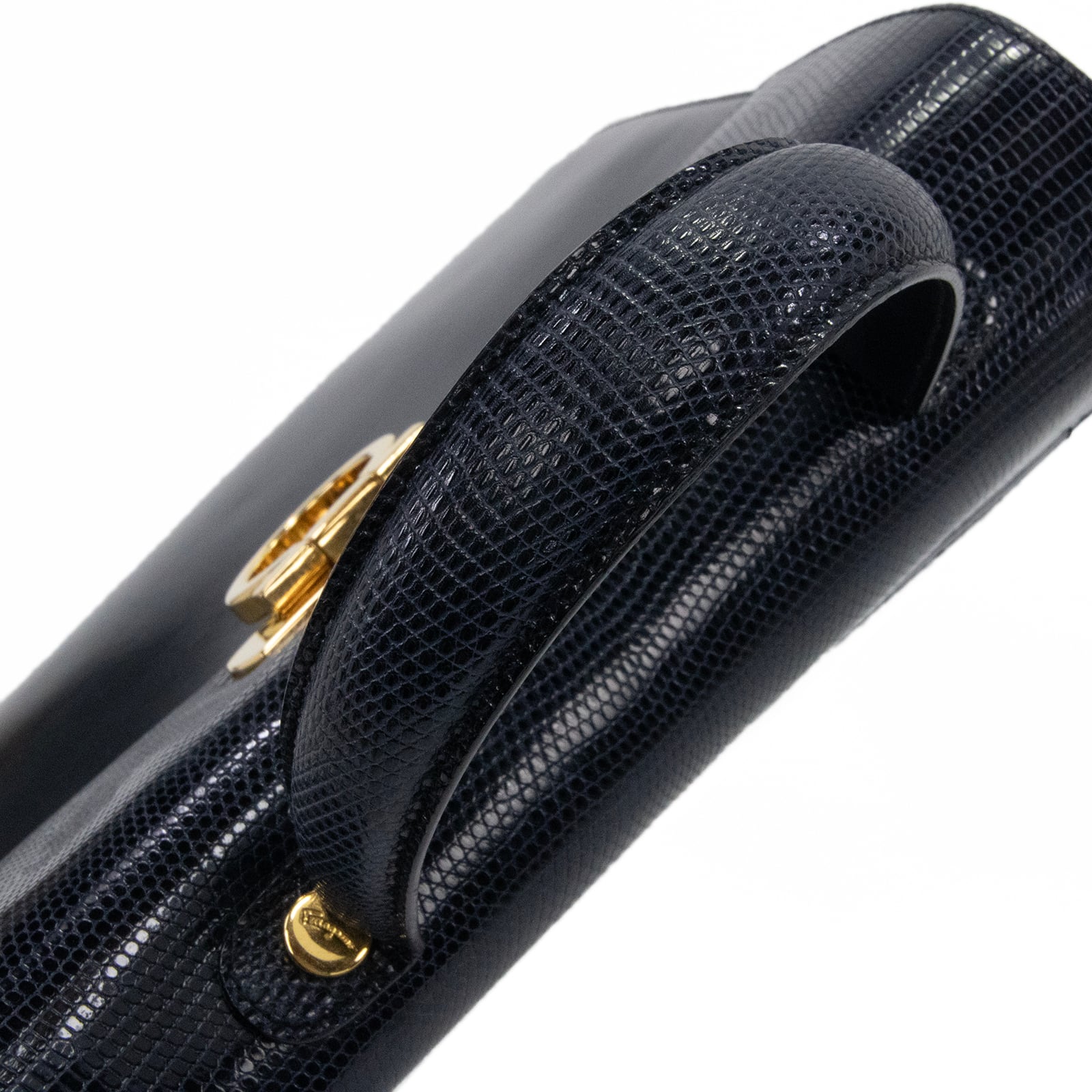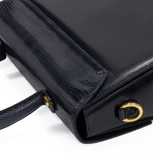 深みのあるネイビーブルーのカーフスキンに、リザード型押しレザーを組み合わせた、大変美しいデザインが目を惹きます。