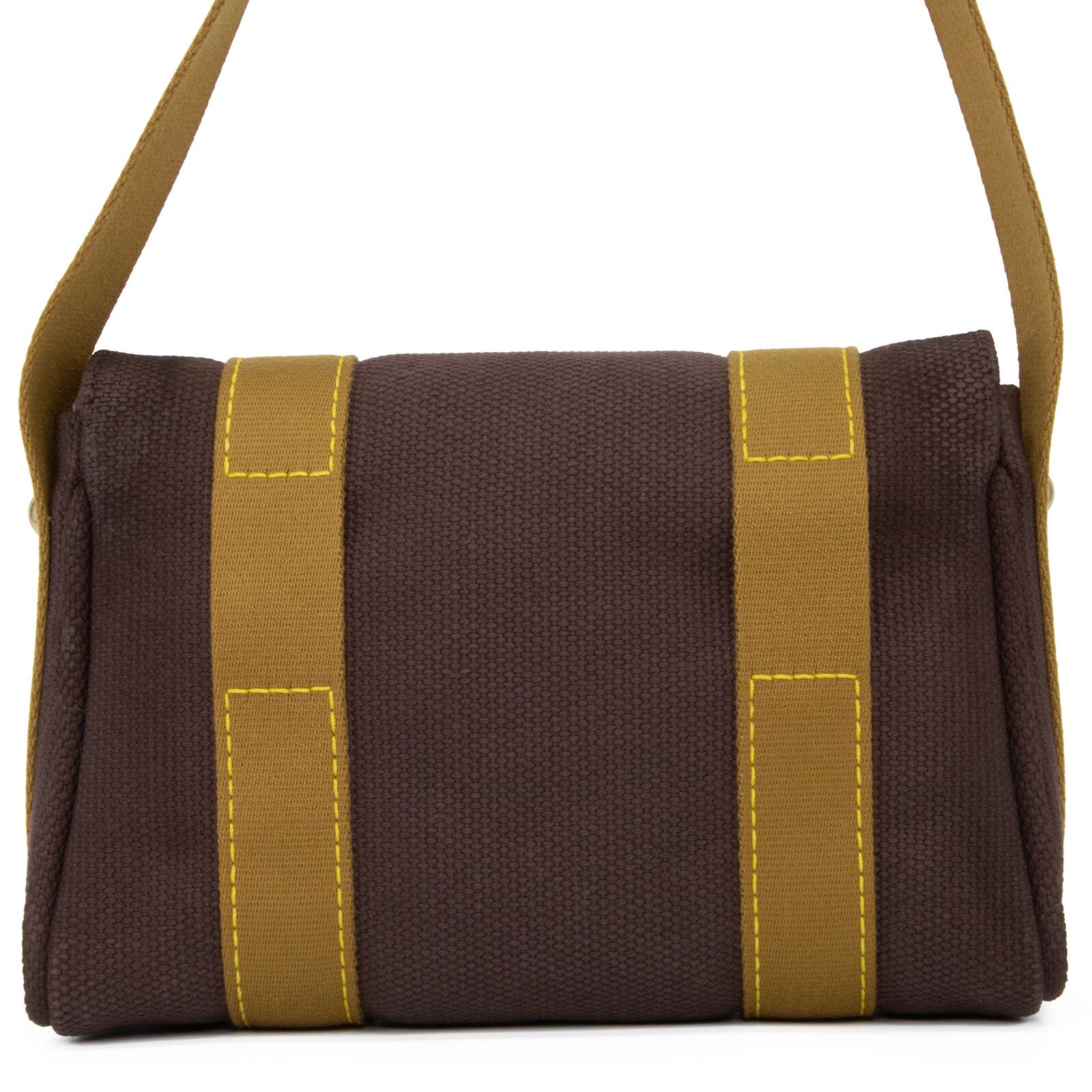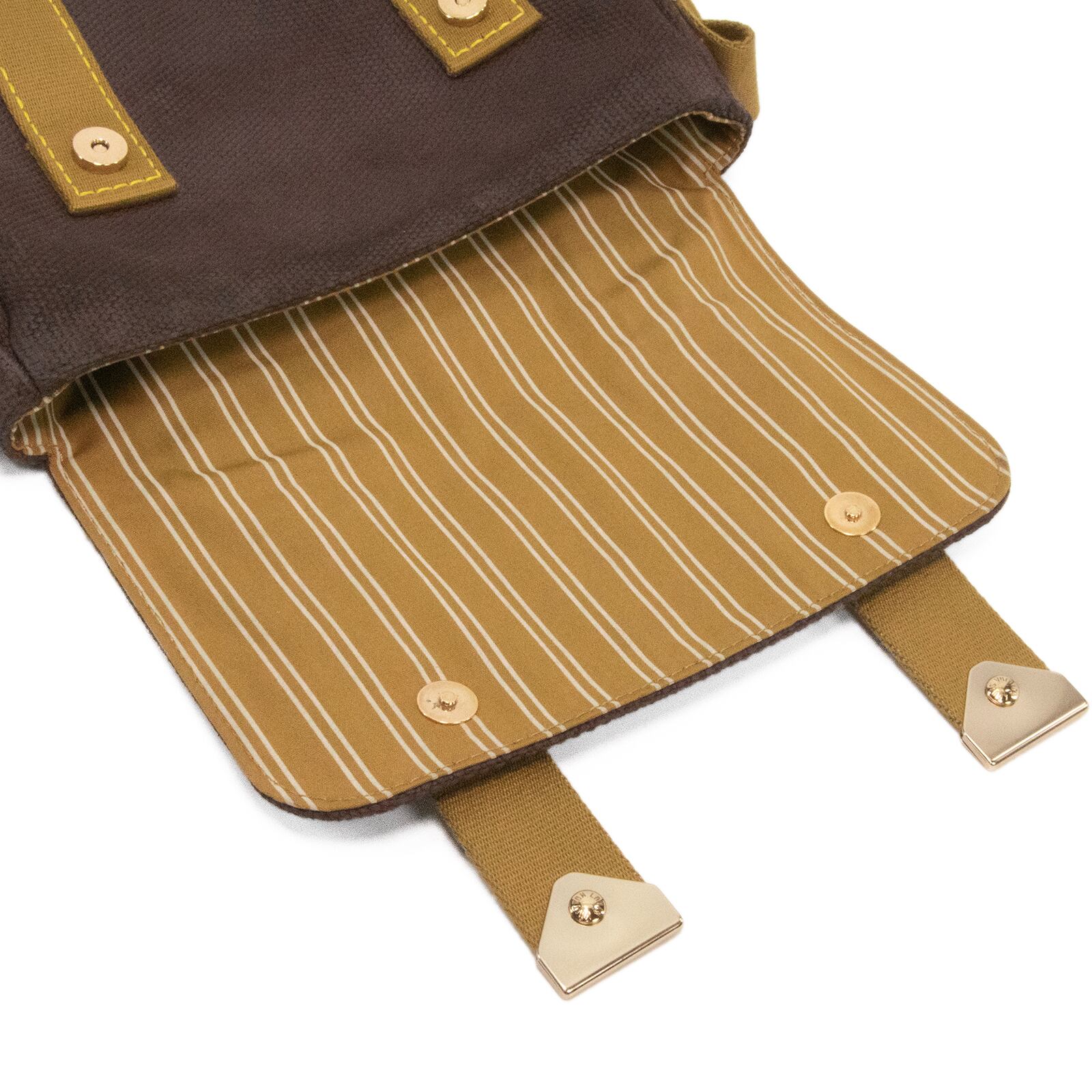 落ち着きのあるダークブラウンのキャンバス地に、ゴールド系のストラップとスタッズが輝きを添える、大変希少な逸品でございます。
