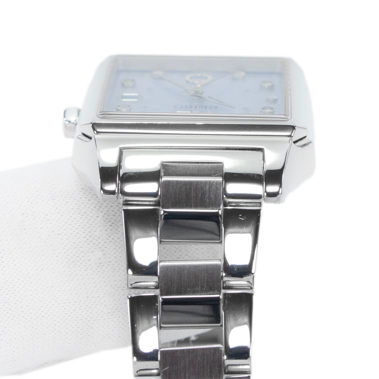 知的なスクエアケースに、淡い水色の文字盤がセットされました。