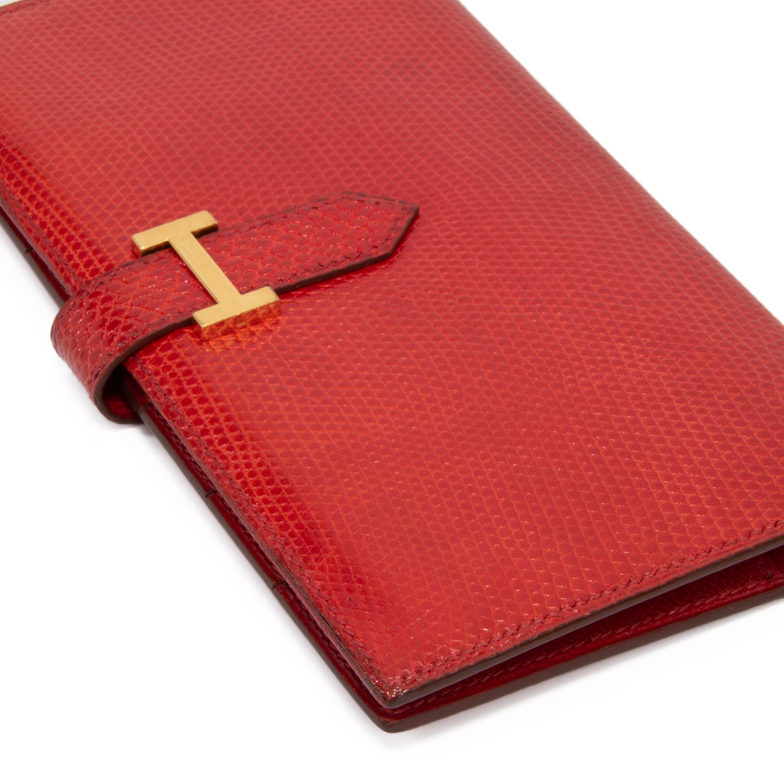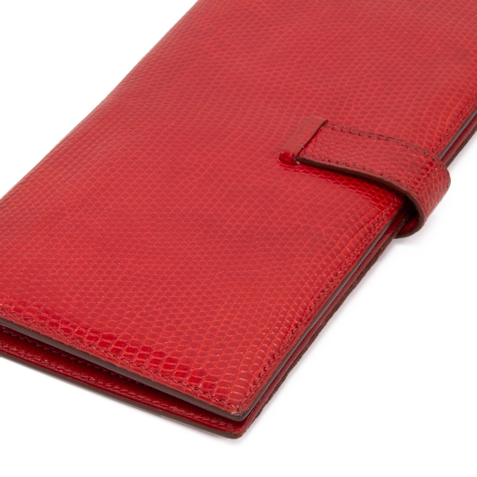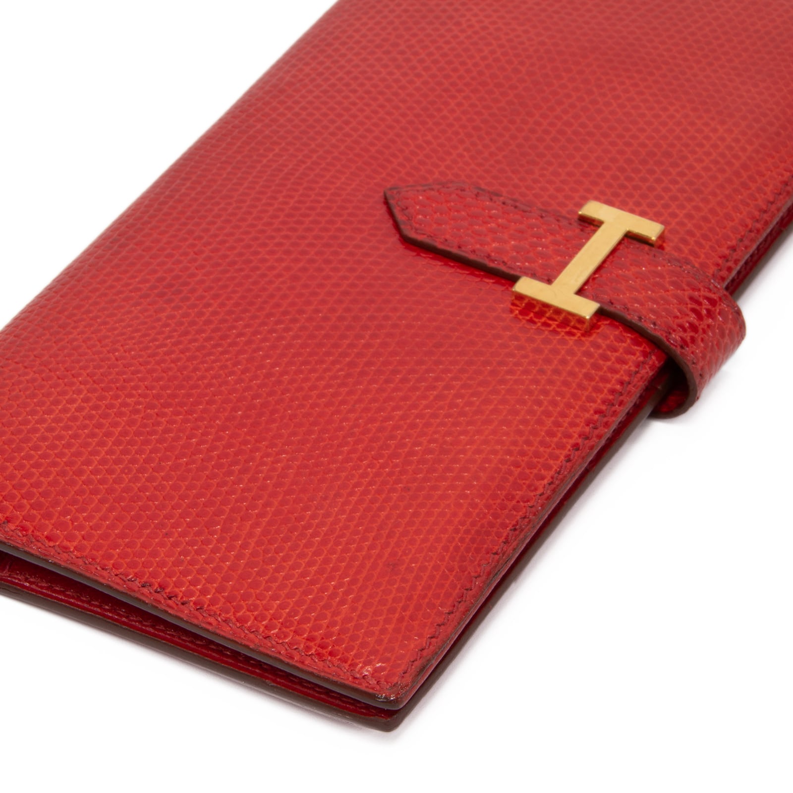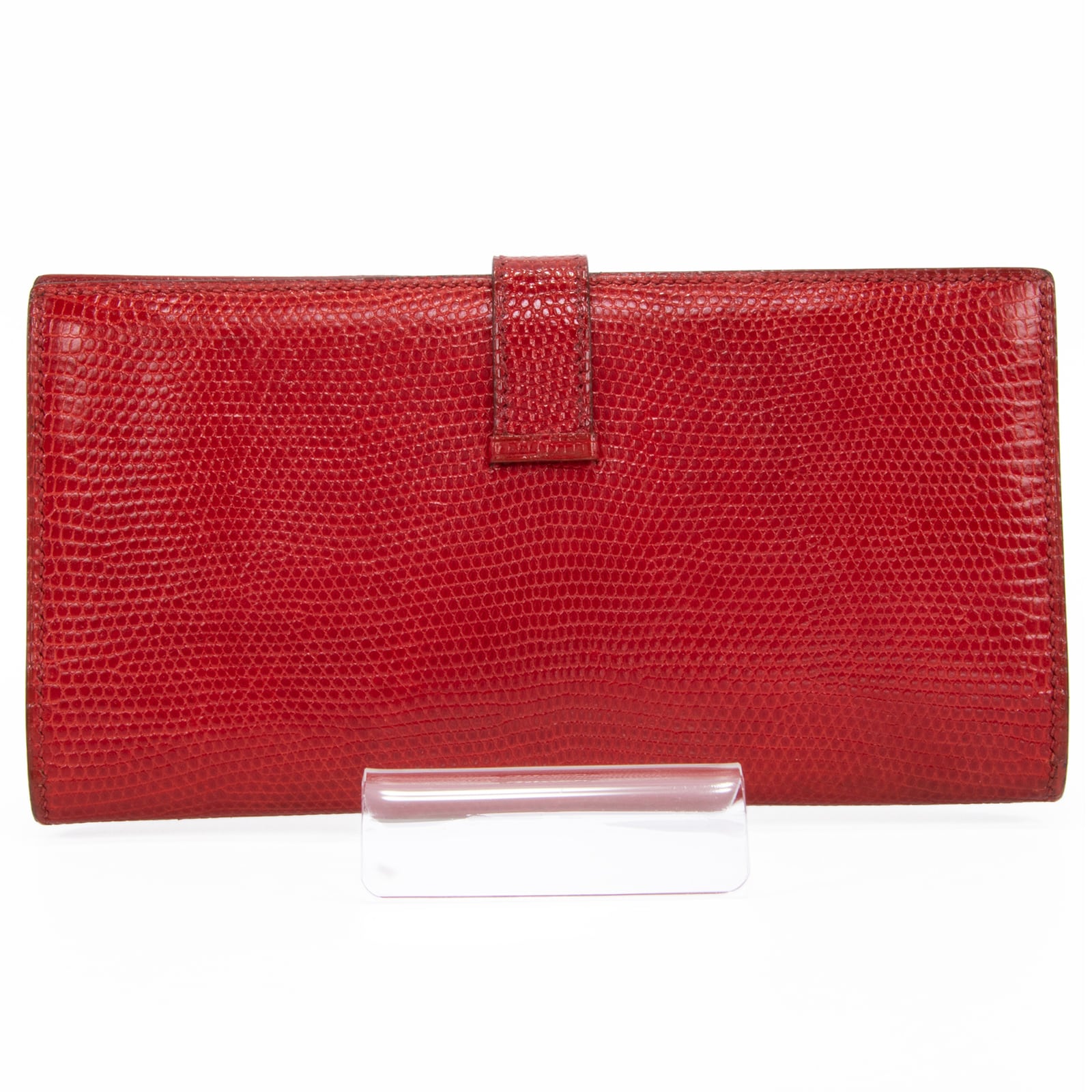 本物 送料無料 エルメス 長財布 二つ折り財布 見開きタイプ レディース リザード ベアン クラシック ヴァーミリオン 赤 レッド 珍しい 最高級 トカゲの革 エキゾチックレザー スリム スマート Hゴールド金具 小銭入れあり ハイブランド おしゃれ D196