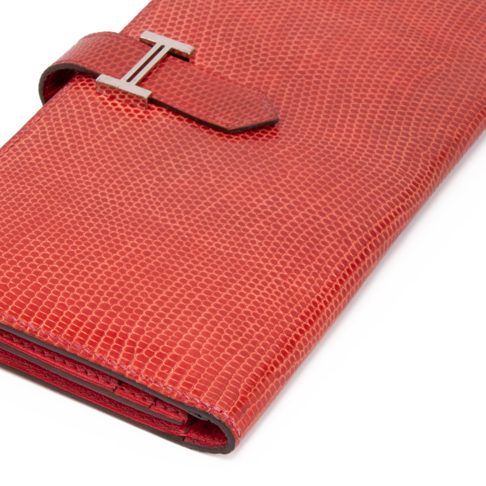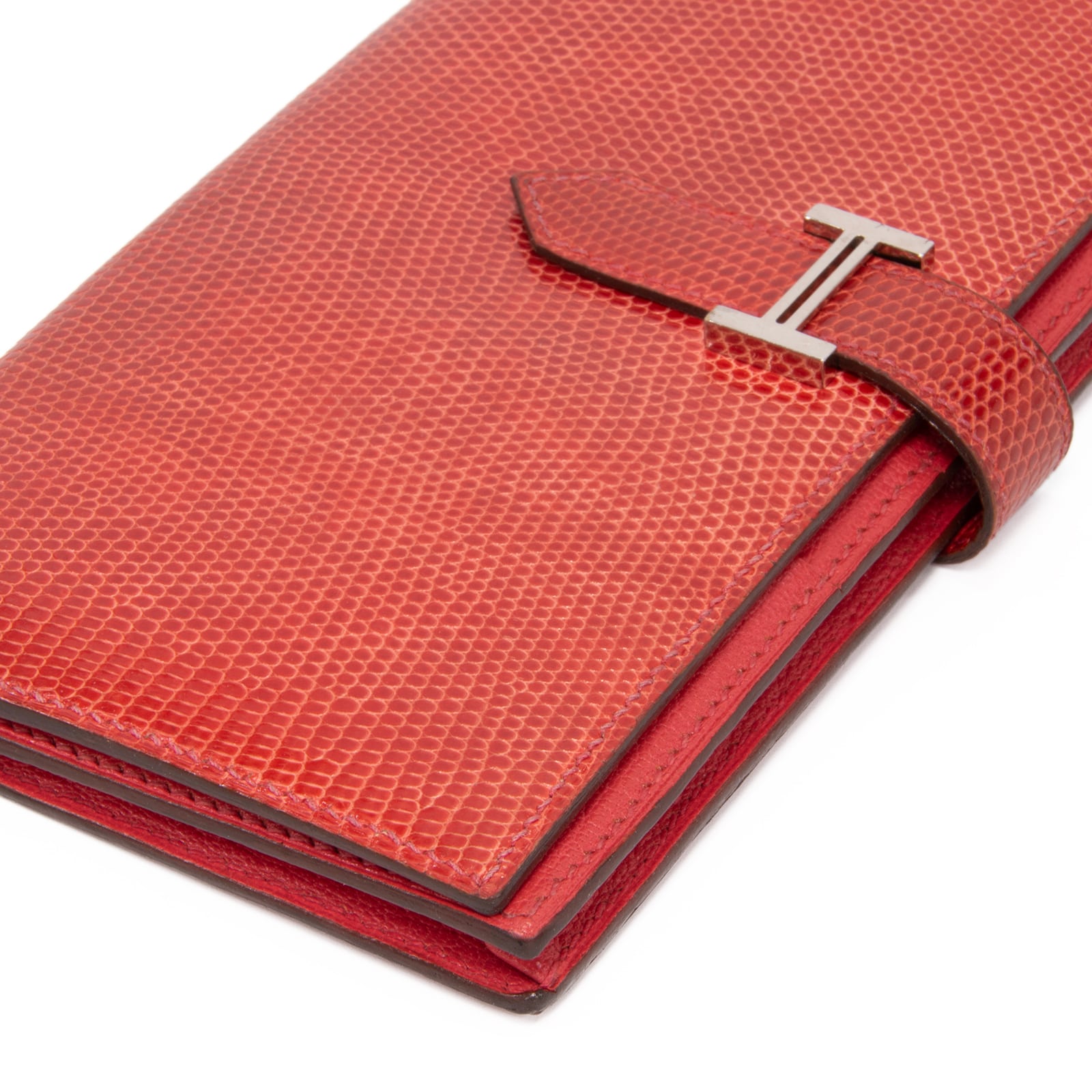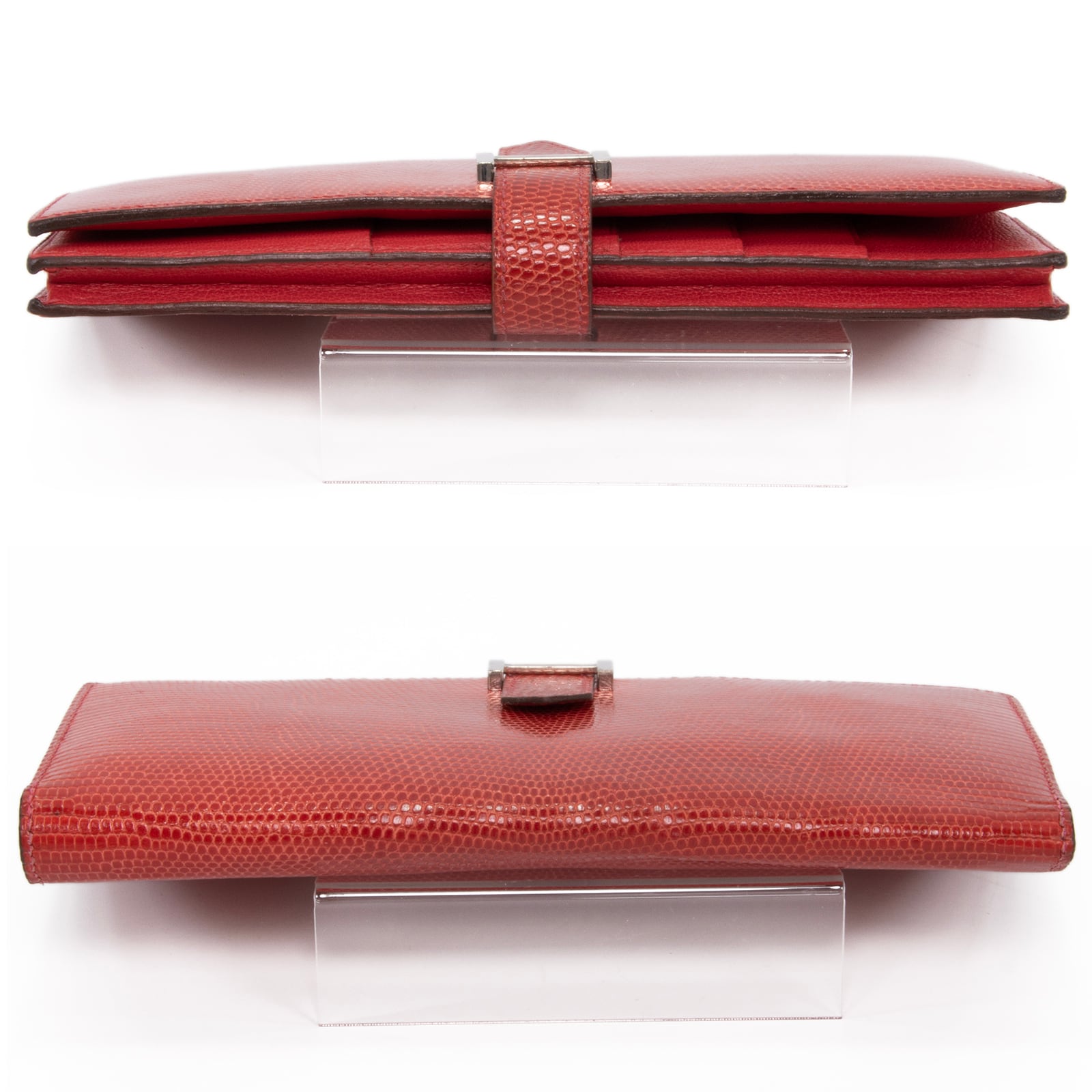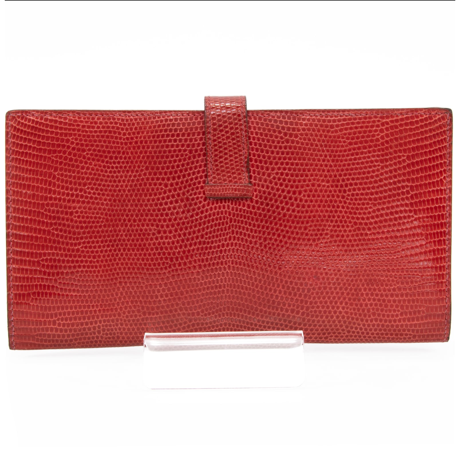 本物 送料無料 エルメス 長財布 二つ折り財布 レディース リザード ベアン スフレ ポピーレッド トカゲの本革 綺麗 Hシルバー金具 D197