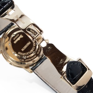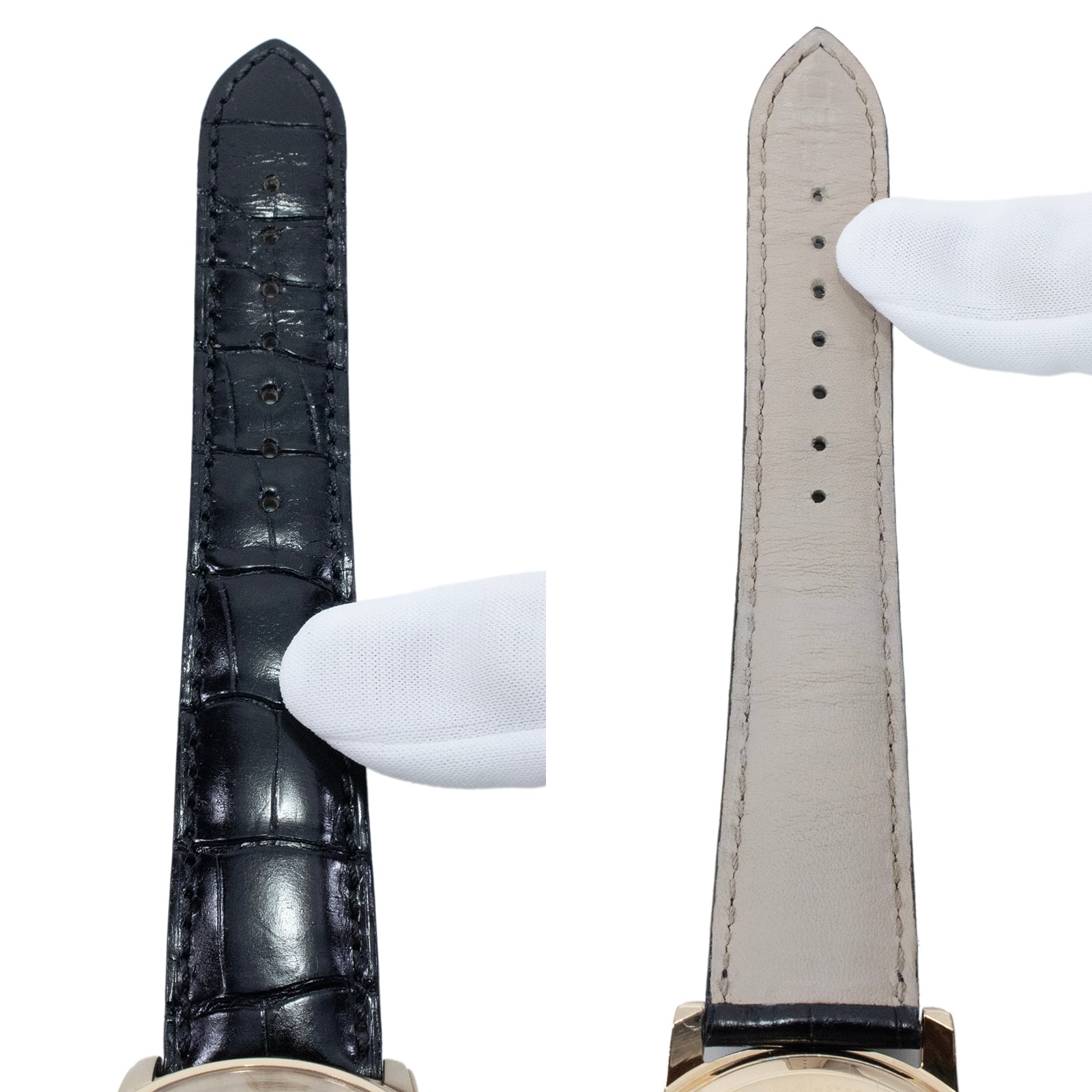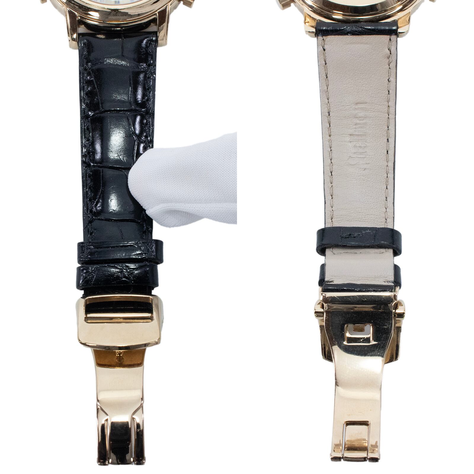 ピンクゴールドのケースと純正アリゲーターのベルトが、その知的なデザインに格調高い色気を添えます。
