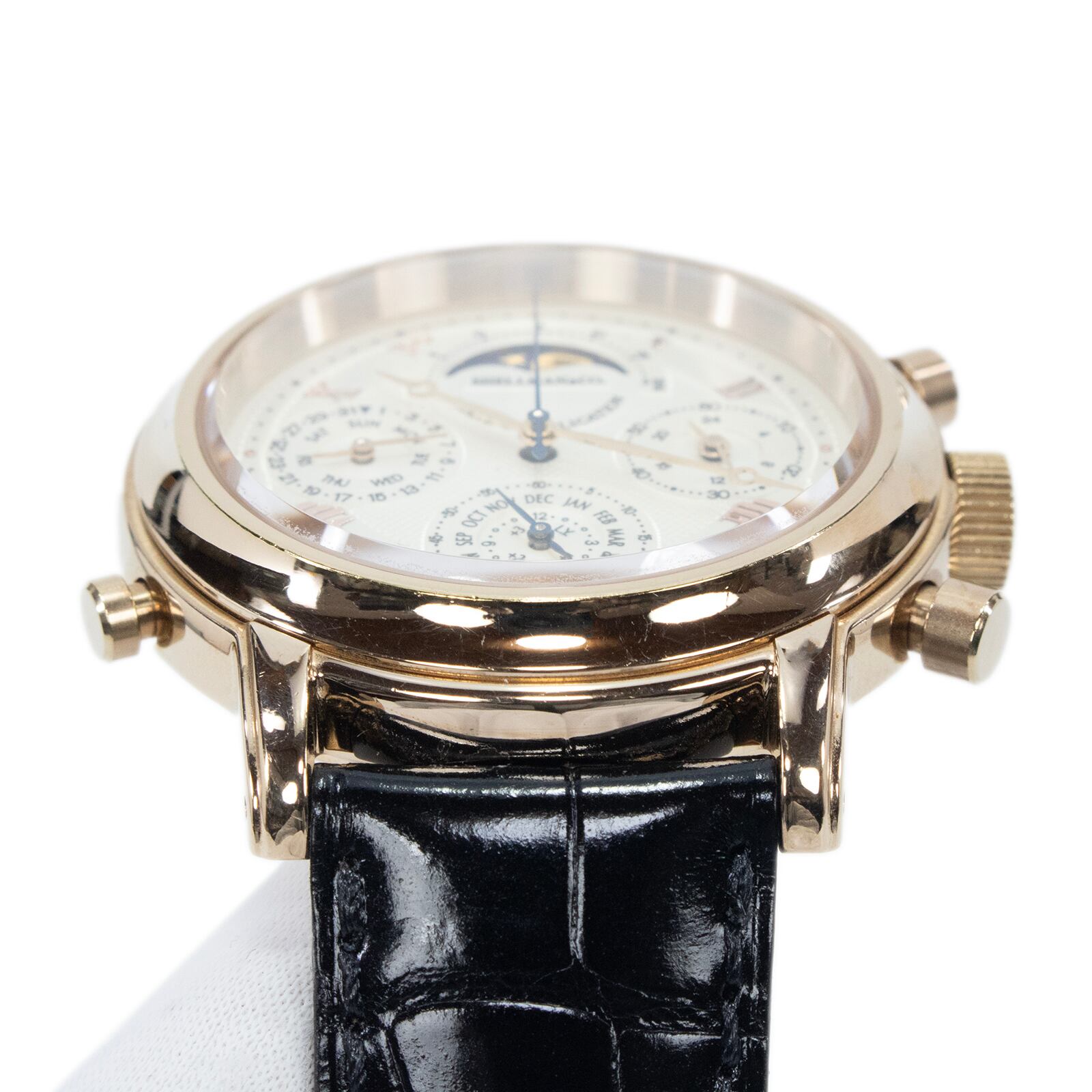 このメタリックホワイトの文字盤には、ムーンフェイズ、永久カレンダー、クロノグラフ、そしてミニッツリピーターという四大複雑機構が集約されております。